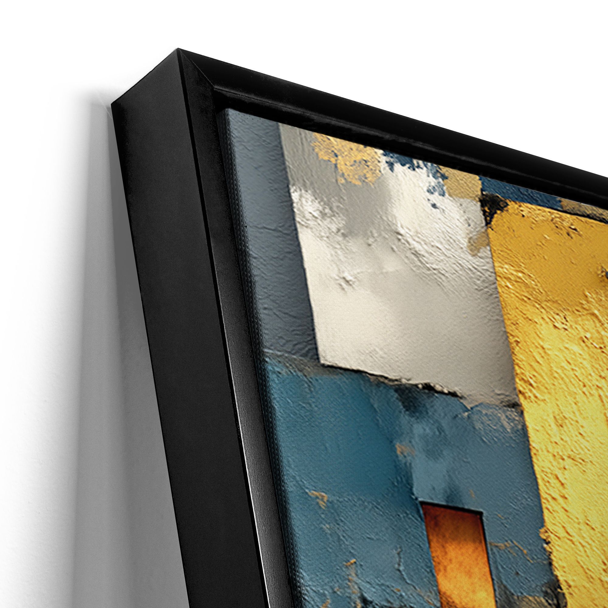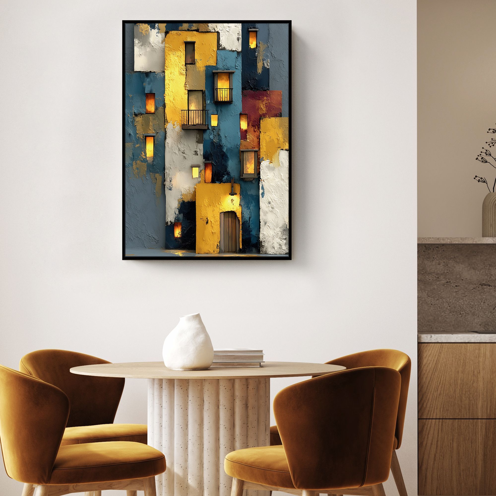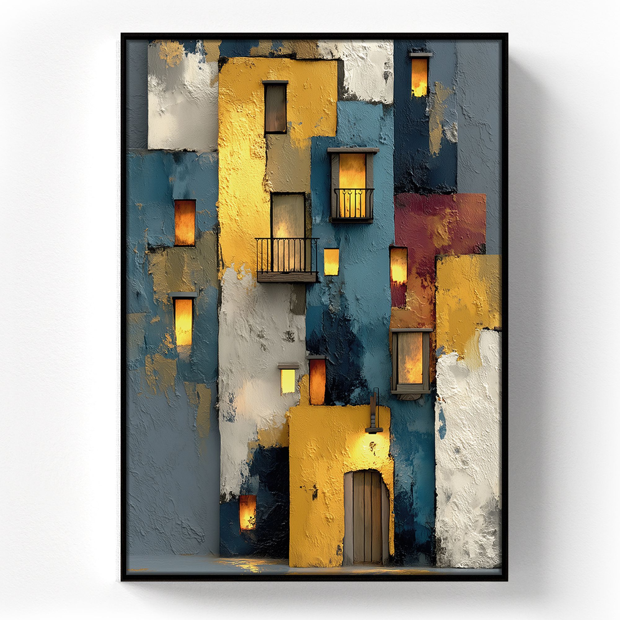 Картина изображает фасад необычного многогранного дома, где традиционная архитектура переплетается с элементами абстракции. Основные цвета – глубокие синий и бирюзовый, теплый золотисто-желтый и бежевый, создают приятный контраст, внося ощущение уюта. Фактура краски придает пластичность стенам здания, создавая впечатление объемности и реалистичной шероховатости поверхности. Узкие окна с мягко светящимся внутренним освещением и небольшие балкончики добавляют композиции элемент загадочности и теплоты, словно раскрывая атмосферу тихого вечера в глубине города. Рамка, выполненная в строгом черном цвете, лаконично обрамляет картину, подчеркивая её характер и помогая сосредоточить внимание на деталях и цветовых переходах. Это произведение стильно впишется как в современный интерьер, так и в более классические пространства, привнося в них особую гармонию и визуальный интерес. Картина отличается балансом между реализмом и художественной условностью, создавая ощущение живого, дышащего пространства, к которому хочется прикоснуться и заглянуть в каждое окно.