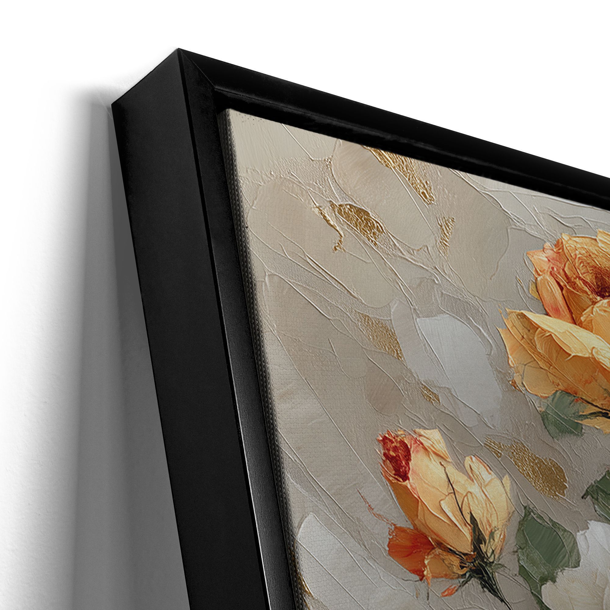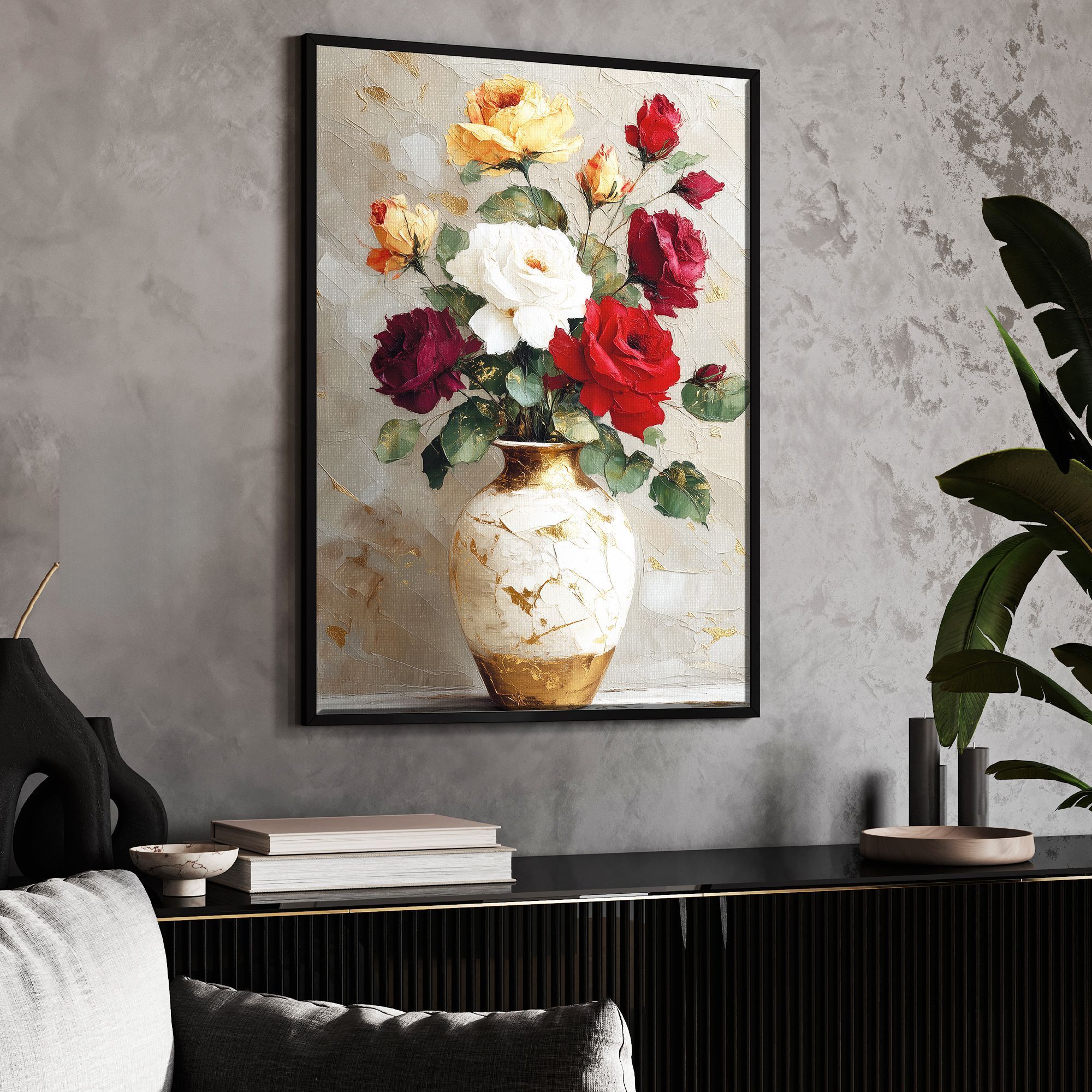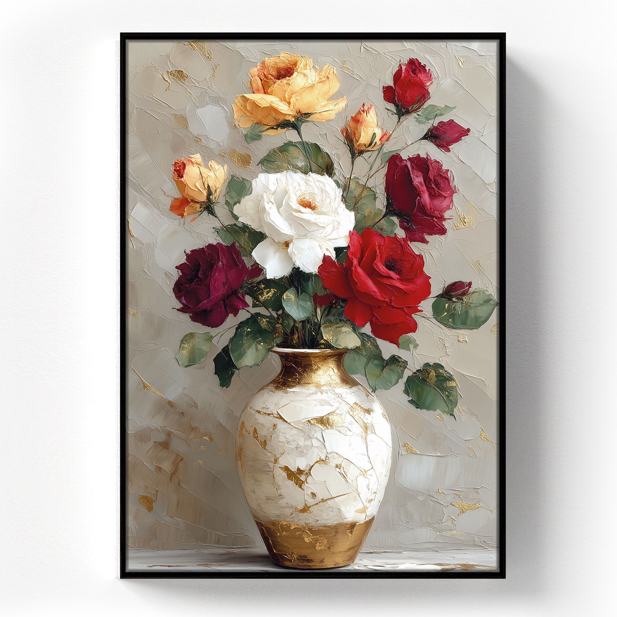 Перед вами изысканная картина, на которой изображён букет пышных роз в изящной вазе, выполненный в технике густого фактурного мазка. Разнообразие оттенков — от нежных персиковых и белоснежных до глубоких бордовых и ярко-красных — создаёт живую и гармоничную композицию, символизирующую красоту, страсть и нежность одновременно. Фон работе придаёт особую глубину благодаря мягким бежево-серым тонам с вкраплениями золотистых акцентов, которые словно подсвечивают букет, добавляя ощущение роскоши и тепла. Техника импасто подчёркивает трехмерность изображения, делая цветы почти осязаемыми и живыми. Тонкая чёрная рама аккуратно обрамляет картину, сохраняя баланс между современным стилем и классической эстетикой. Эта работа станет эффектным украшением интерьера, наполняя пространство утончённостью и вдохновляя наслаждаться гармонией природы и искусства.