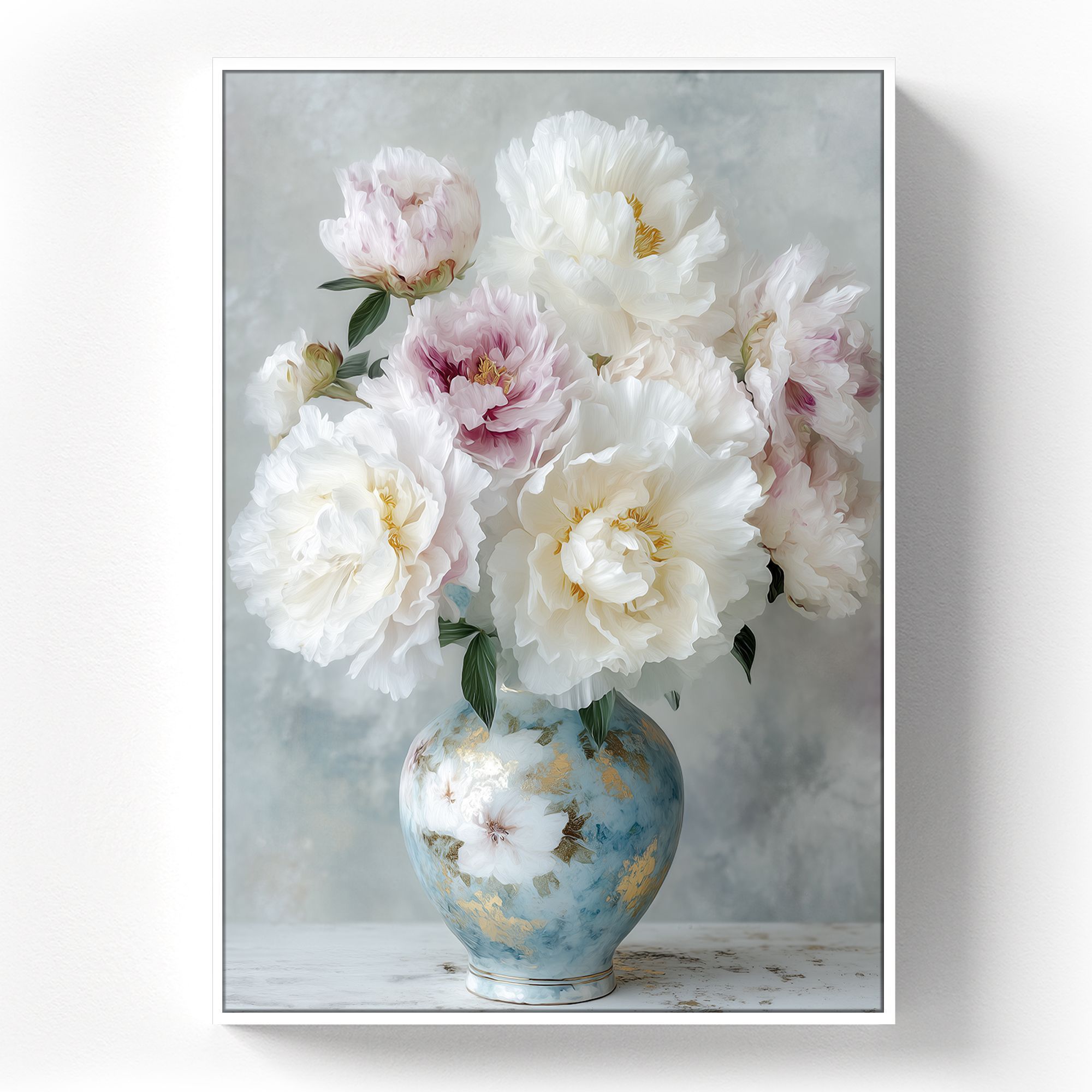 Перед вами утончённое и воздушное изображение нежного букета пионов, воплощённое с филигранным мастерством. Пышные белоснежные и слегка розоватые цветы словно наполнены светом и лёгкостью, создавая атмосферу спокойствия и благородной чистоты. Их мягкие лепестки мельчайшими штрихами передают естественную текстуру и объём, заставляя цветы оживать на холсте. Ваза, украшенная изящным узором в пастельных голубых и золотистых тонах, дополняет композицию, напоминая о хрупкости и красоте природы. Фон выполнен в приглушённых серо-голубых оттенках, которые подчёркивают свежесть и изящество букета, не отвлекая внимание от главного объекта. Эта картина станет воплощением гармонии и элегантности в любом интерьере, добавляя в пространство нотки мягкости и вдохновения. Идеальный акцент для создания атмосферы уюта и тонкой эстетики.
