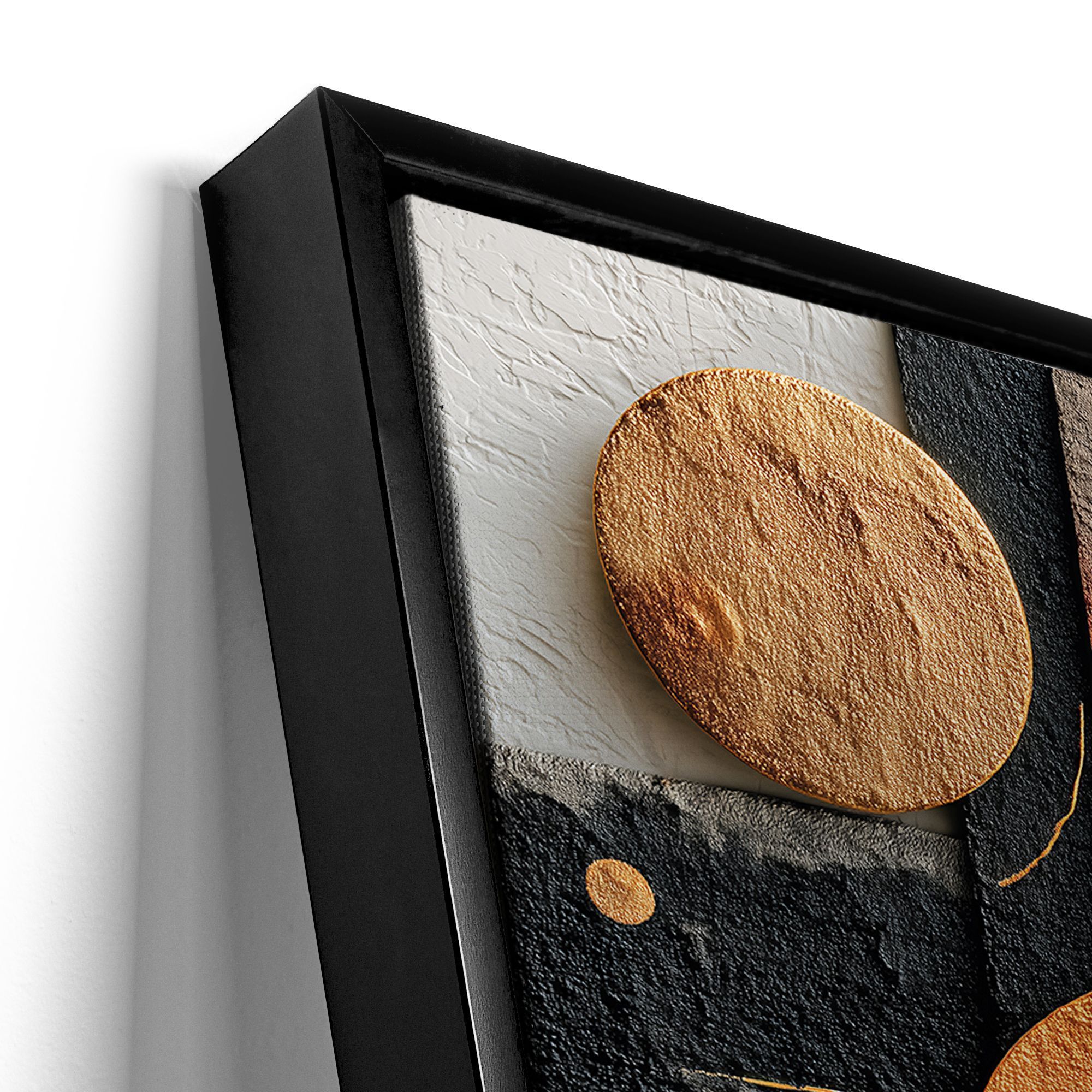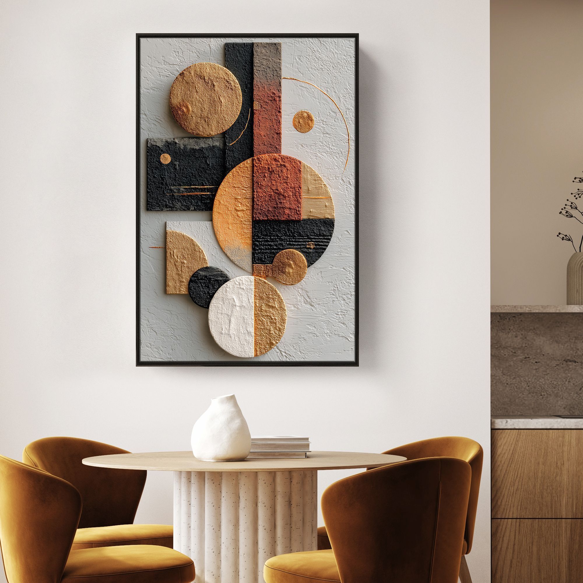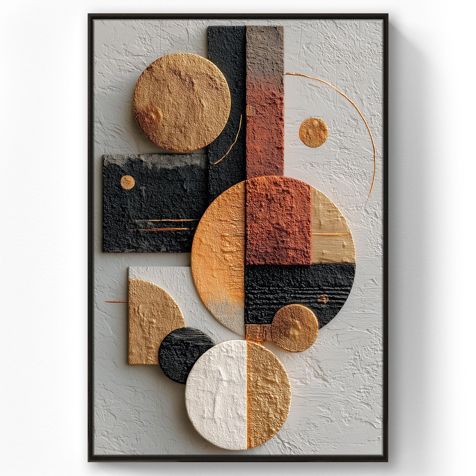 Перед вами изысканное произведение абстрактного искусства, выполненное в стиле минимализма с элементами геометрической композиции. Картина сочетает в себе множество текстурных решений, создавая ощущение глубины и тактильности — рельефная поверхность добавляет работе живости и динамичности. Доминируют теплые оттенки охры, терракоты и золотистого, гармонично сочетающиеся с контрастным глубоким черным и нежным белым. Главные элементы — круги и прямоугольники, размещённые в сбалансированной композиции, символизируют единство противоположностей и цикличность жизни. Полукруги и линии придают работе плавность и легкость. Эта картина станет ярким акцентом в современном интерьере, привнеся атмосферу гармонии, тепла и элегантности. Она идеально подходит для тех, кто ценит сочетание простоты форм и богатства фактур, создающих ощущение глубокой смысловой наполненности.