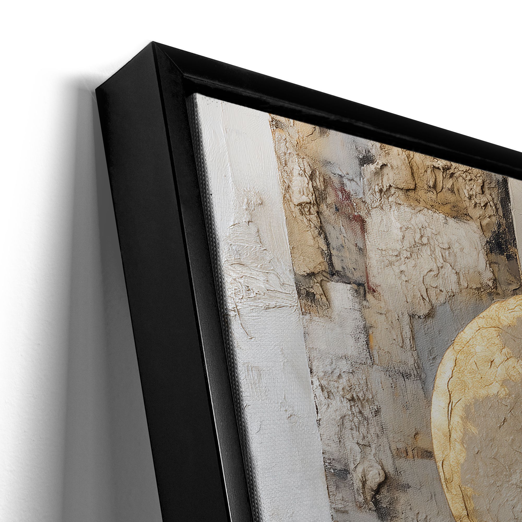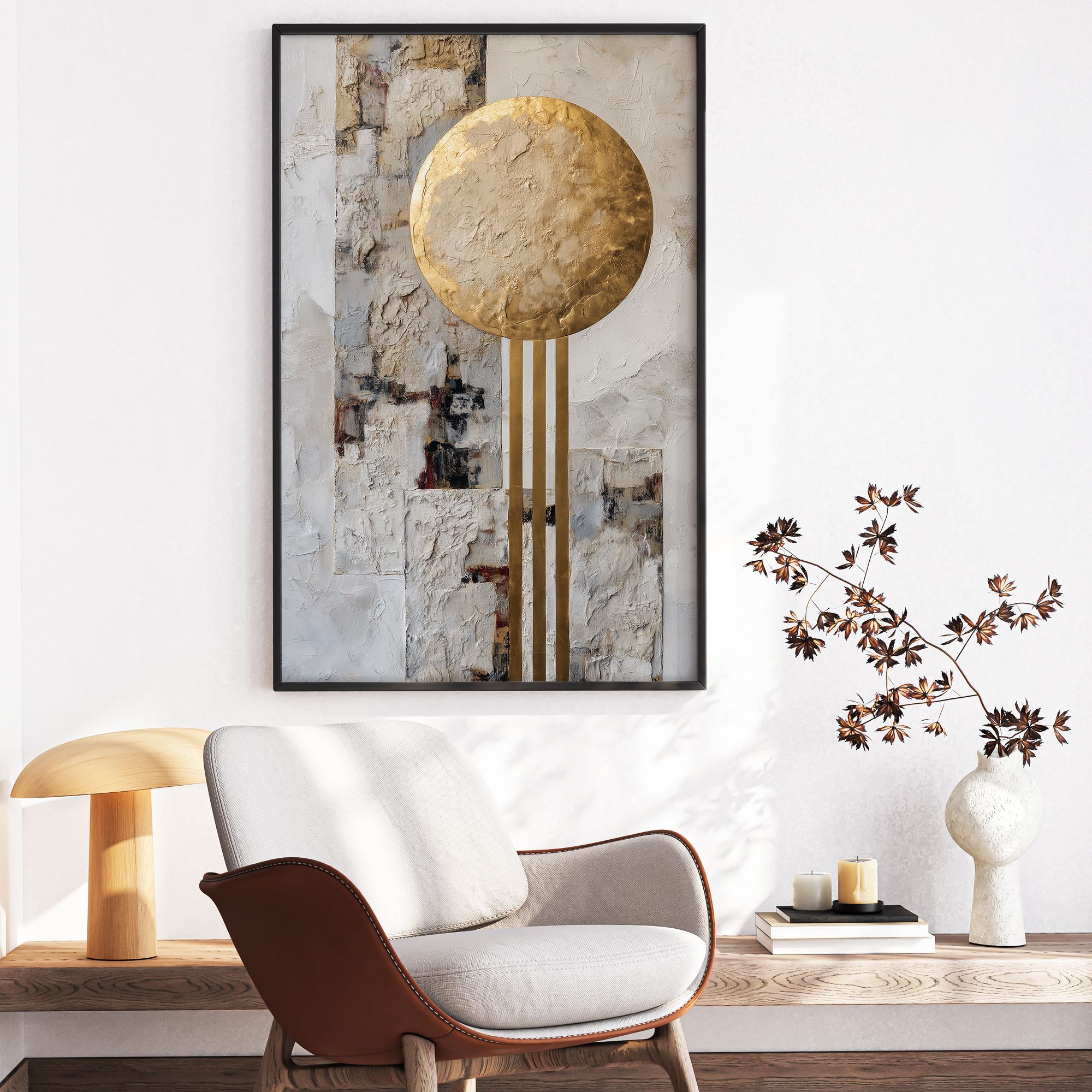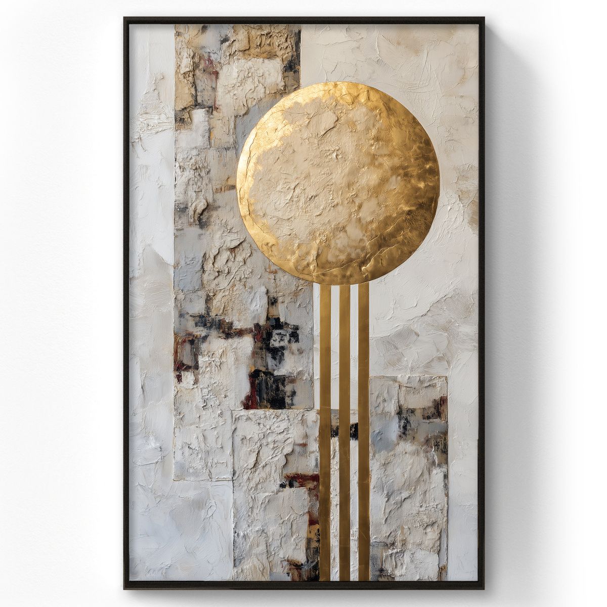 Данная картина представляет собой изящное сочетание абстрактного искусства и природных мотивов, выполненное в теплых и холодных тонах с акцентом на золотистые элементы. Главным образом в центре полотна величественно возвышается большой круглый элемент, выполненный в золотом цвете, который символизирует солнце или луну. Он украшен фактурной поверхностью, создающей ощущение выпуклости и глубины. Золотые вертикальные полосы, ниспадающие вниз, будто лучи света или водопады, добавляют динамики и баланса композиции, создавая ощущение движения и энергии. Фон картины выполнен в серо-голубых и земляных оттенках с выразительными текстурами и кракелюрами, которые напоминают трещины и природные каменные поверхности. Это придаёт работе древний, почти сакральный характер. Черные силуэты пролетающих птиц придают работе живость и уверенность, символизируя свободу и бескрайние просторы. В целом, картина вызывает чувство гармонии между землей и небом, устойчивости и в то же время движения, что делает её идеальным украшением современного интерьера, добавляя в него глубину, стиль и светлый акцент.