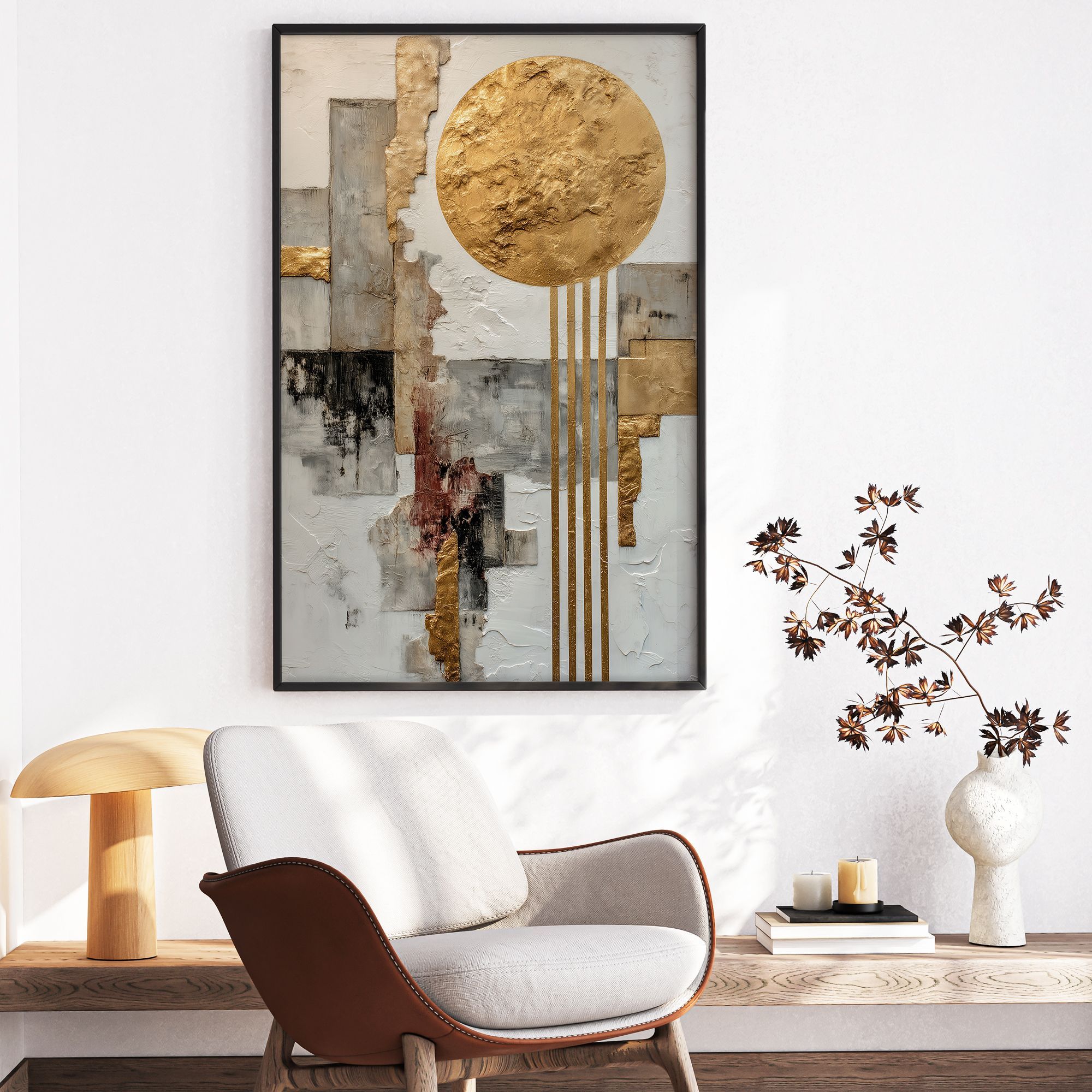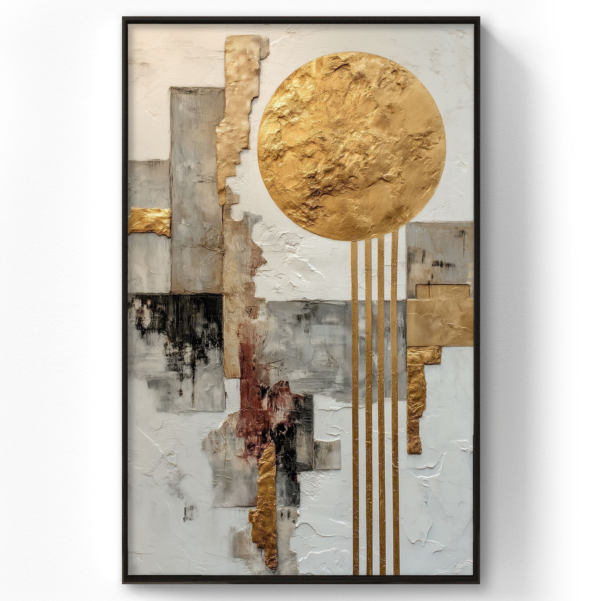 Данная картина представляет собой изящное сочетание абстрактного искусства и природных мотивов, выполненное в теплых и холодных тонах с акцентом на золотистые элементы. Главным образом в центре полотна величественно возвышается большой круглый элемент, выполненный в золотом цвете, который символизирует солнце или луну. Он украшен фактурной поверхностью, создающей ощущение выпуклости и глубины. Золотые вертикальные полосы, ниспадающие вниз, будто лучи света или водопады, добавляют динамики и баланса композиции, создавая ощущение движения и энергии. Фон картины выполнен в серо-голубых и земляных оттенках с выразительными текстурами и кракелюрами, которые напоминают трещины и природные каменные поверхности. Это придаёт работе древний, почти сакральный характер. Черные силуэты пролетающих птиц придают работе живость и уверенность, символизируя свободу и бескрайние просторы. В целом, картина вызывает чувство гармонии между землей и небом, устойчивости и в то же время движения, что делает её идеальным украшением современного интерьера, добавляя в него глубину, стиль и светлый акцент.
