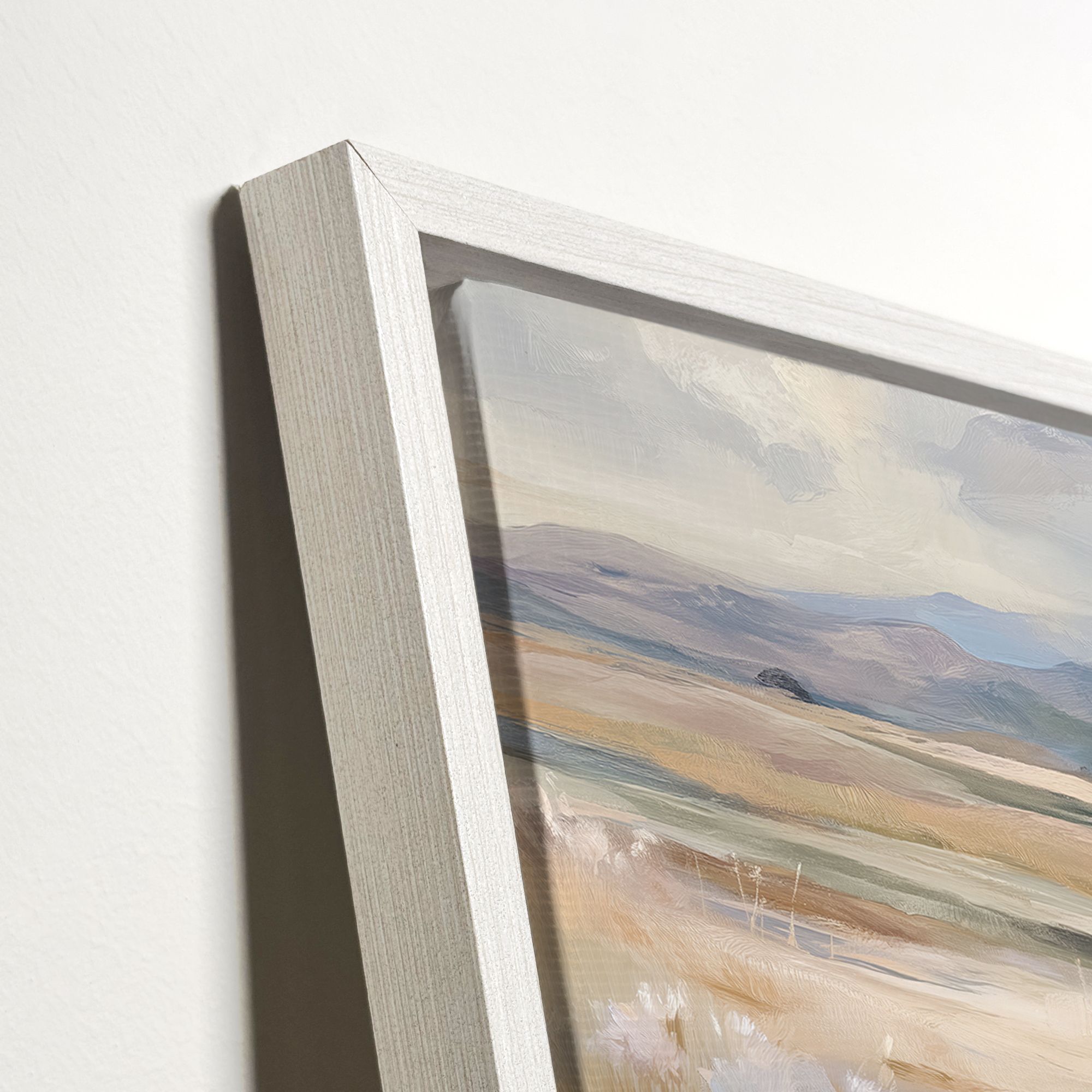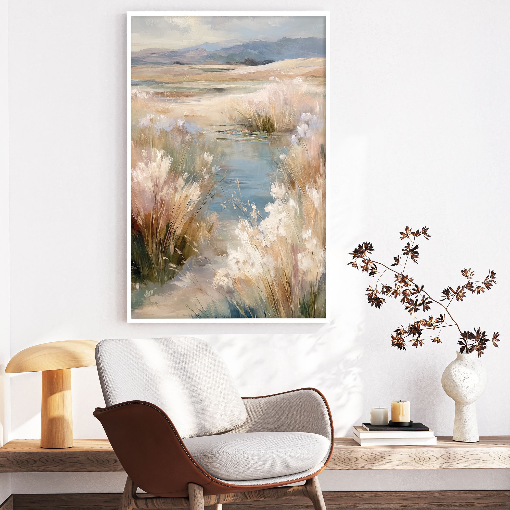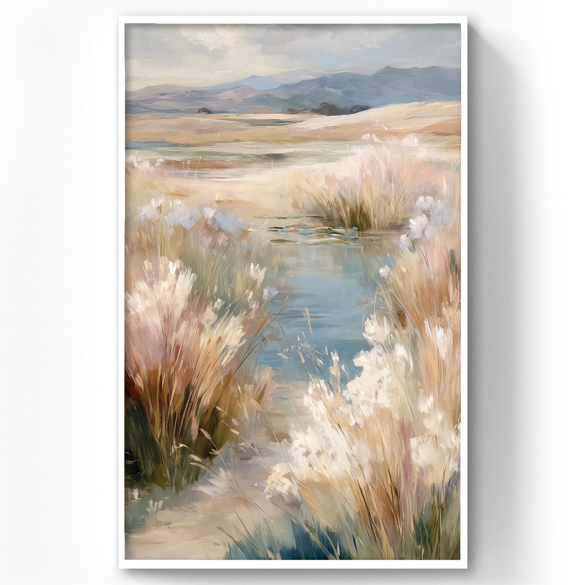 На картине изображён умиротворённый природный пейзаж в мягких, пастельных тонах. В центре композиции — небольшой водоём, отражающий небо и окружающую растительность. На переднем плане — пушистые стебли трав и камышей, выполненные в бежево-кремовых, светло-зелёных и нежно-голубых оттенках. Лёгкие мазки создают ощущение движения ветра, колышущего траву. Фон картины плавно уходит вдаль: видны холмы и горы, окутанные лёгкой дымкой. Небо написано полупрозрачными облаками, что придаёт работе воздушность и лёгкость. Вся композиция наполнена спокойствием, гармонией и ощущением простора. Техника исполнения напоминает импрессионизм — мягкие переходы цвета, отсутствие чётких контуров, акцент на настроении и свете. Природные мотивы и мягкие цвета идеально впишутся в интерьер с натуральными материалами (дерево, камень, лён). Картина усилит связь с природой, создаст расслабляющую атмосферу.