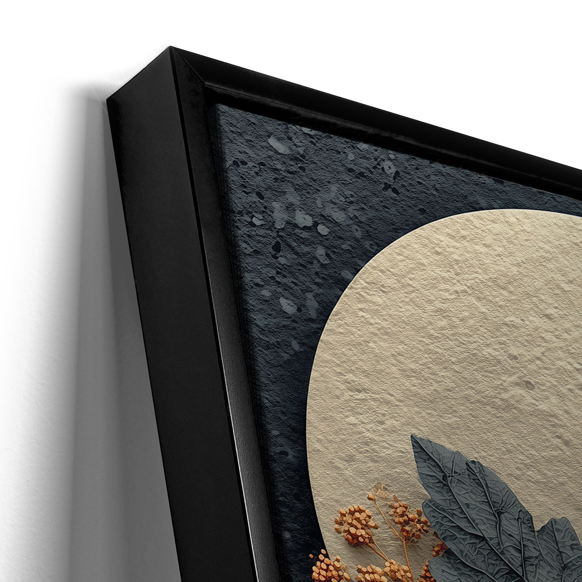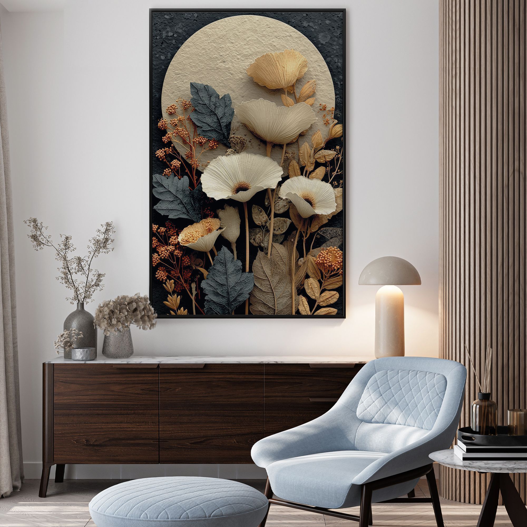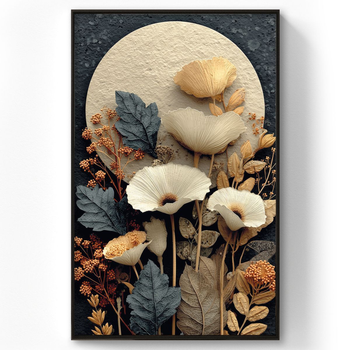 Картина выполнена в ботаническом стиле с элементами художественной абстракции. Центральным элементом композиции является большой светлый круг, напоминающий луну или диск, который служит фоном для изящной композиции из засушенных цветов и листьев. На переднем плане изображены крупные цветы, напоминающие маки, выполненные в нежных бежево-кремовых оттенках с тонкими прожилками, подчёркивающими текстуру лепестков. Вокруг них расположены листья разной формы и размера — от крупных тёмно-серых до мелких светло-коричневых. Также присутствуют веточки с мелкими круглыми ягодами или соцветиями в тёплых терракотовых и охристых тонах. Цветовая гамма картины выдержана в приглушённых, природных оттенках: серовато-голубых, бежевых, коричневых и рыжеватых. Тёмный фактурный фон контрастирует с центральным светлым кругом и растительными элементами, создавая глубину и объём. Композиция выглядит многослойной, с ощущением ручной работы и природной естественности.
