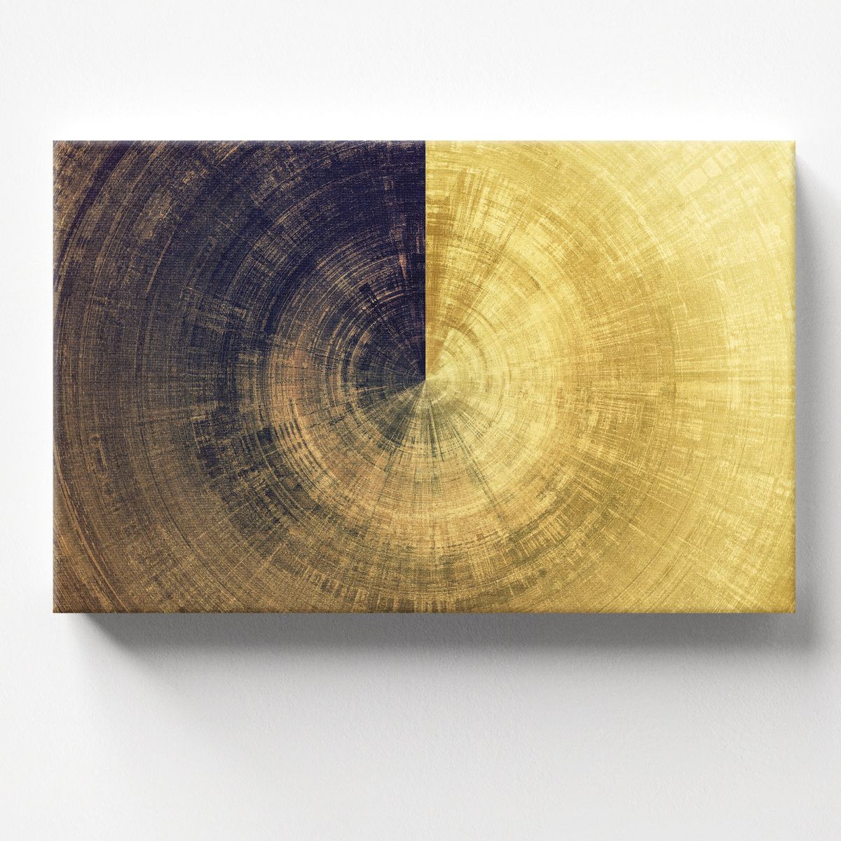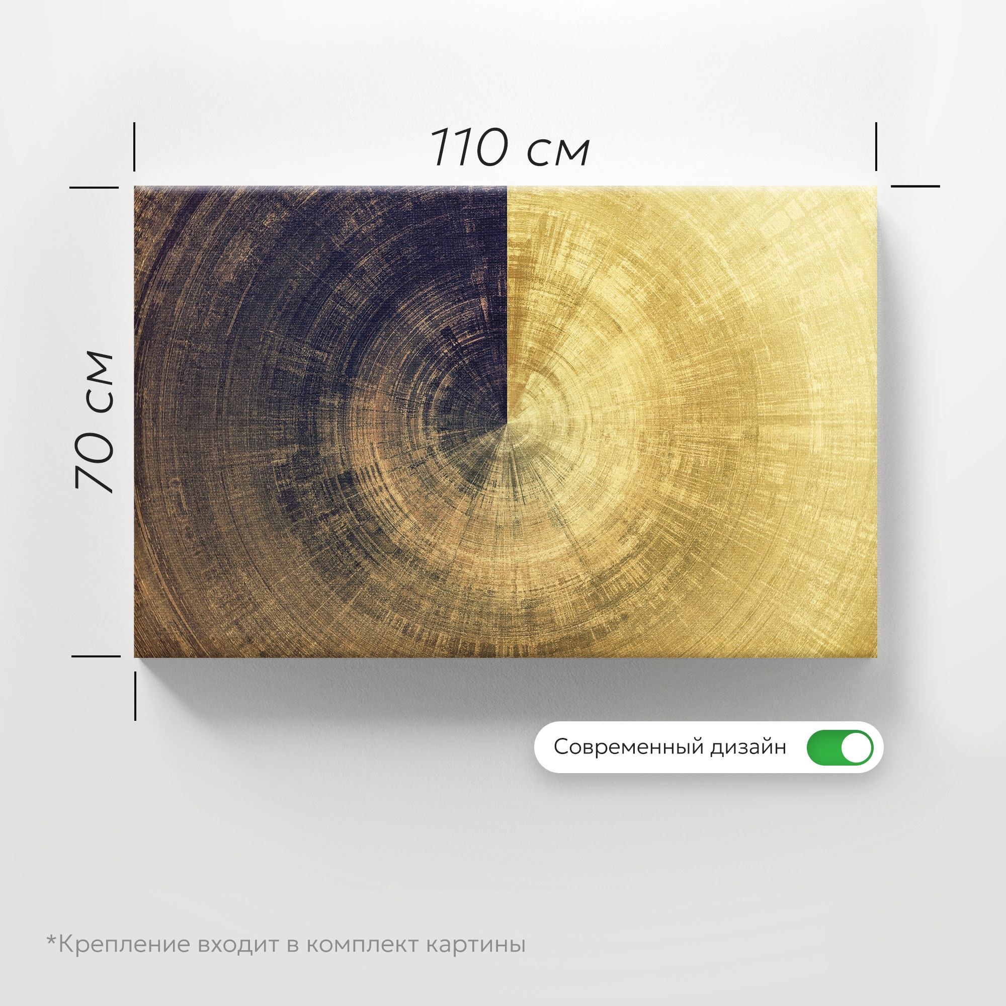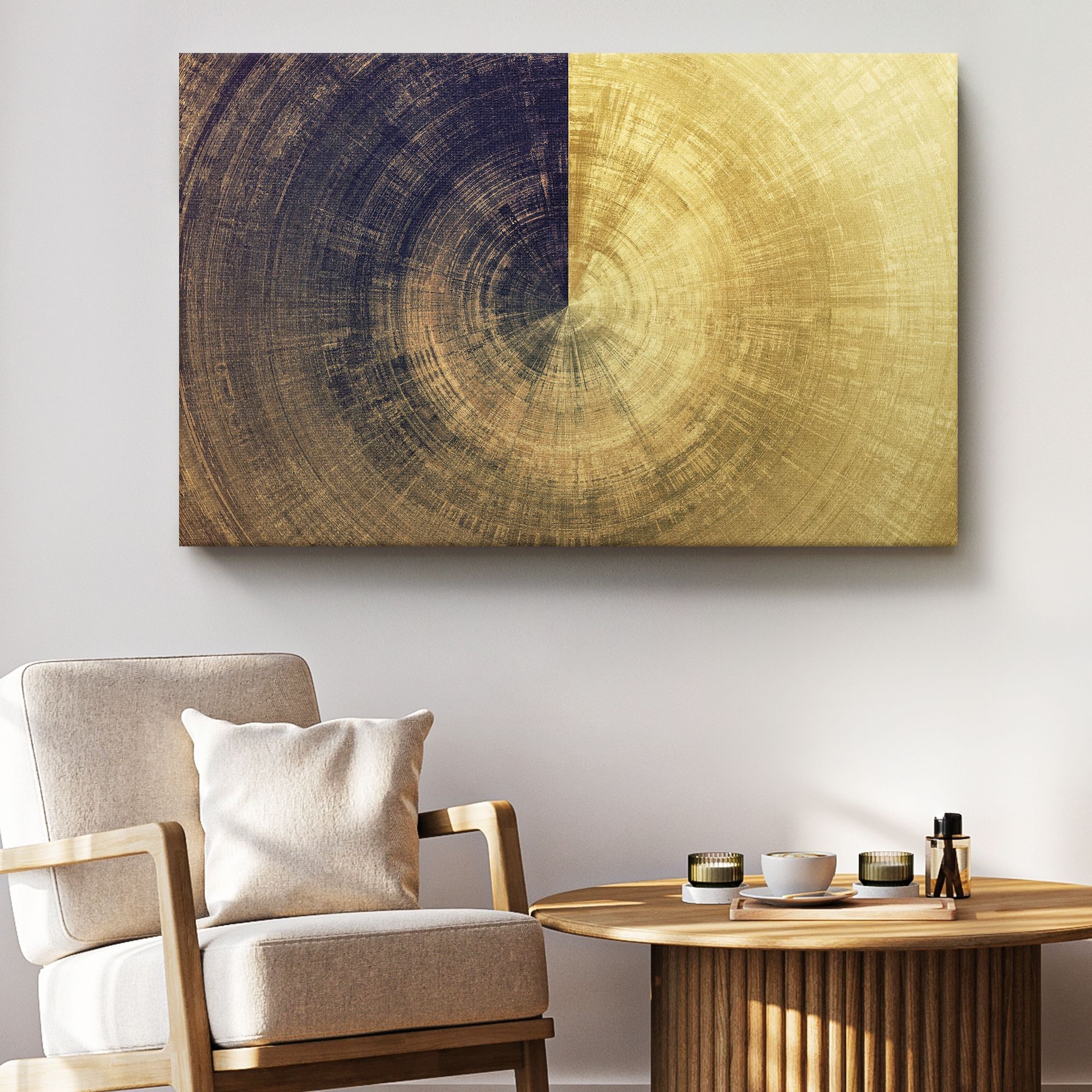 Картина представляет собой абстрактную композицию с выраженной текстурой, напоминающей потёртую поверхность или винтажный фильтр. Основной мотив — концентрические круги, расходящиеся от центра, разделённые вертикальной линией на две контрастные части: левая половина выполнена в тёмных, почти чёрных оттенках, создаёт ощущение глубины и загадочности; правая половина — в тёплых золотисто-бежевых тонах, придаёт работе ощущение света и энергии; текстура холста хорошо заметна, добавляет объём и динамику; композиция симметрична относительно вертикальной оси, но контраст между половинами создаёт визуальный «диалог» между тьмой и светом. Картина подчеркнёт индустриальную эстетику, добавит глубины и контраста;