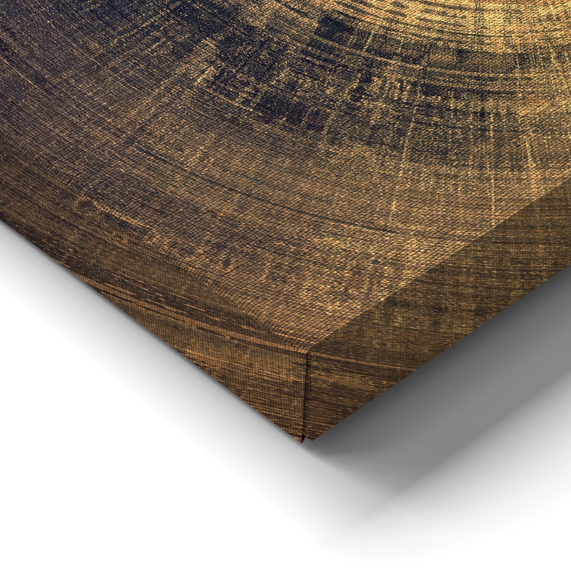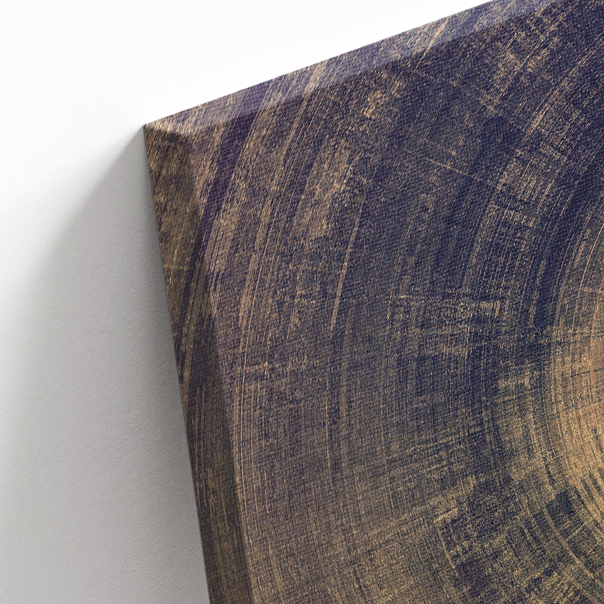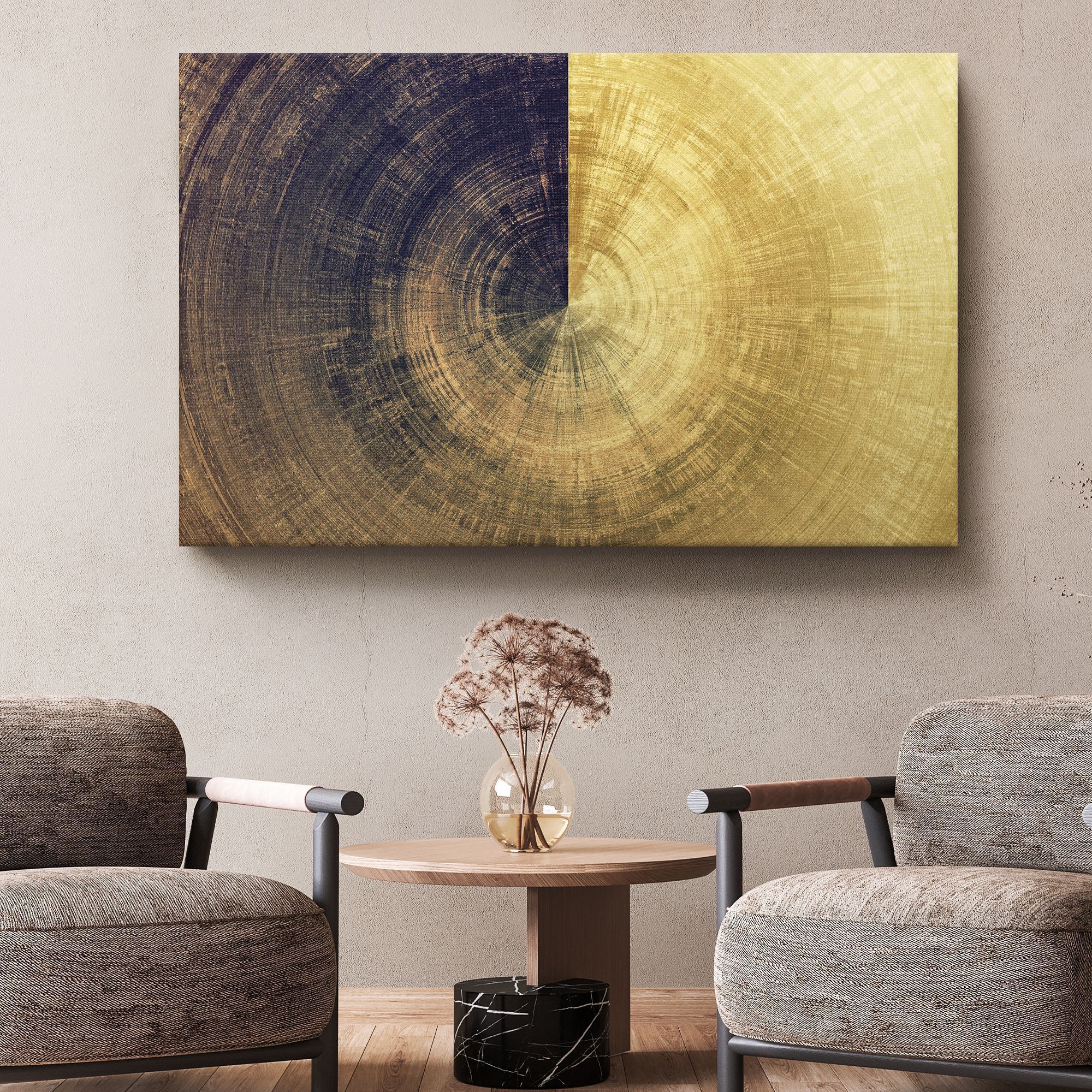 Картина представляет собой абстрактную композицию с выраженной текстурой, напоминающей потёртую поверхность или винтажный фильтр. Основной мотив — концентрические круги, расходящиеся от центра, разделённые вертикальной линией на две контрастные части: левая половина выполнена в тёмных, почти чёрных оттенках, создаёт ощущение глубины и загадочности; правая половина — в тёплых золотисто-бежевых тонах, придаёт работе ощущение света и энергии; текстура холста хорошо заметна, добавляет объём и динамику; композиция симметрична относительно вертикальной оси, но контраст между половинами создаёт визуальный «диалог» между тьмой и светом. Картина подчеркнёт индустриальную эстетику, добавит глубины и контраста;