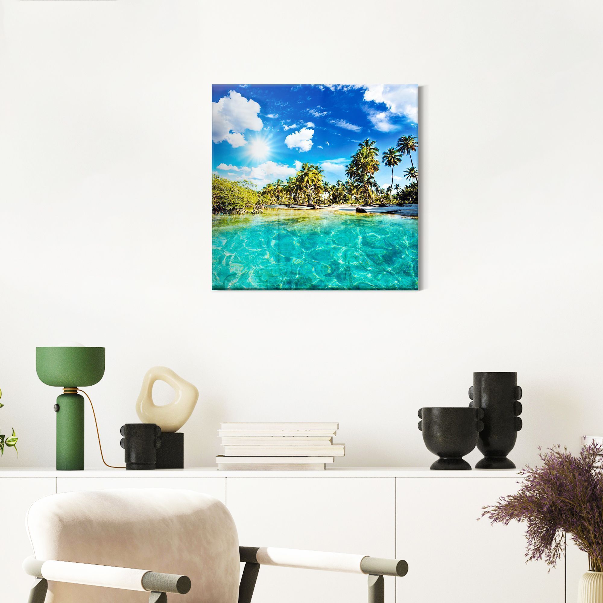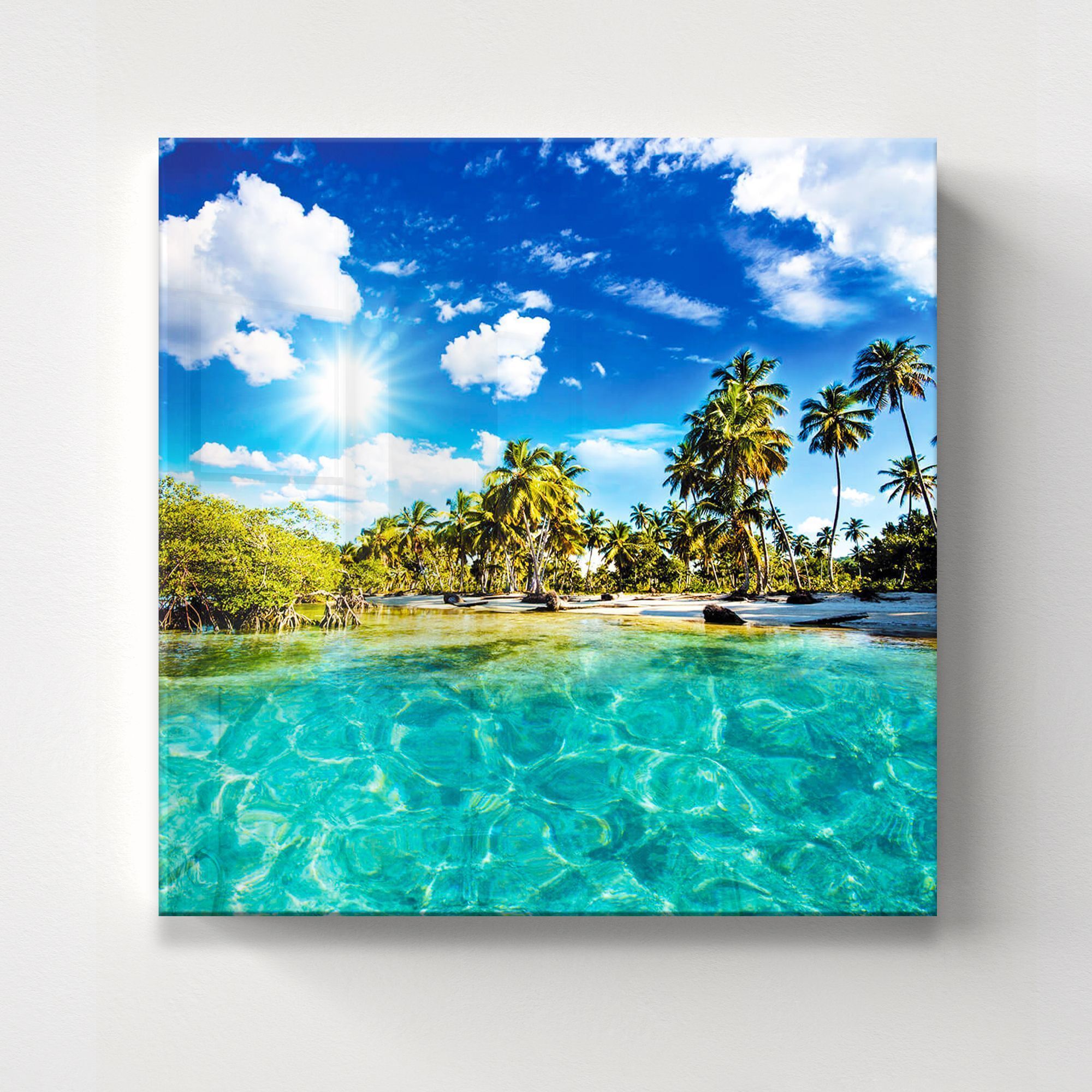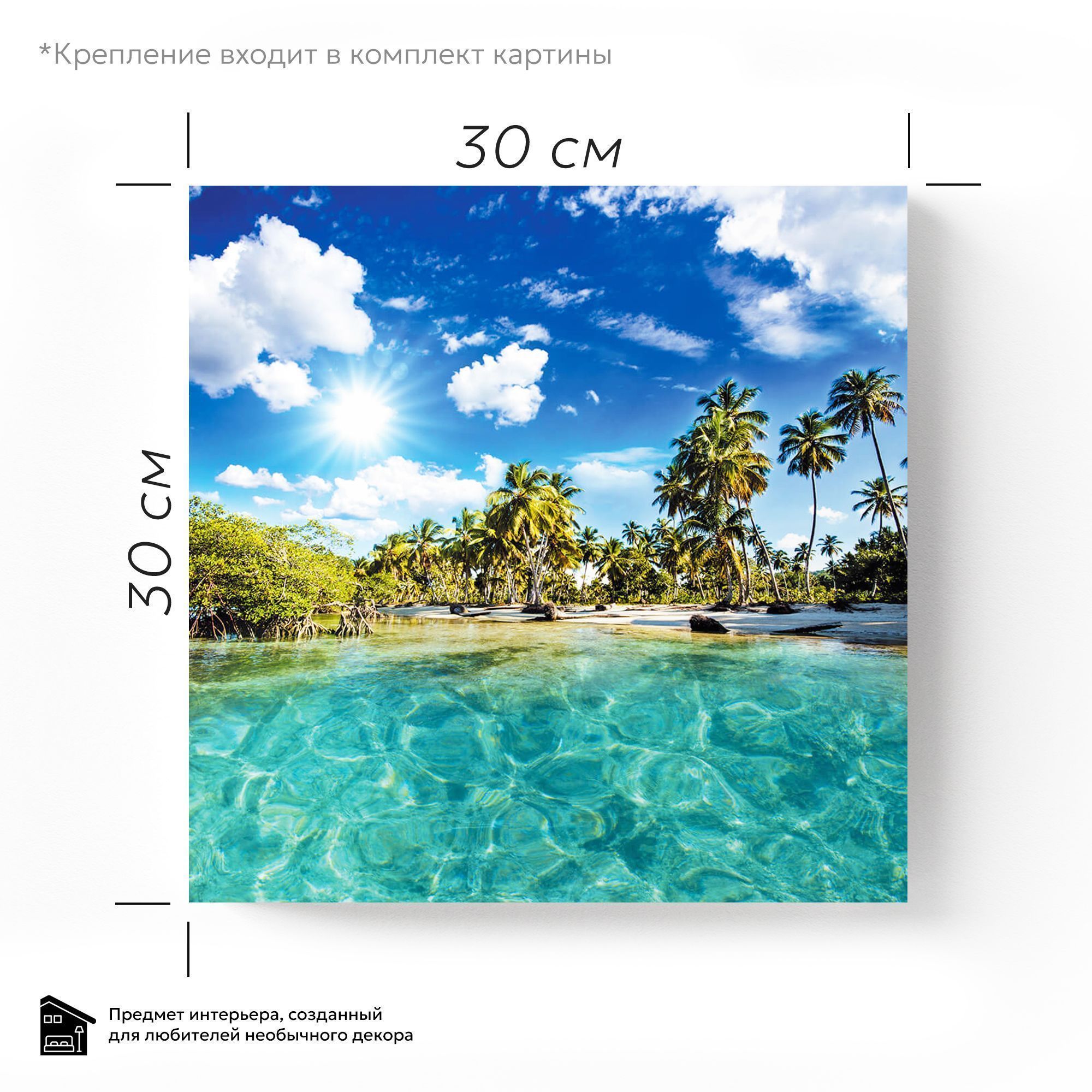 Эта восхитительная картина, представляющая собой идеальный тропический рай. Верхняя часть изображения представлена ​​бескрайним, глубоким, лазурным небом , которое на стекле приобретает еще большую насыщенность и свечение, как настоящие синие тропики. По небу раскиданы пушистые, объемные белые облака. Вдоль берега тянется полоса светлого, почти белого песка , который контрастирует с водой и зеленью, отличается чистотой и нетронутостью пляжа. Величественные пальмы с раскидистыми, изумрудно-зелеными кронами доминируют в средней части изображения. Их стволы устремлены в небо, пышные листья образуют тень, приглашая к укрытию от зноя. Разнообразие оттенков зеленого, от светлого до темного, будет играть на стекле, придавая каждой пальме индивидуальность и объем. Их отражения в воде будут слегка размытыми, но заметными. Кристально чистая бирюзовая вода на переднем плане буквально притягивает взгляд. Ее прозрачность позволяет увидеть песчаное дно, хотя оно и находится вне фокуса. На стекле эта модель будет выглядеть как настоящее окно в райский уголок. Это идеальное изображение для тех, кто хочет привнести в интерьер ощущение спокойствия, свежести, тепла и бесконечной красоты тропического побережья, каждый день наслаждаясь вкусом личного кусочка рая.