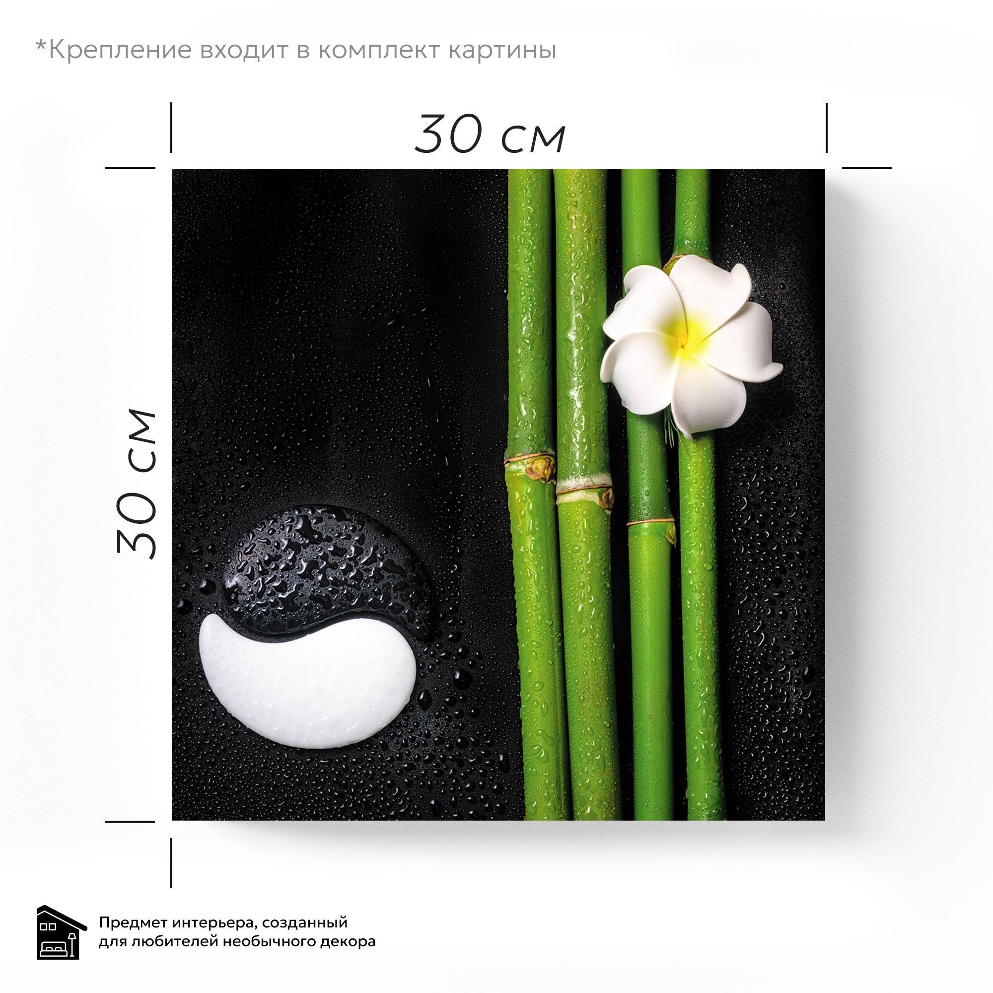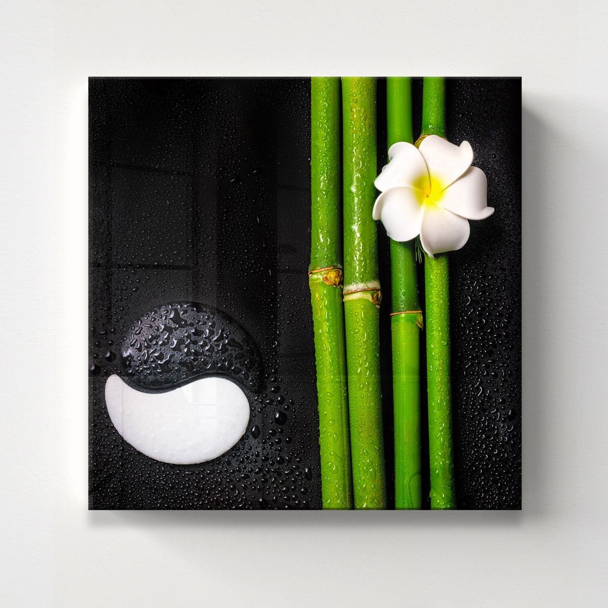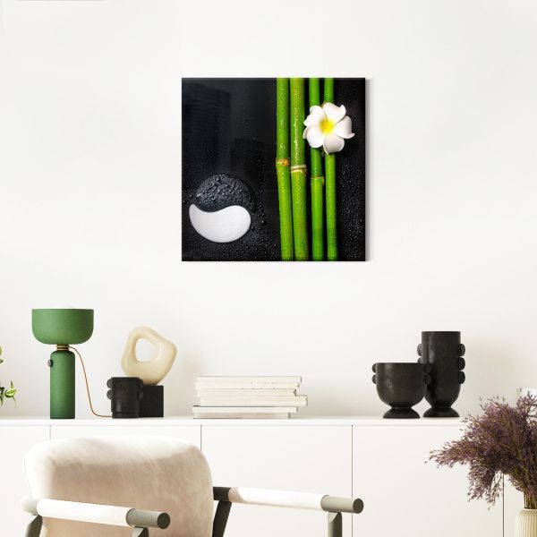 На картине, выполненной на стекле, перед нами предстает гармоничное и умиротворяющее изображение, сочетающее символику восточной философии и природную красоту. Четыре изумрудно-зеленых стебля бамбука, покрытые деликатными каплями влаги, подчеркивают свежесть и жизненную силу природы. Рядом расположена нежная белая цветочная композиция с желтым центром, символизирующая чистоту и гармонию. Особое значение придает картине знак инь-янь, выполненный в виде двух полукруглых капель — черной и белой, что символизирует баланс противоположностей и единство мира. Вся композиция на фоне глубоко черного стекла создает ощущение спокойствия, внутреннего равновесия и природной красоты, что делает такое произведение идеальным для интерьеров, направленных на расслабление и медитацию.