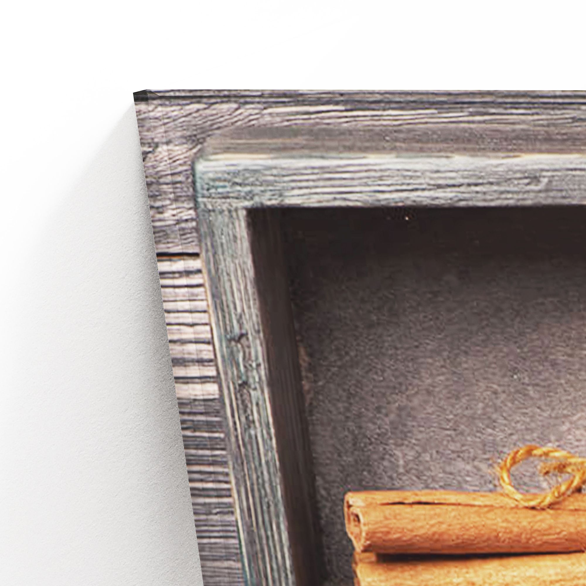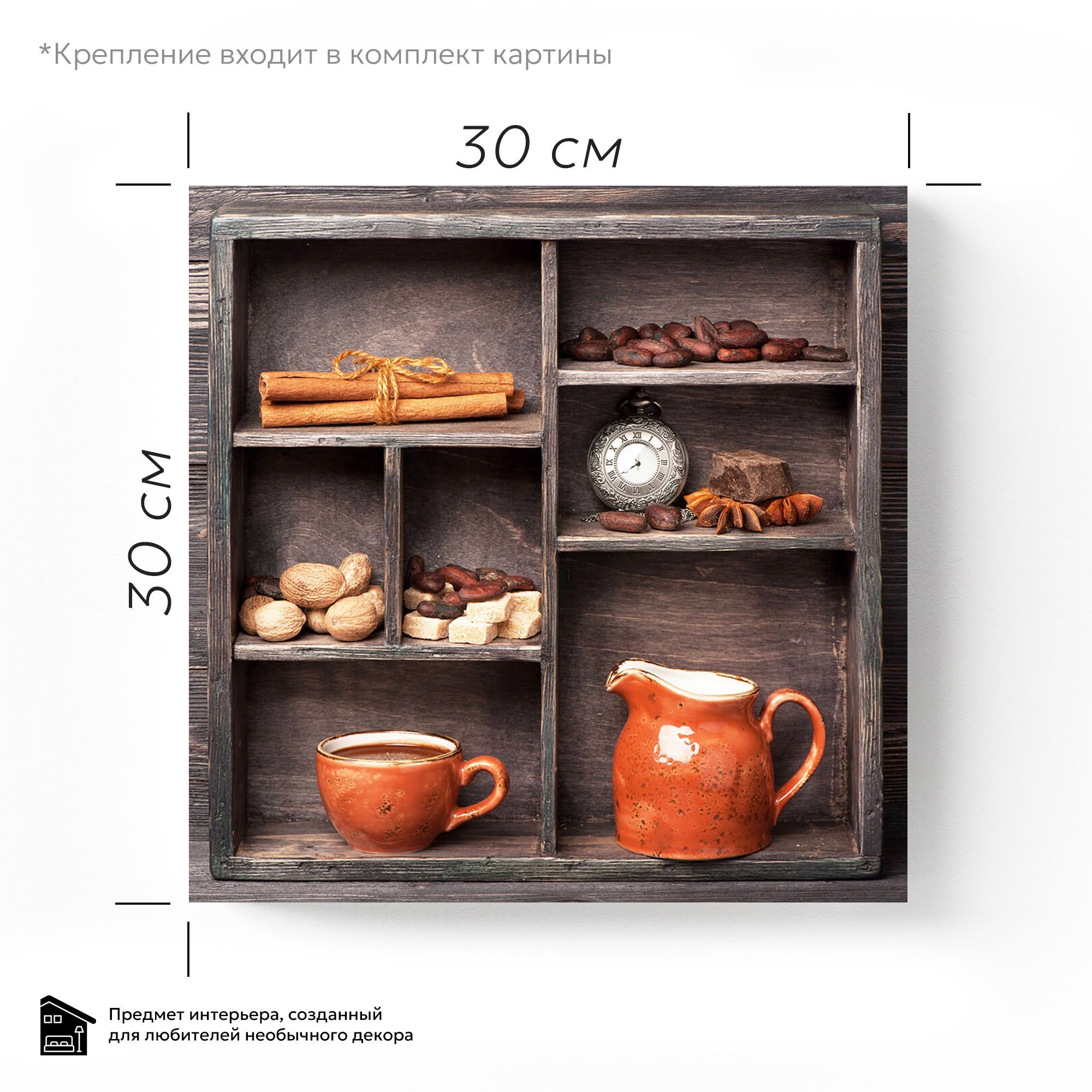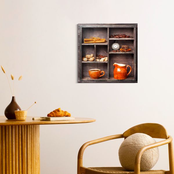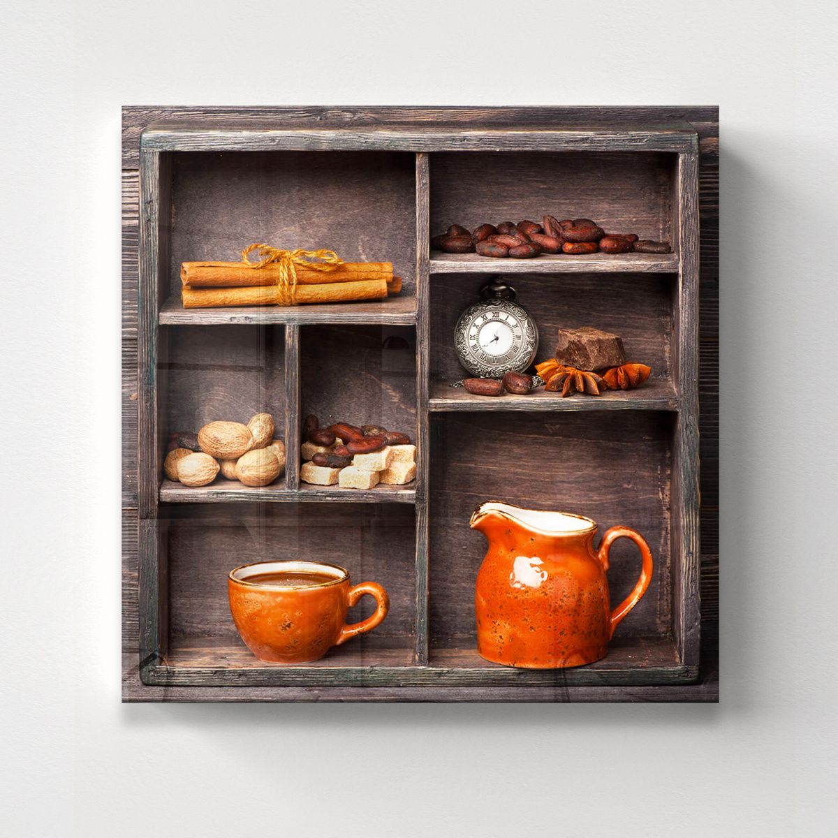 Эта изящная картина выполнена в виде старинного деревянного секционного лотка, в котором уютно размещены предметы, олицетворяющие атмосферу тепла, уюта и неспешного времени. На верхней полке аккуратно лежит связка коричных палочек, передавая запах пряностей и осенних вечеров. Рядом, в двух маленьких отделениях, расположены целые орехи и кусочки коричневого тростникового сахара вместе с какао-бобами — символы натуральности и вкусовых наслаждений. Особое внимание привлекает серебряные карманные часы с римскими цифрами, расположенные среди какао-бобов и шоколадных кусочков с бадьяном — метафора движения времени и гармонии момента. На нижних полках размещены керамические чашка и молочник в теплых терракотовых оттенках, придающие композиции домашний и живой характер. Фон из темного состаренного дерева усиливает глубину и теплоту изображения, подчёркивая каждую деталь. Эта картина на стекле — словно приглашение остановиться, насладиться мгновением, окунуться в ароматный мир кофе и пряностей, наполненный теплом и спокойствием.
