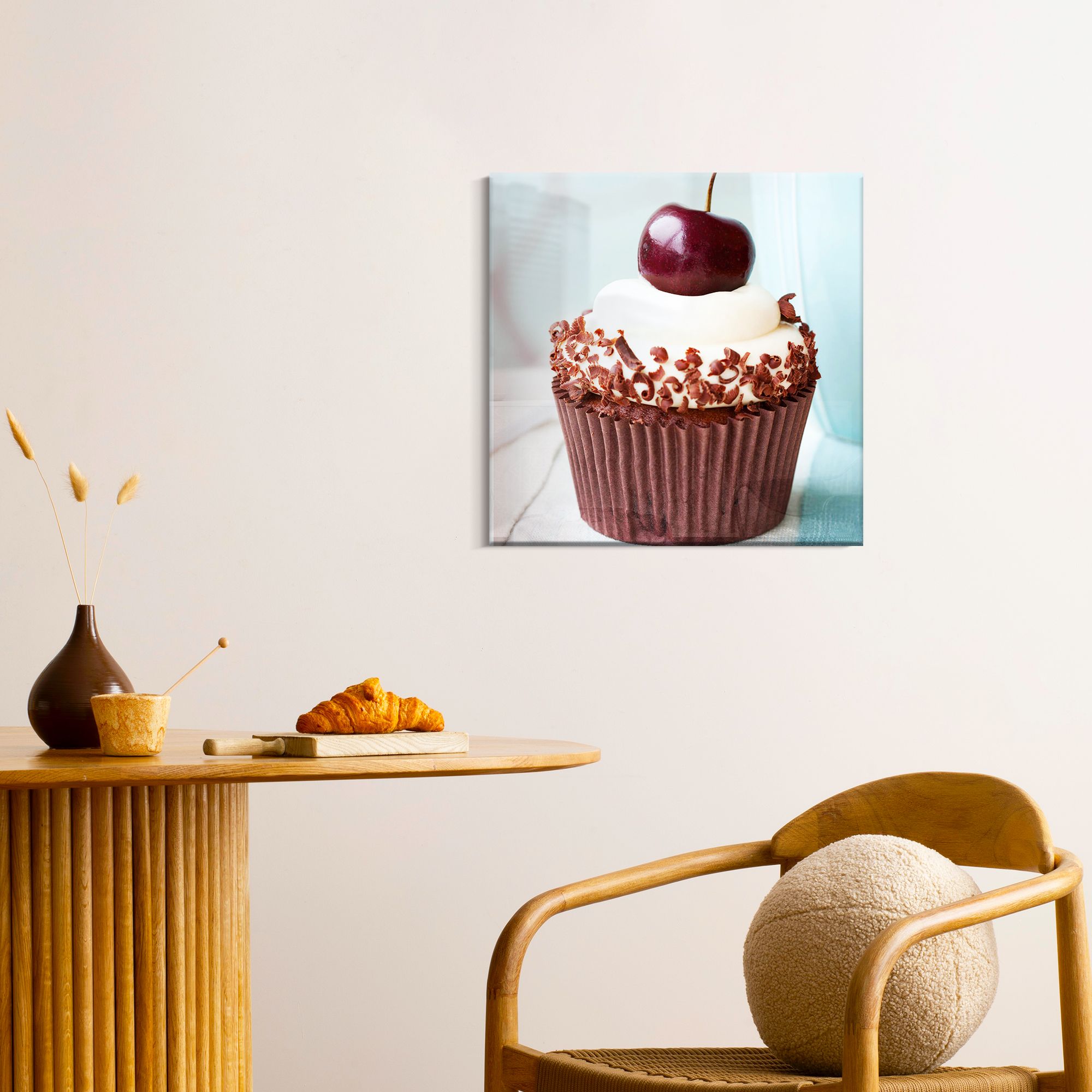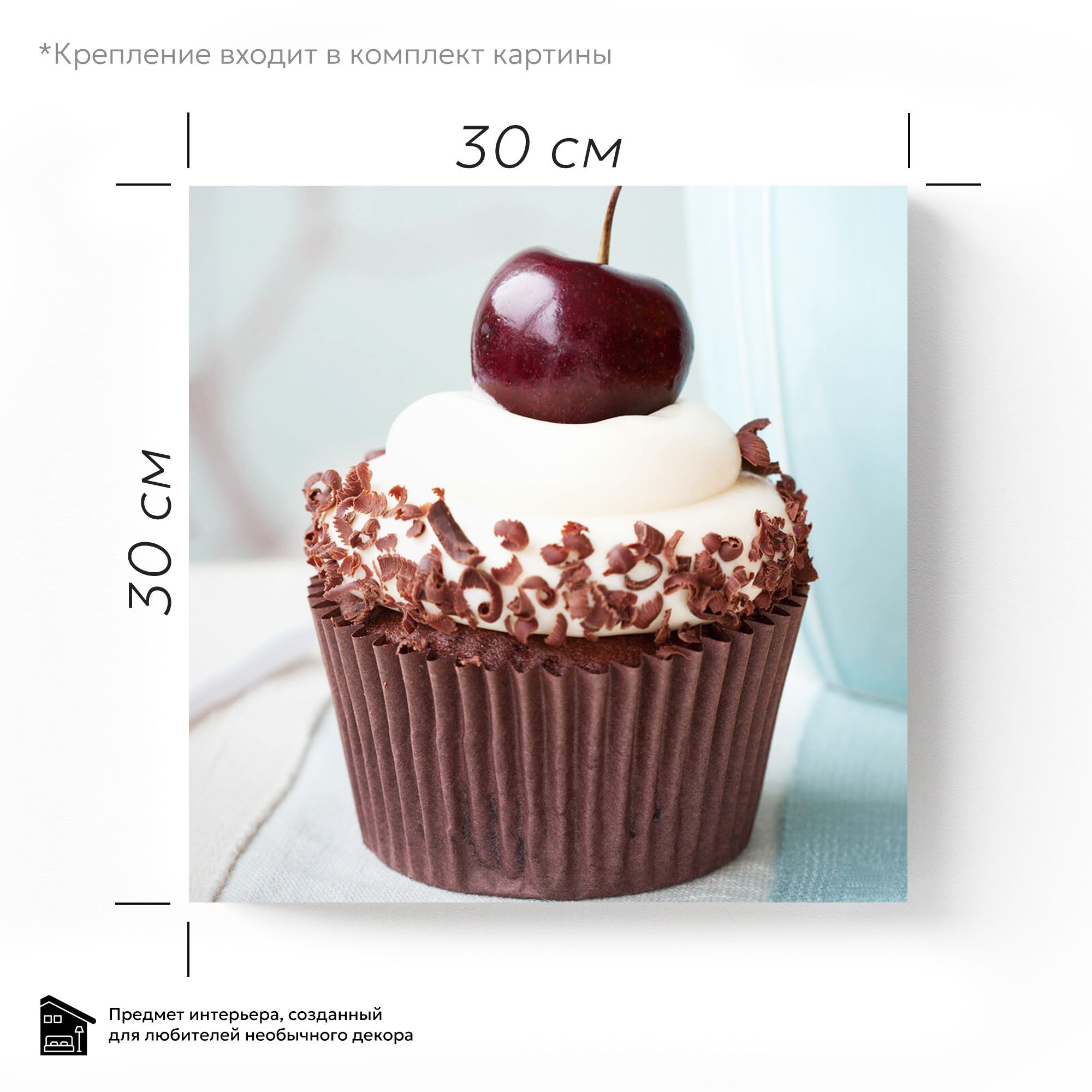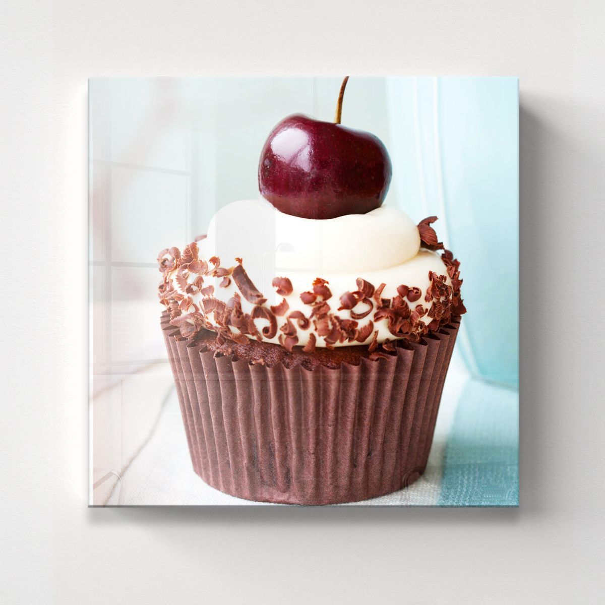 Перед нами изысканный образ капкейка, увековеченный в виде картины на стекле. Насыщенный шоколадный кекс обёрнут в темно-коричневую бумажную форму, подчёркивающую его плотную текстуру. Сверху плавно взбитый крем нежного белого цвета будто окутывает десерт, создавая впечатление воздушной легкости. Украшение из шоколадных стружек придаёт композиции деликатную изящность и глубину. Завершается этот гастрономический шедевр яркой и сочной вишенкой с гладкой глянцевой кожицей, которая притягивает взгляд и акцентирует внимание на финальном штрихе. Картина на стекле передаёт аппетитную свежесть и гармонию вкусов, сочетая мягкость, сладость и насыщенность шоколада. Благодаря кристальной прозрачности стекла каждая деталь — от текстуры крема до нежных завитков шоколада — выглядит объемной и реалистичной, вызывая желание прикоснуться и почувствовать вкус. Это произведение искусства станет идеальным украшением для кухни или кафе, добавляя интерьеру уюта и аппетитного настроения.
