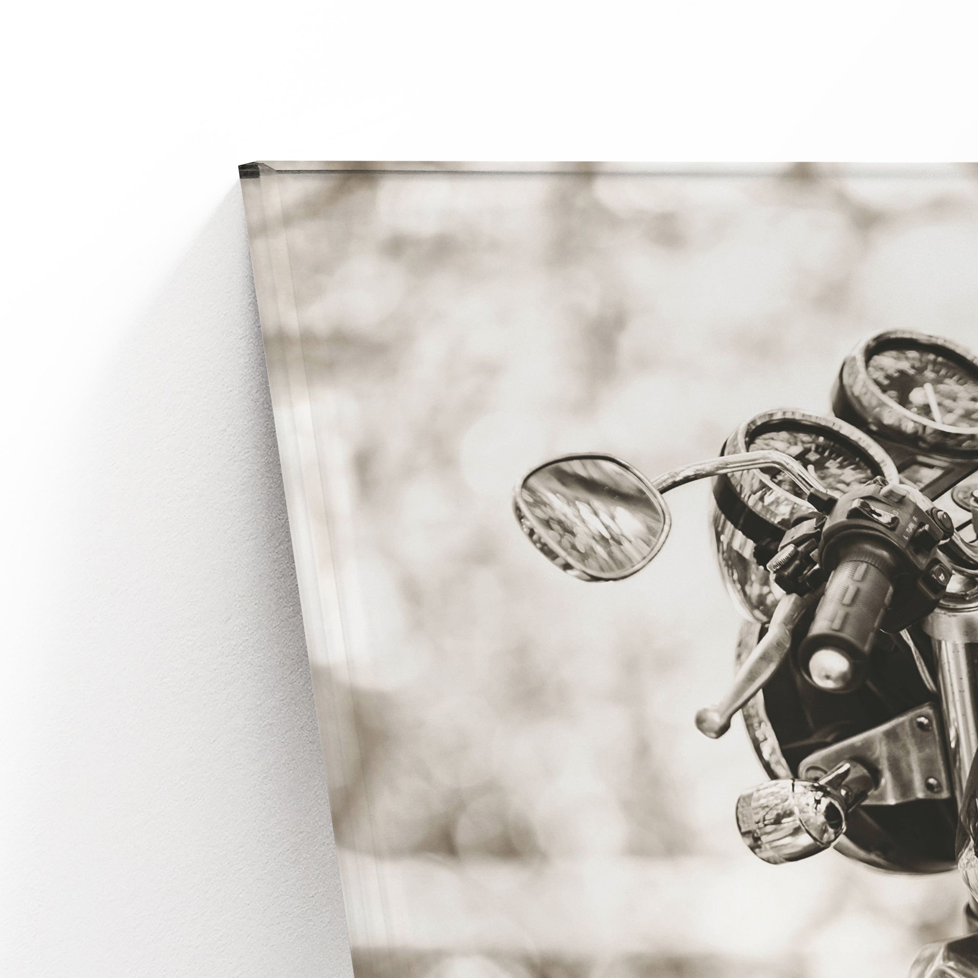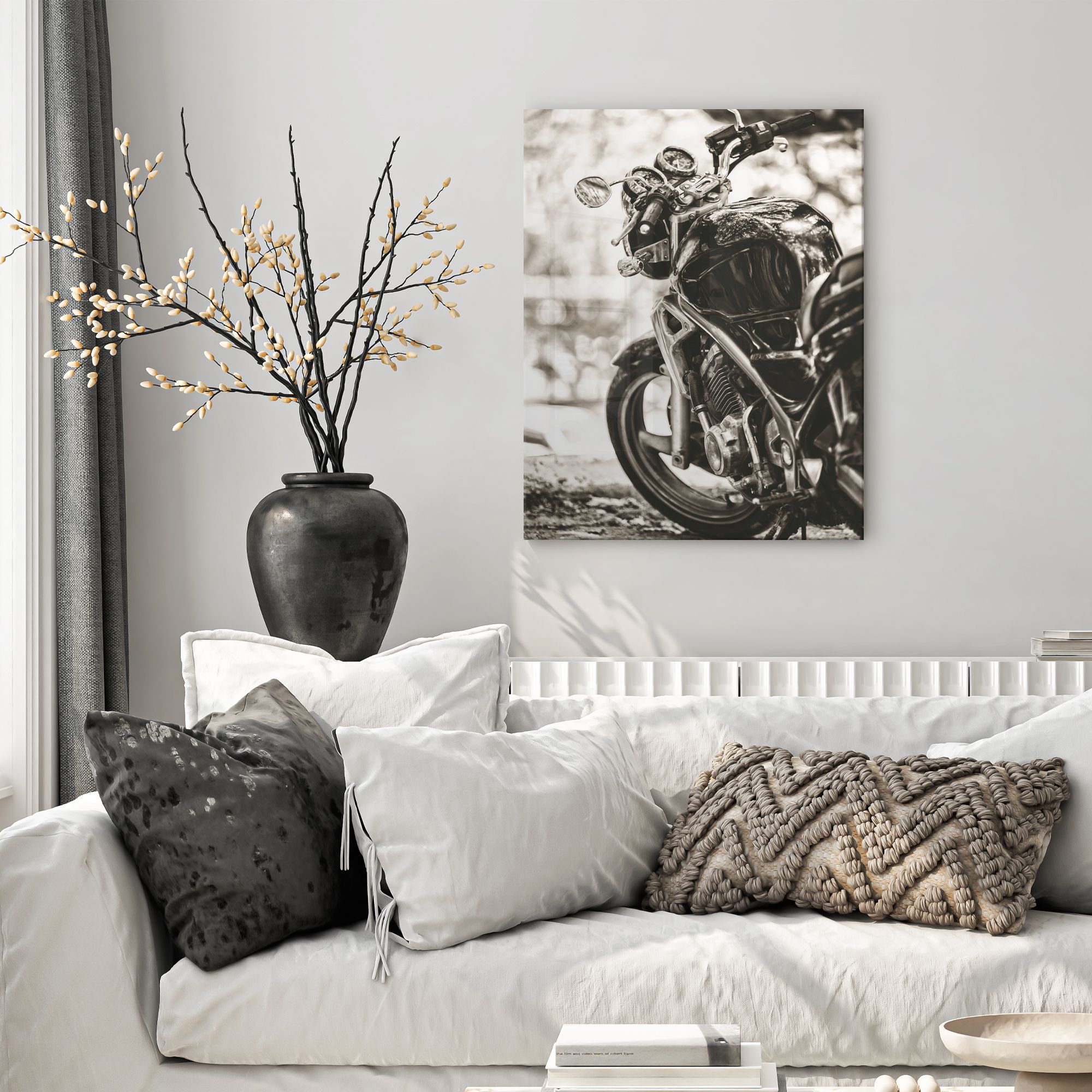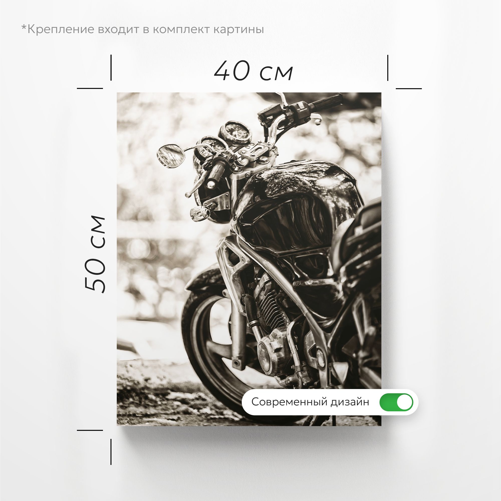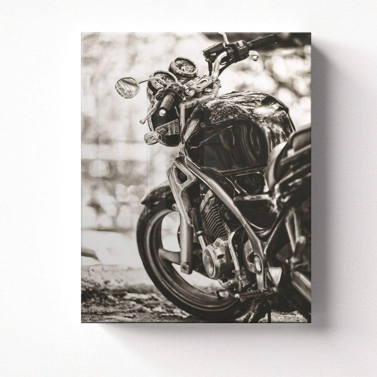 На картине изображён фрагмент мотоцикла в чёрно-белой гамме — акцент сделан на передней части байка. В кадре хорошо видны: руль с зеркалами заднего вида, создающими лёгкую динамику; приборы (спидометр и тахометр) — добавляют индустриального шарма; часть топливного бака с выразительными бликами, подчёркивающими глянцевую поверхность; элементы двигателя и рамы, демонстрирующие техническую эстетику; переднее колесо, слегка размытое, что создаёт ощущение глубины. Фон размытый, с мягкими световыми пятнами, что акцентирует внимание на мотоцикле. Чёрно-белая палитра придаёт изображению винтажный, немного ностальгический характер, подчёркивает текстуры и контрасты металла, пластика и резины. Общая атмосфера — урбанистическая, с налётом свободы и драйва. Эта картина подойдёт для интерьера в стиле лофт, индастриал или минимализм. Добавит комнате «характера», подчеркнёт любовь хозяев к технике и свободе.