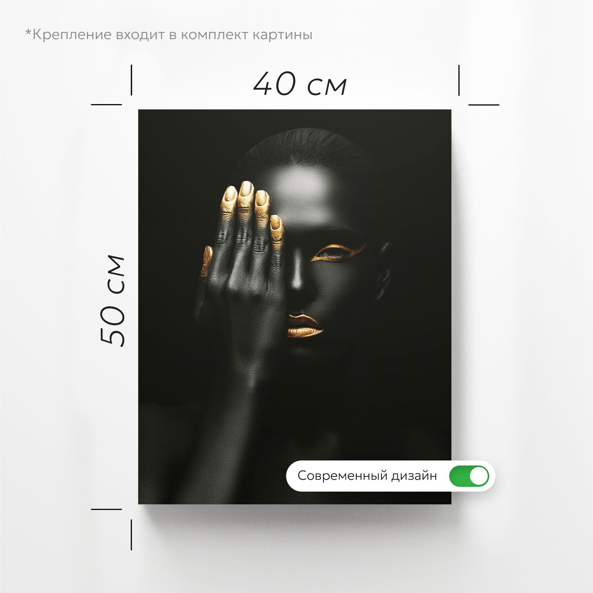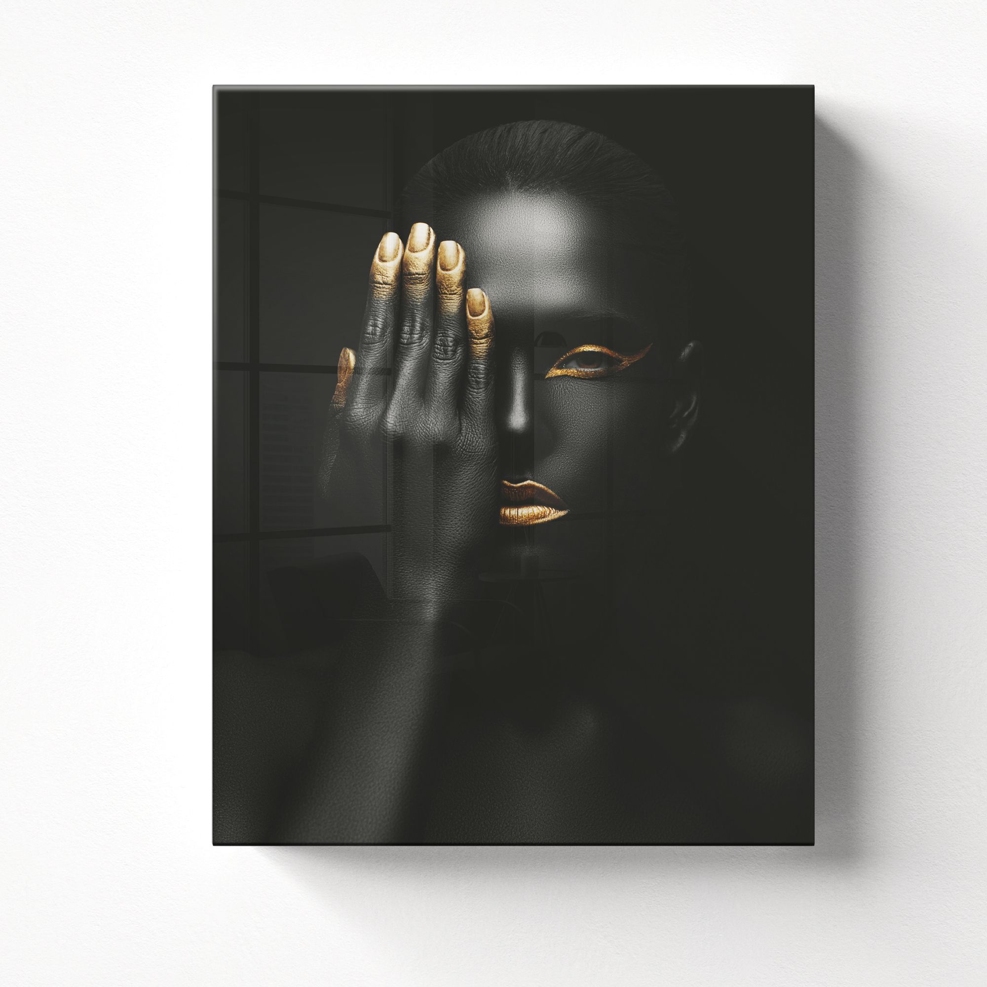 Картина выполнена в экспрессивной, контрастной манере. Центральное место занимает изображение женщины с кожей глубокого чёрного оттенка. Её лицо частично закрыто рукой, что создаёт атмосферу загадочности и драматизма. Цветовая гамма: доминирует глубокий чёрный цвет, эффектно контрастирующий с золотыми акцентами. Золотые детали: тщательно прорисованы губы, веки, ногти — создают ощущение роскоши и мистики. Золотые линии вокруг глаз напоминают древнеегипетский макияж, добавляя образу экзотичности. Поза: рука, закрывающая часть лица, символизирует тайну, внутреннюю силу или желание скрыться от внешнего мира. Этот жест придаёт картине психологическую глубину. Фон: абсолютно чёрный, без дополнительных деталей — усиливает драматизм и фокусирует внимание на фигуре женщины. Настроение картины — загадочность, сила, элегантность, некоторая отстранённость; сочетание тёмных и золотых тонов создаёт ощущение роскоши, но с налётом мистики. Картина на стекле в интерьере в стиле арт-деко или модерн — станет центральным акцентом, подчеркнёт изысканность и современность интерьера.