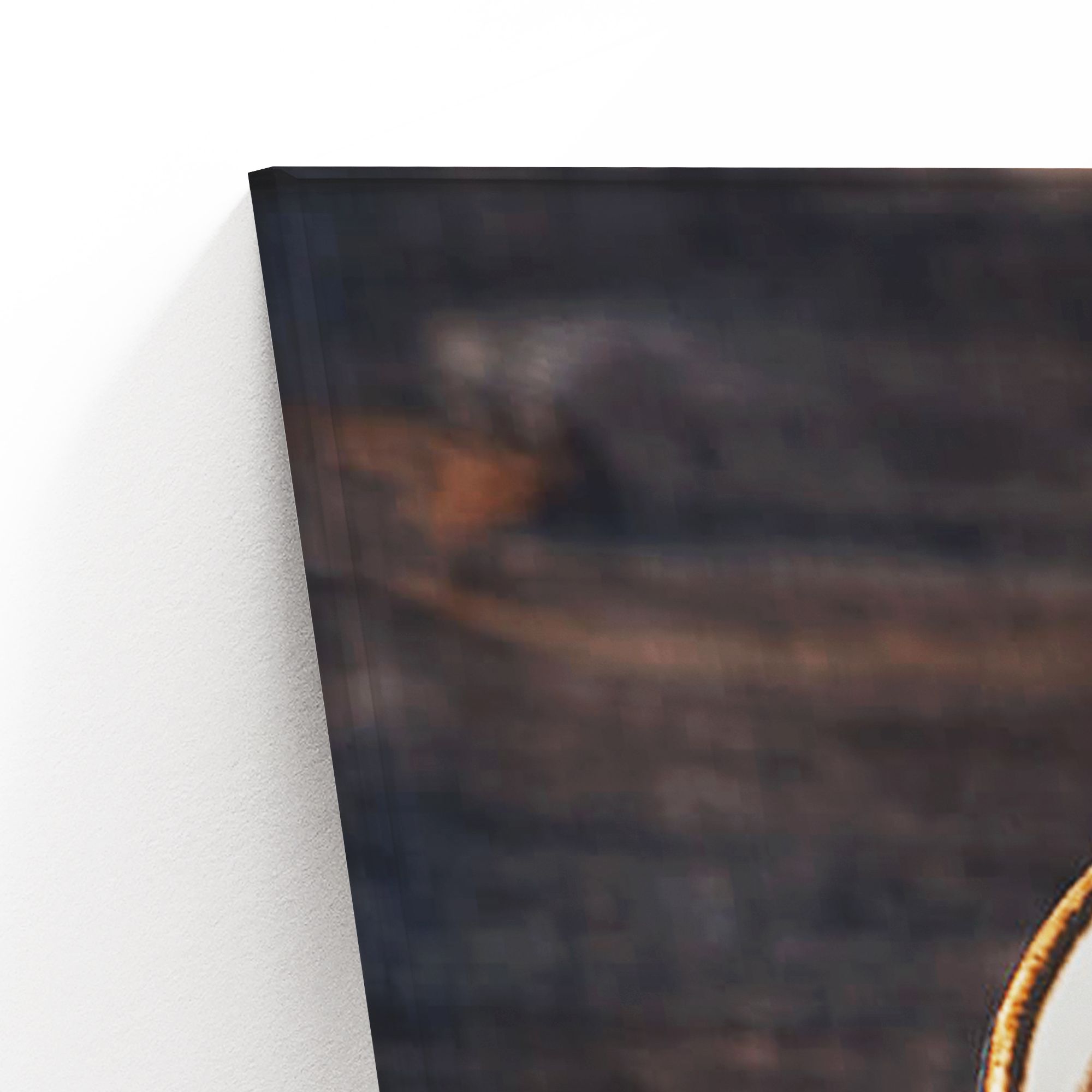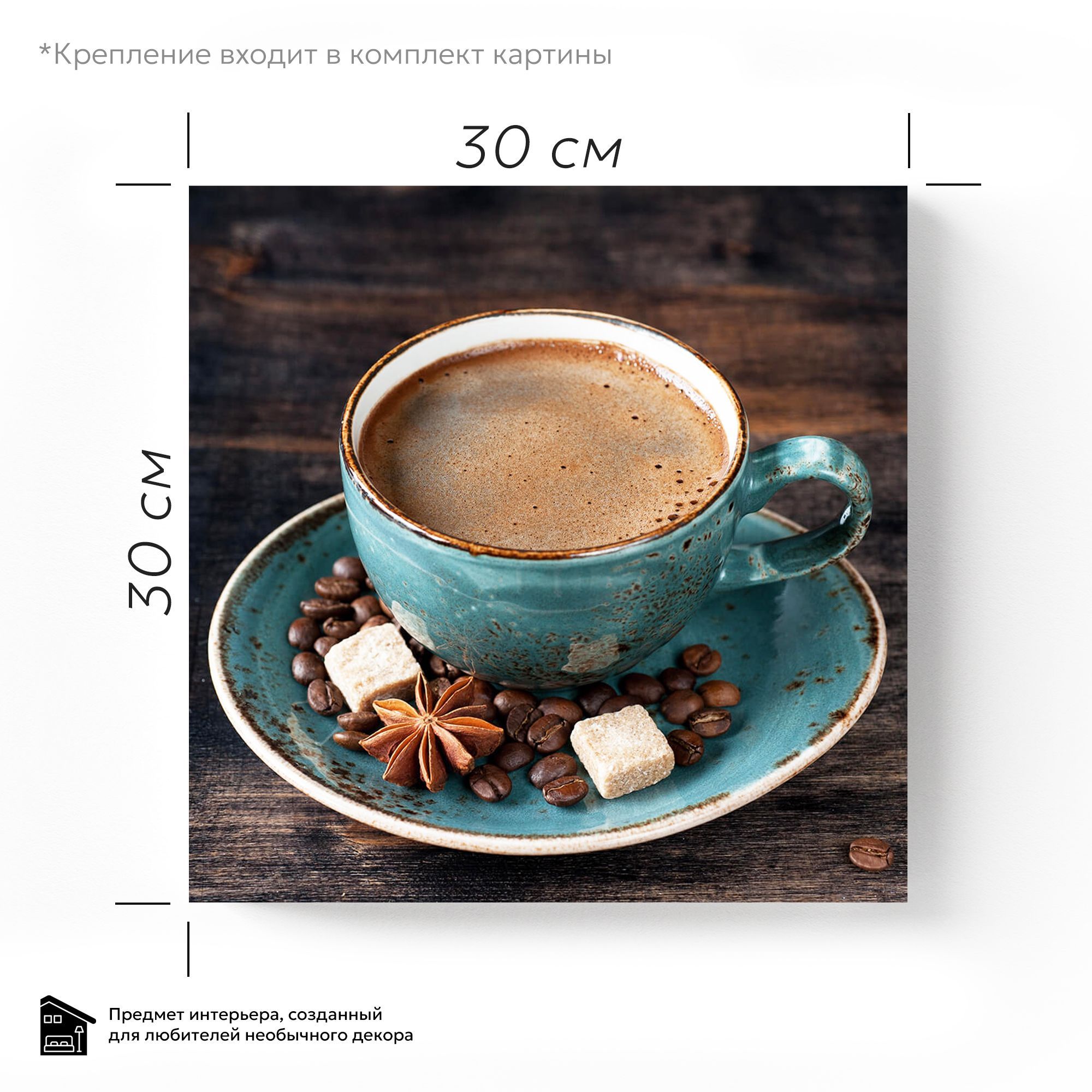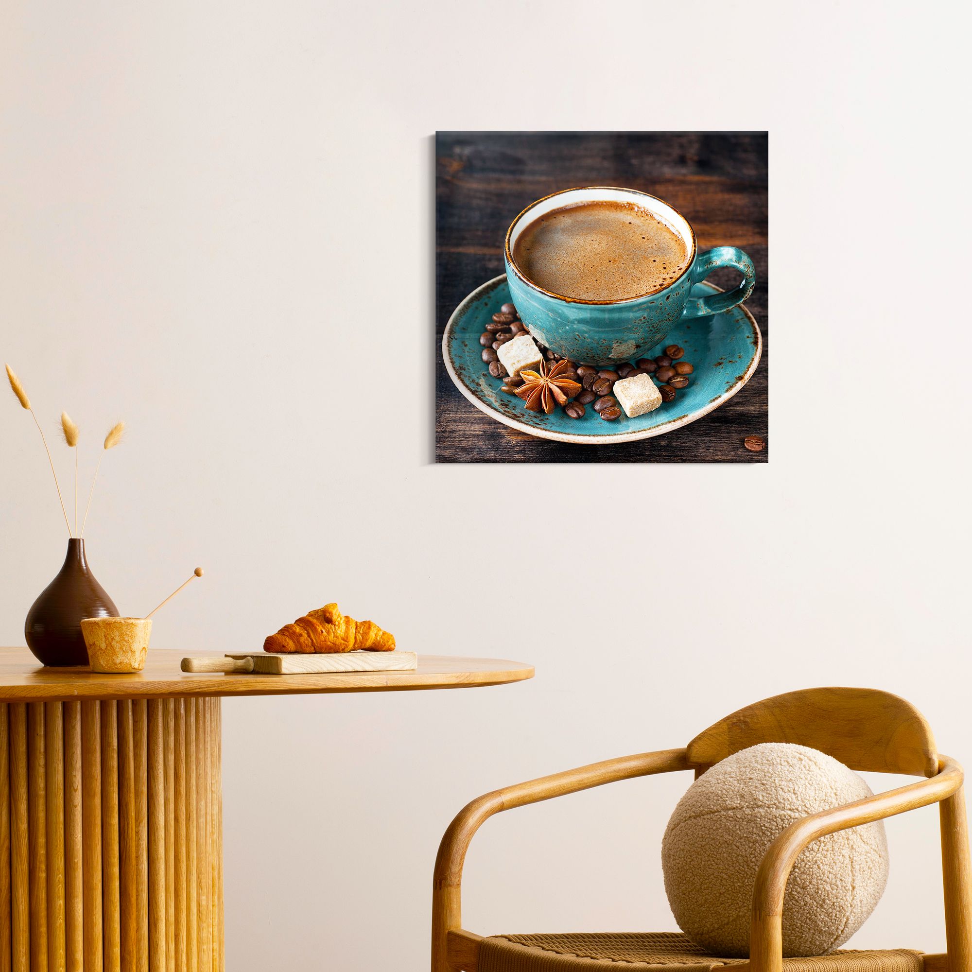 Перед нами изысканное изображение чашки ароматного кофе в старинной керамической посуде бирюзового оттенка с легкими потертостями, что придаёт ей особое очарование и теплоту. Пена на поверхности напитка выглядит бархатистой и гладкой, обещая насыщенный вкус и богатый аромат. На блюдце расположены кофейные зёрна, коричневые кубики тростникового сахара и звездочка бадьяна — этот изящный штрих пробуждает все чувства, наполняя атмосферу уютом и гармонией. Композиция выполнена в теплых, приглушённых тонах, а деревянный фон добавляет естественности и создает ощущение домашнего уюта. Эта картина на стекле идеально подойдет для создания в интерьере настроения расслабления и наслаждения простыми радостями жизни, символизируя моменты спокойствия и тепла.