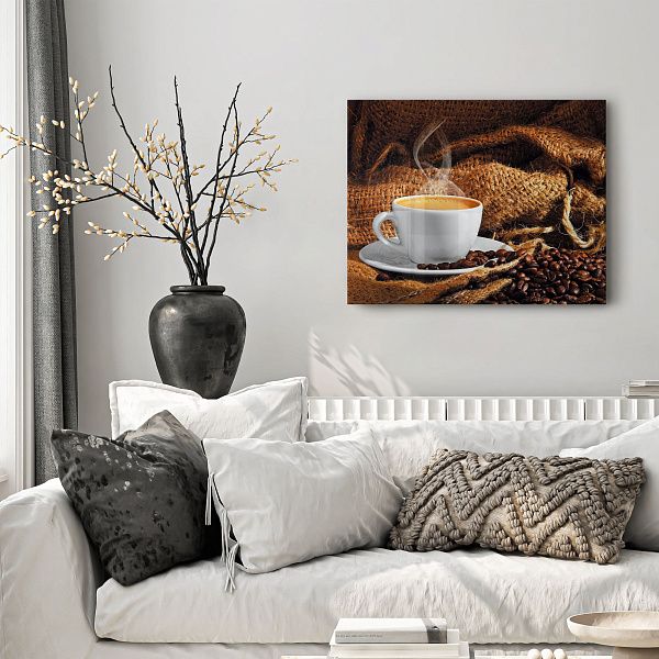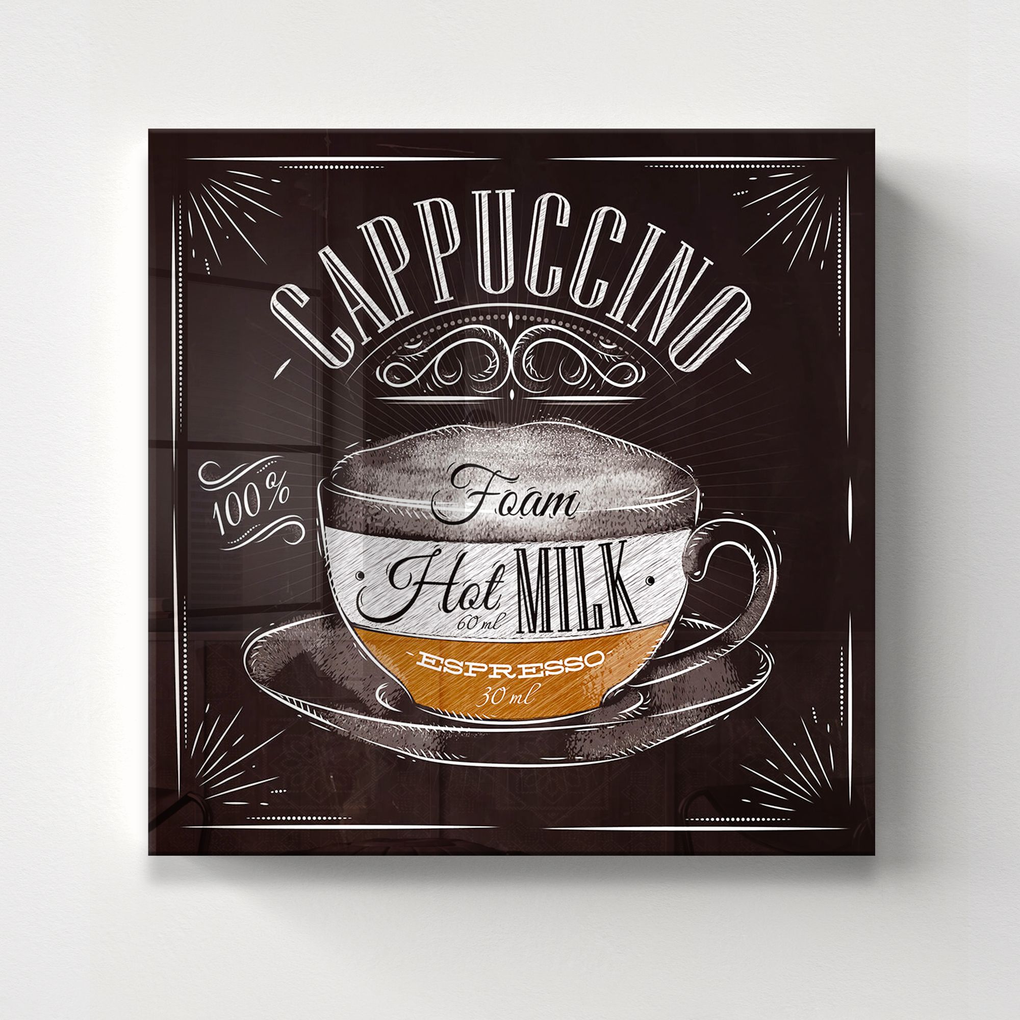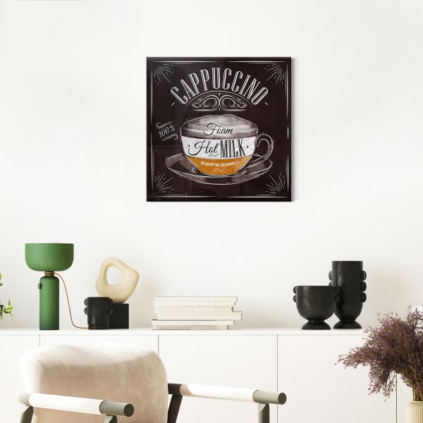 Изображение представляет собой стилизованную иллюстрацию в виде рисунка мелом на доске. Изображена наполненная чашка кофе американо. В верхней части изображения полукругом располагается надпись "AMERICANO" (Американо), выполненная белым шрифтом с засечками. Под ней находится декоративный элемент, напоминающий завитки. В центре изображения находится чашка кофе. Верхняя часть чашки заполнена жидкостью, обозначенной как "Water" (Вода) объемом 90 мл, а нижняя часть – "ESPRESSO" (Эспрессо) объемом 60 мл. Чашка стоит на блюдце. В левом верхнем углу изображения присутствует надпись "100%", также стилизованная под меловую. По углам изображения располагаются стилизованные солнечные лучи. Все изображение заключено в рамку, выполненную в виде пунктирной линии. Эта картина на стекле — идеальный выбор для тех, кто любит кофе не просто как напиток, а как философию . Она станет украшением кухни, кофейни, офиса или даже барной стойки — там, где ценятся качество, стиль и внимание к деталям. Она говорит о том, что идеальный баланс — это искусство, утро начинается не с будильника, а с чашки, которую хочется держать в руках. Поставьте ее там, где вы хотите вдохновиться, начните день с улыбкой и помните: даже в самом деле обычном напитке может быть целая вселенная вкуса, истории и красоты.