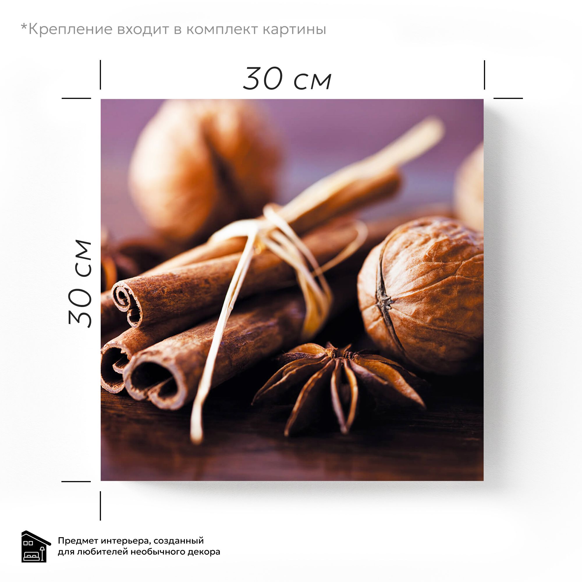 Завораживающая композиция застыла на стекле, словно пойманный момент тепла и уюта. Три палочки корицы, тесно перевязанные тонкой бечевкой, источают невидимый аромат предвкушения праздника. Их коричневые завитки, будто шепот древних легенд, манят к теплым напиткам и сладостям. Рядом, словно драгоценные камни, лежат крепкие грецкие орехи в шершавой скорлупе, хранящие свои тайны. Звезда аниса, раскинувшая свои лучи, добавляет композиции графичности и изысканности. Темно-коричневый фон, словно полированное дерево, подчеркивает теплоту и насыщенность красок. Свет играет на поверхности, создавая мягкие блики и тени, оживляя натюрморт. Эта картина на стекле – не просто изображение, это приглашение в мир ароматов, воспоминаний и предвкушения волшебства. Она станет прекрасным украшением любого интерьера, наполняя его теплом и уютом.