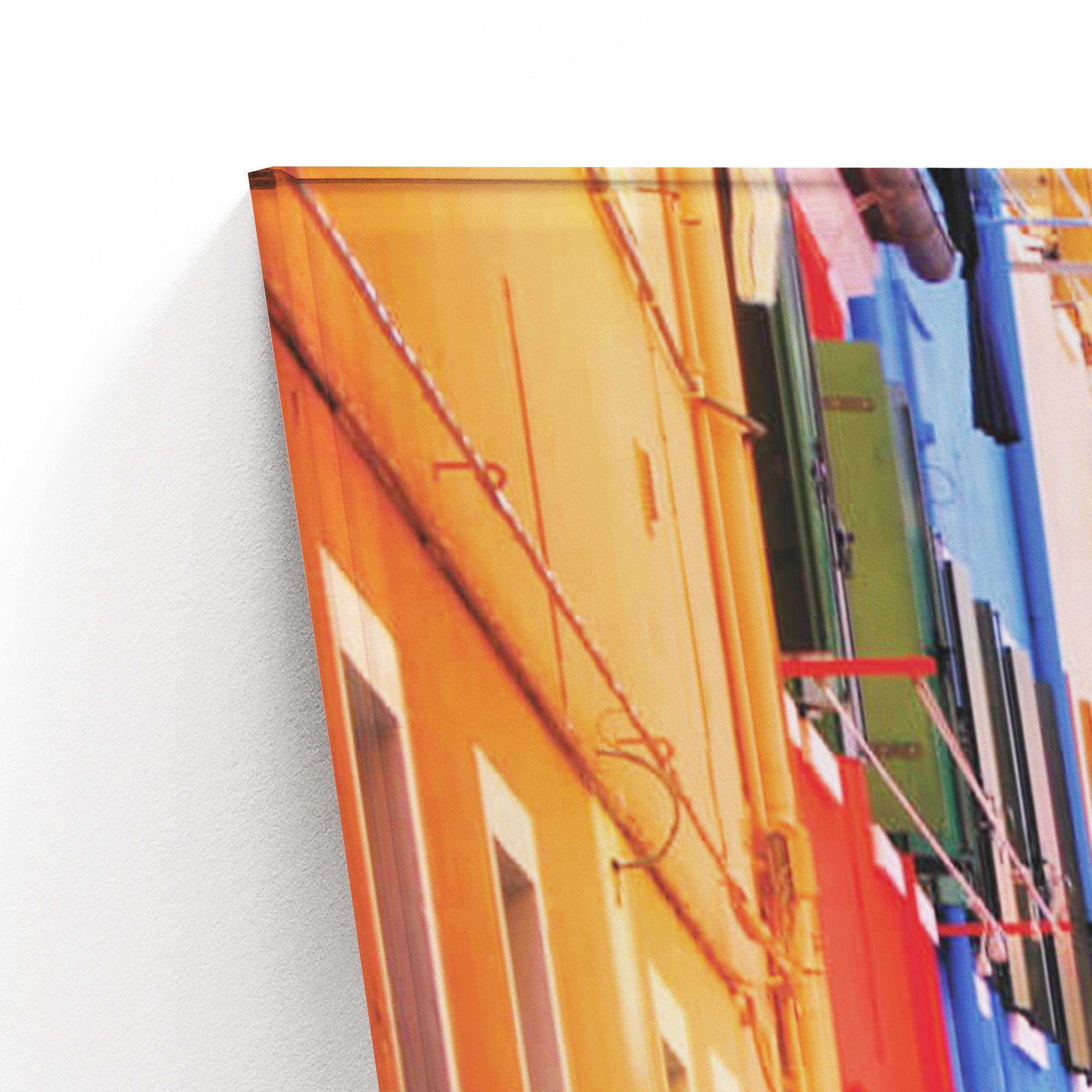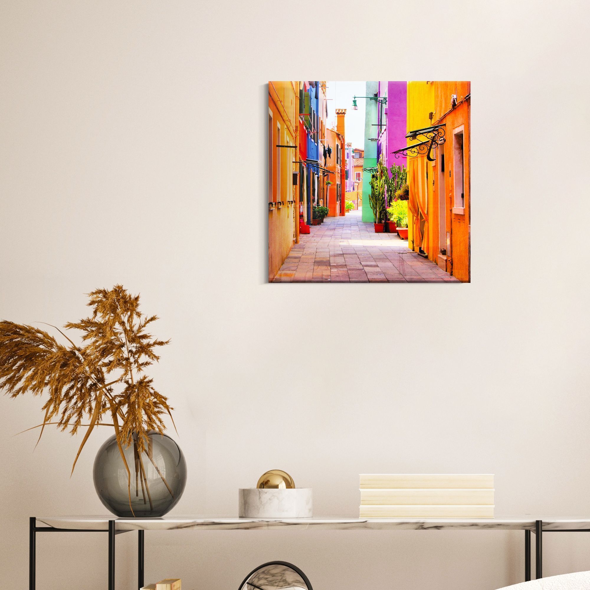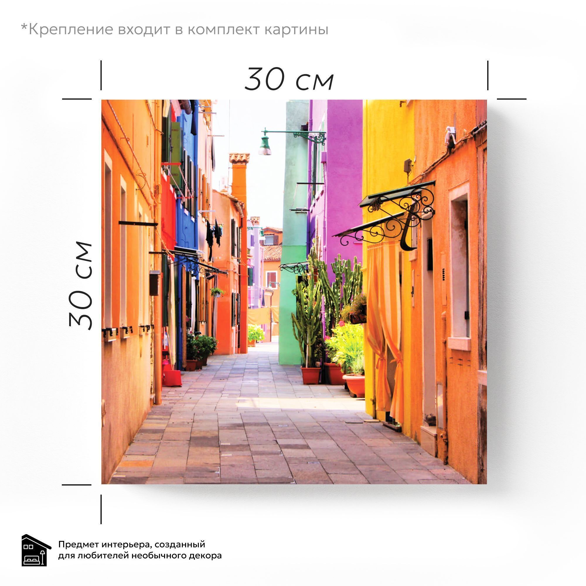 Перед нами живописный и солнечный улочек, наполненный яркими красками и жизнерадостной атмосферой. Домики справа и слева имеют разноцветные фасады — оранжевые, жёлтые, голубые, сиреневые и зелёные, создавая настоящий калейдоскоп оттенков, который отражает радость и тепло этого места. Узкая мощёная улица ведёт взгляд вглубь, словно приглашая прогуляться и окунуться в очарование повседневной жизни. Вдоль зданий расположены горшки с пышной растительностью — изящные кактусы и цветущие растения, что добавляет живости и уюта. Кованые козырьки над дверями и винтажные фонари подчёркивают неповторимый стиль и исторический шарм этой части города. Вдали виднеются красные черепичные крыши — классический элемент средиземноморского пейзажа. Эта картина напоминает о солнечных днях, лёгкости и простом человеческом счастье, заключённом в ярких цветах и уюте узких улочек древних городов, таких как Бурано или другие живописные уголки Италии. Она вдохновляет на радость жизни и путешествия, дарит ощущение тепла и гармонии.