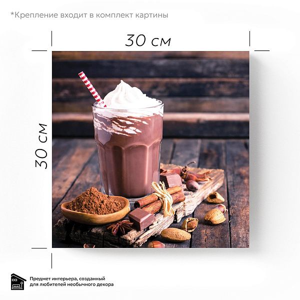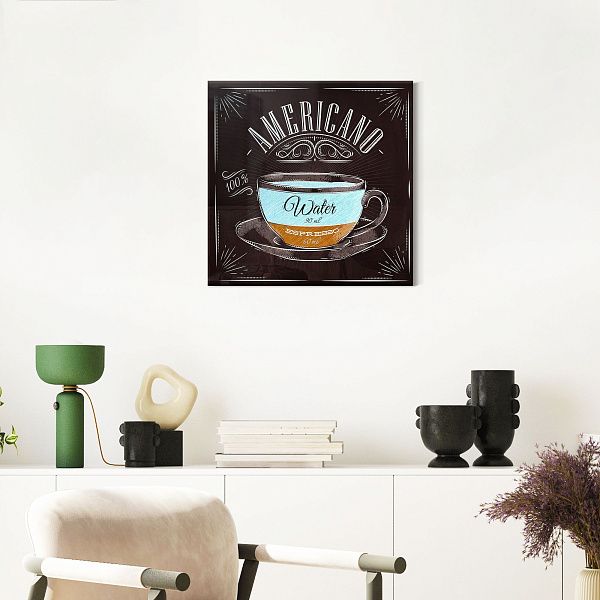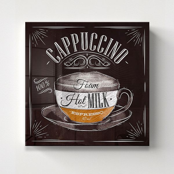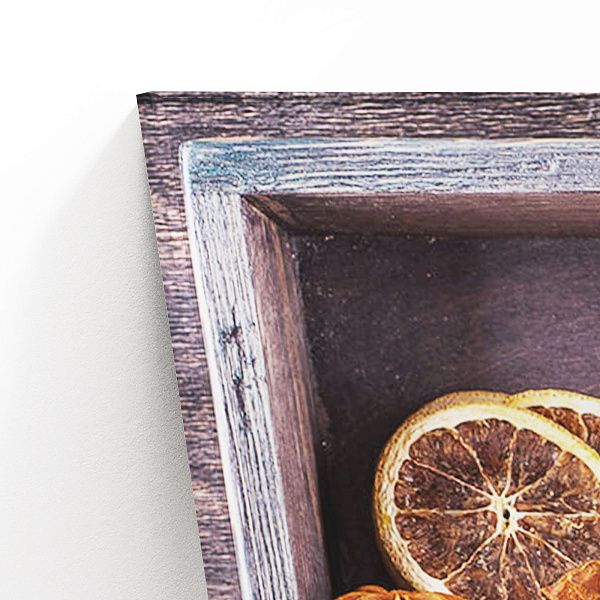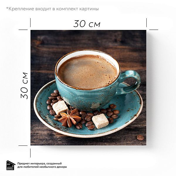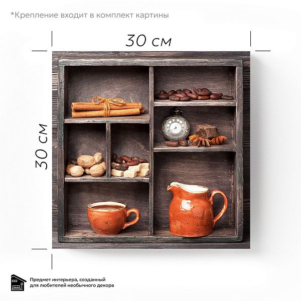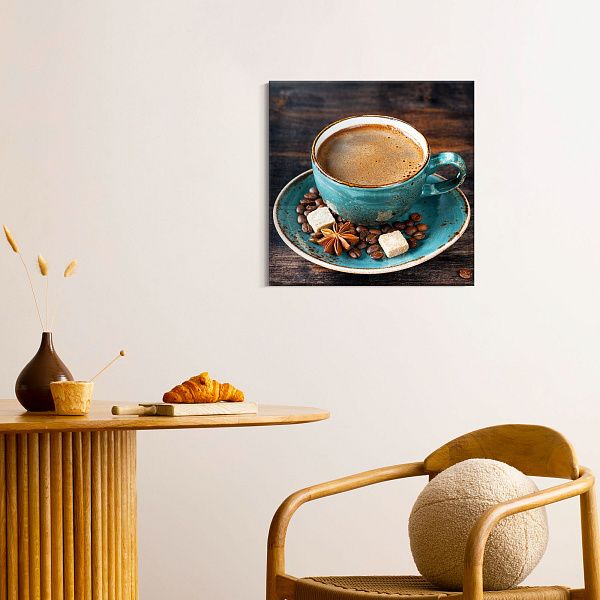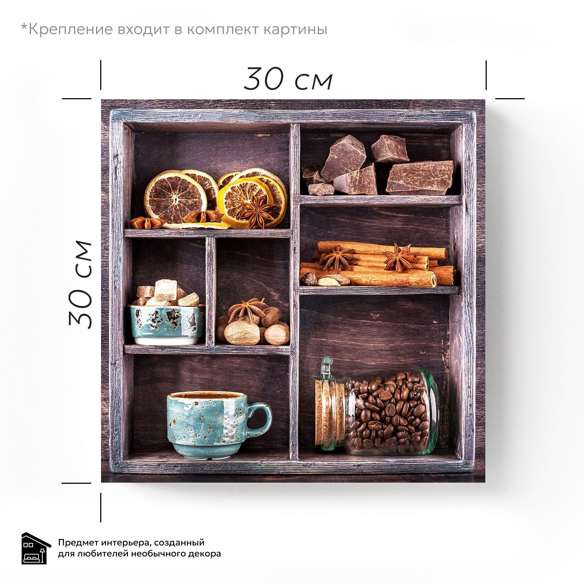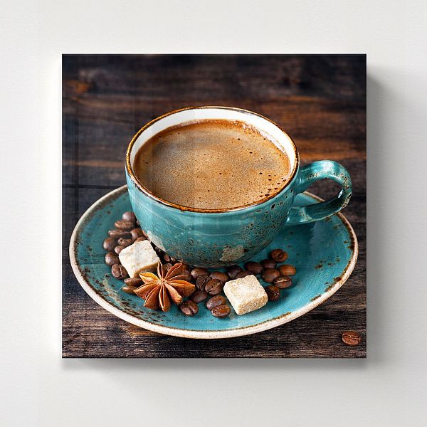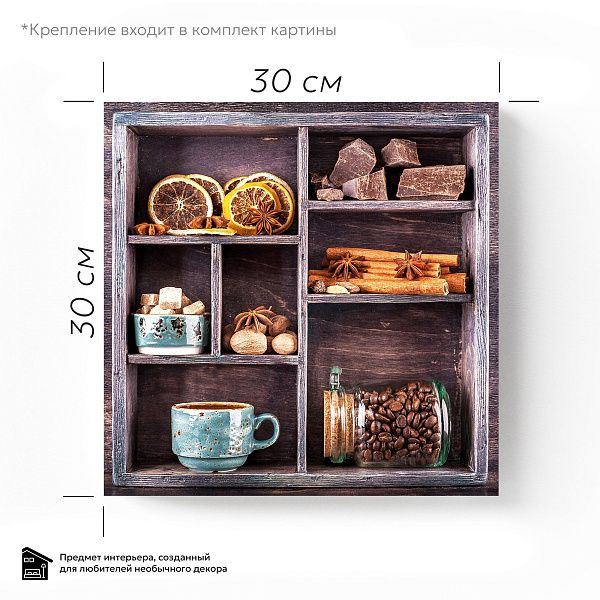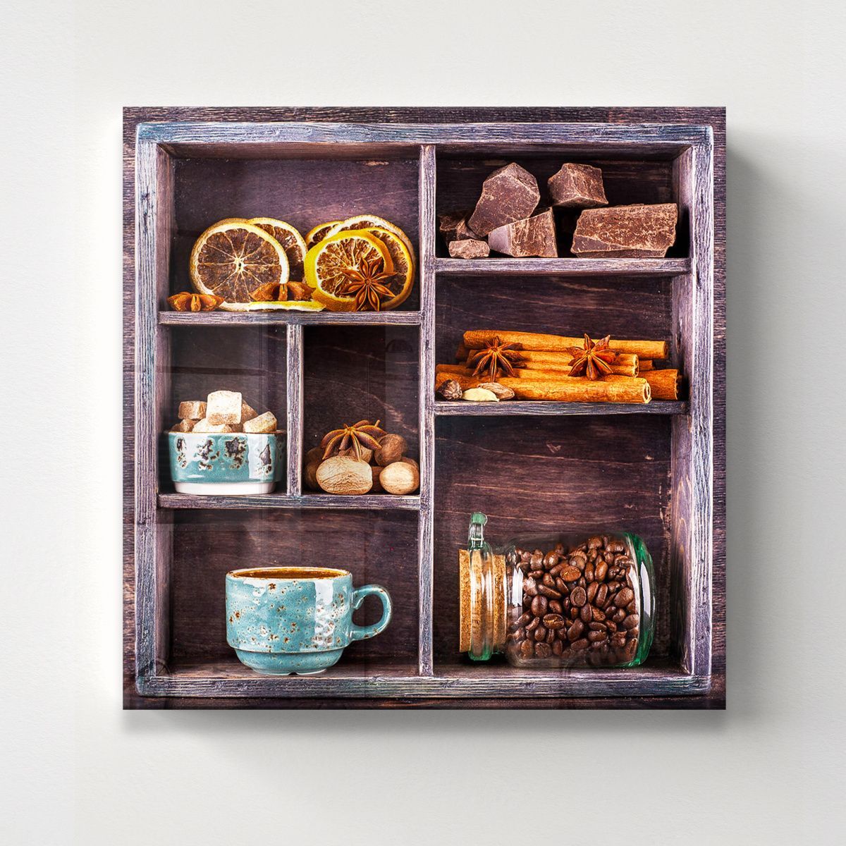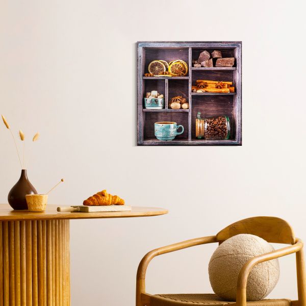 Перед нами гармоничная композиция, выполненная в виде деревянного секционного ящика с разнообразными ингредиентами, символизирующими уют и теплоту домашнего чаепития. В каждом отделении бережно расположены сушёные дольки цитруса, коричные палочки, звёздочки аниса, кусочки натурального шоколада, грецкие орехи и коричневый тростниковый сахар в изящной бирюзовой чашке. Нижние ячейки занимают керамическая чашка с горячим напитком и стеклянная банка с ароматными кофейными зёрнами. Темный древесный фон выделяет тёплые оттенки специй и натуральных продуктов, создавая атмосферу уюта и спокойствия. Эта картина на стекле — идеальное украшение для кухни или столовой, напоминая о простых радостях жизни, гармонии вкусов и ароматов, о моменте отдыха и наслаждения мелочами.