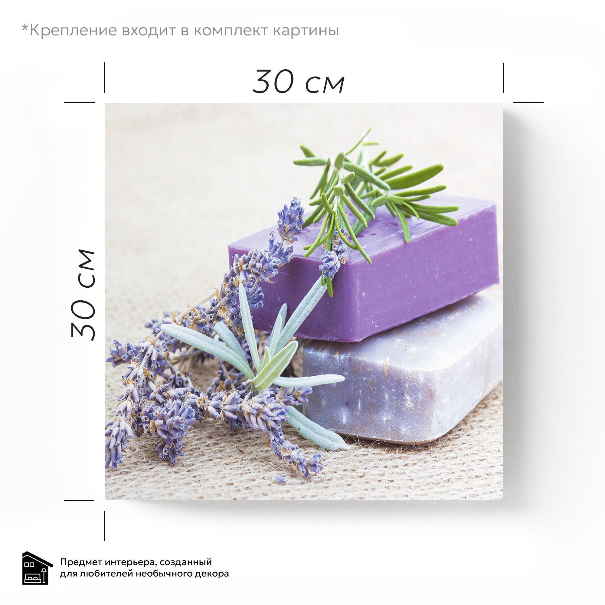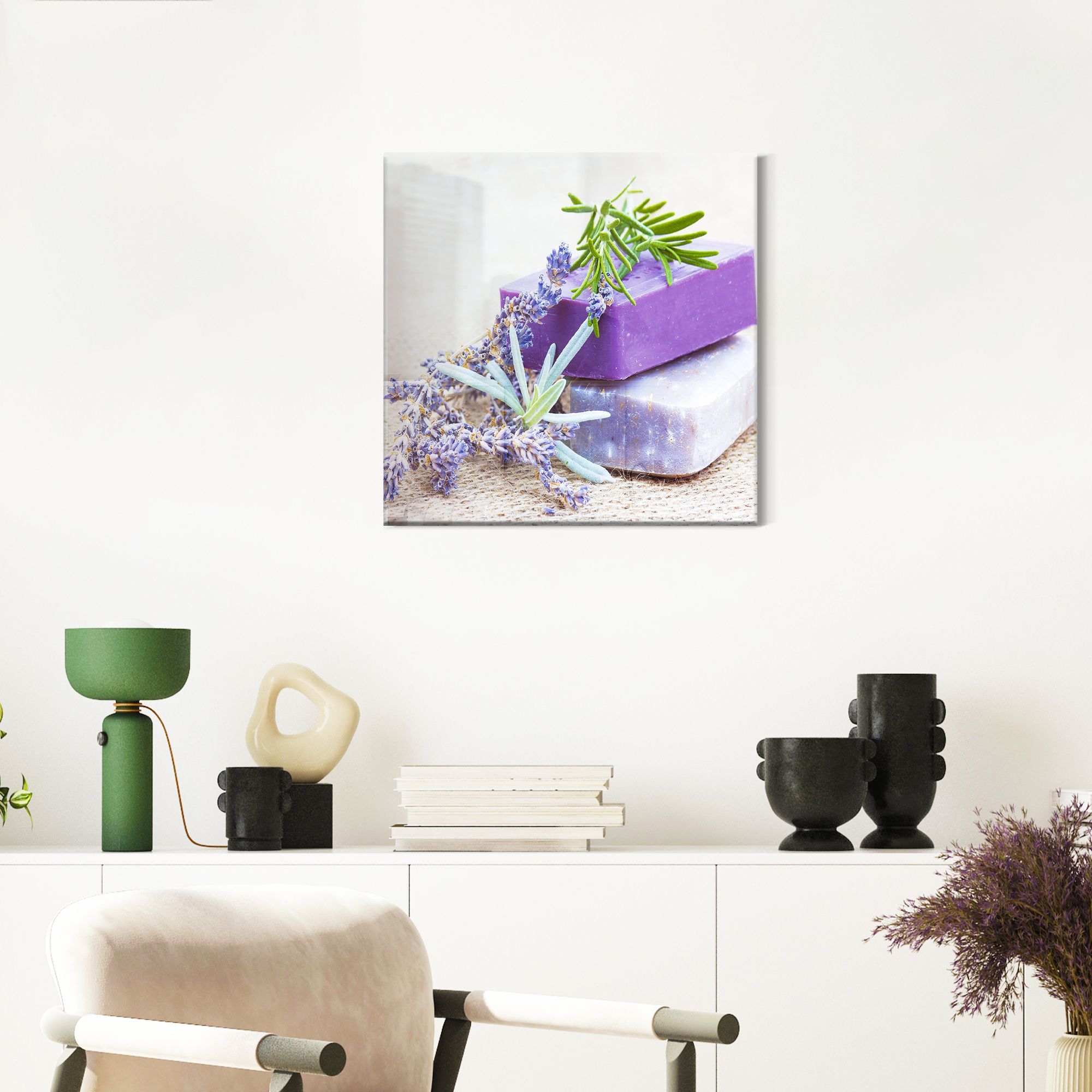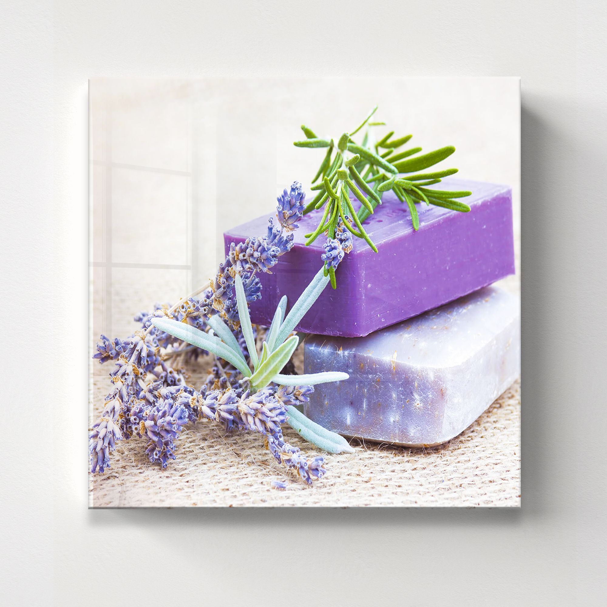 На изображении изображен натюрморт с природными элементами, расположенными на фактурной поверхности нейтрального тона. Основное внимание уделяется двум брускам мыла ручной работы, сложенным друг на друга. Верхний брусок насыщенного, сплошного фиолетового цвета, а нижний — более приглушённого, мраморного оттенка с оттенками серого и лавандового. Веточки свежего розмарина и сушеной лаванды, аккуратно разложенные на кусках мыла и вокруг них, добавляют композиции чувственной привлекательности. Яркие зеленые листья розмарина создают эффектный контраст с фиолетовым мылом, а сушеные цветы лаванды придают композиции деревенский, ароматный штрих. Текстурированный фон создает теплую и уютную атмосферу, подчеркивая общую эстетику композиции. Картина на стекле вызывает ощущение естественного благополучия и красоты ручной работы, предполагая акцент на органических ингредиентах и ​​ремесленных продуктах.