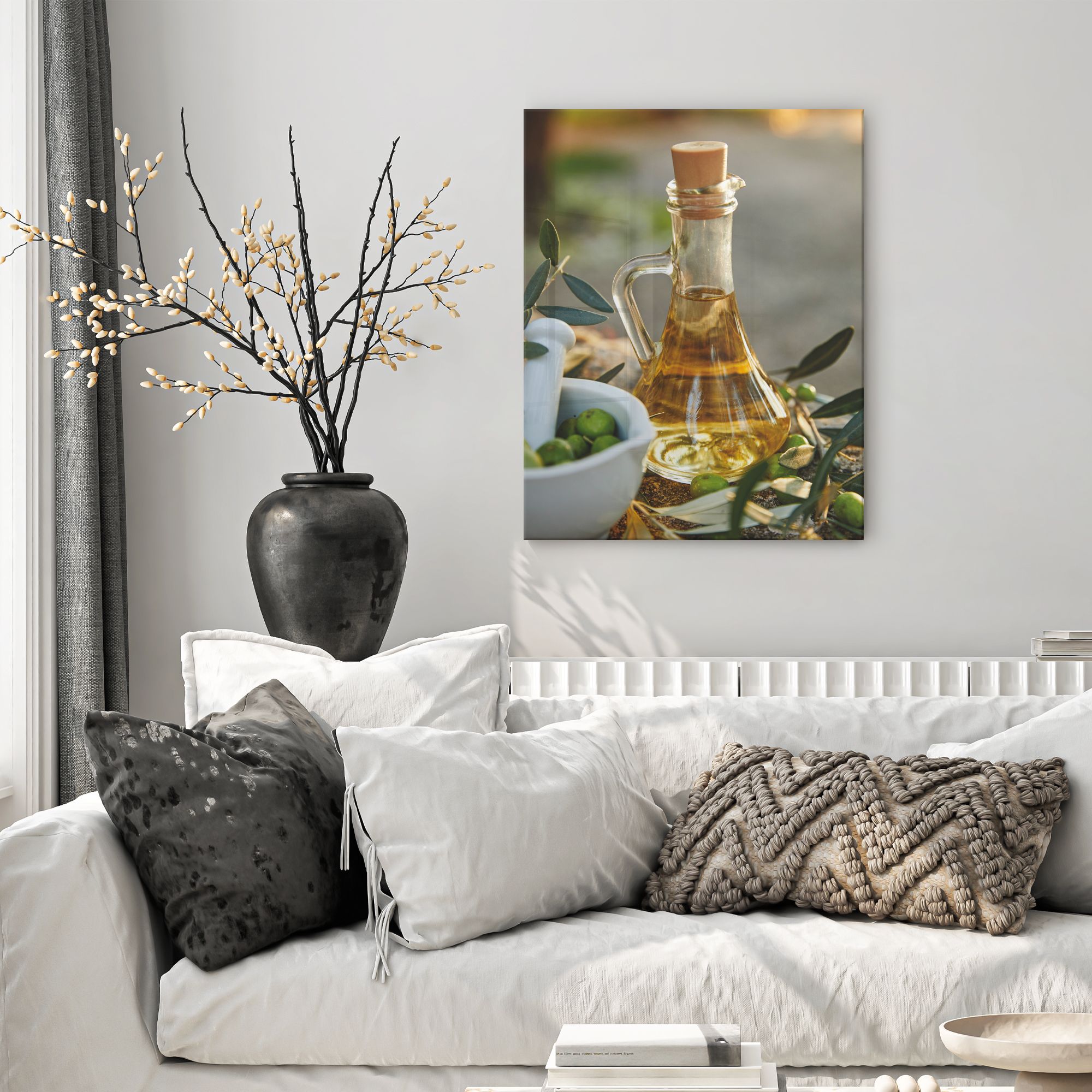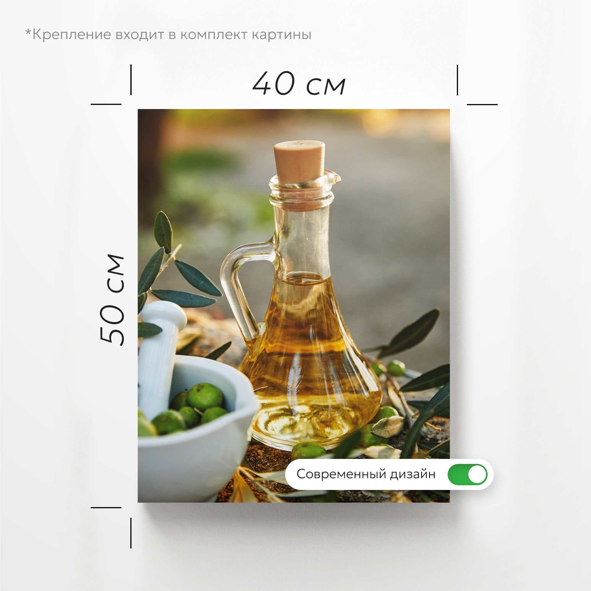 На картине изображена уютная, натуралистичная композиция, посвящённая теме оливкового масла и его природных истоков. Центральным элементом является стеклянный кувшин с ручкой, наполненный золотистым оливковым маслом, закрытый деревянной пробкой. Кувшин выглядит массивно и аутентично, его прозрачность подчёркивает насыщенный цвет масла. Вокруг кувшина расположены: Ступка с пестиком белого цвета, частично заполненная зелёными оливками — добавляет композиции практичности и намёк на процесс приготовления. Свежие оливки разного размера, разбросанные у основания кувшина и вокруг ступки — создают ощущение изобилия и свежести. Ветви оливкового дерева с характерными удлинёнными листьями — обрамляют композицию, подчёркивая её природную тематику. Фон размытый, с тёплыми солнечными оттенками, создающими атмосферу средиземноморского пейзажа. Общее настроение картины — спокойствие, натуральность, связь с природой и традициями. Тёплые золотистые и зелёные тона вызывают ассоциации с южным солнцем, здоровым питанием и домашней кухней.