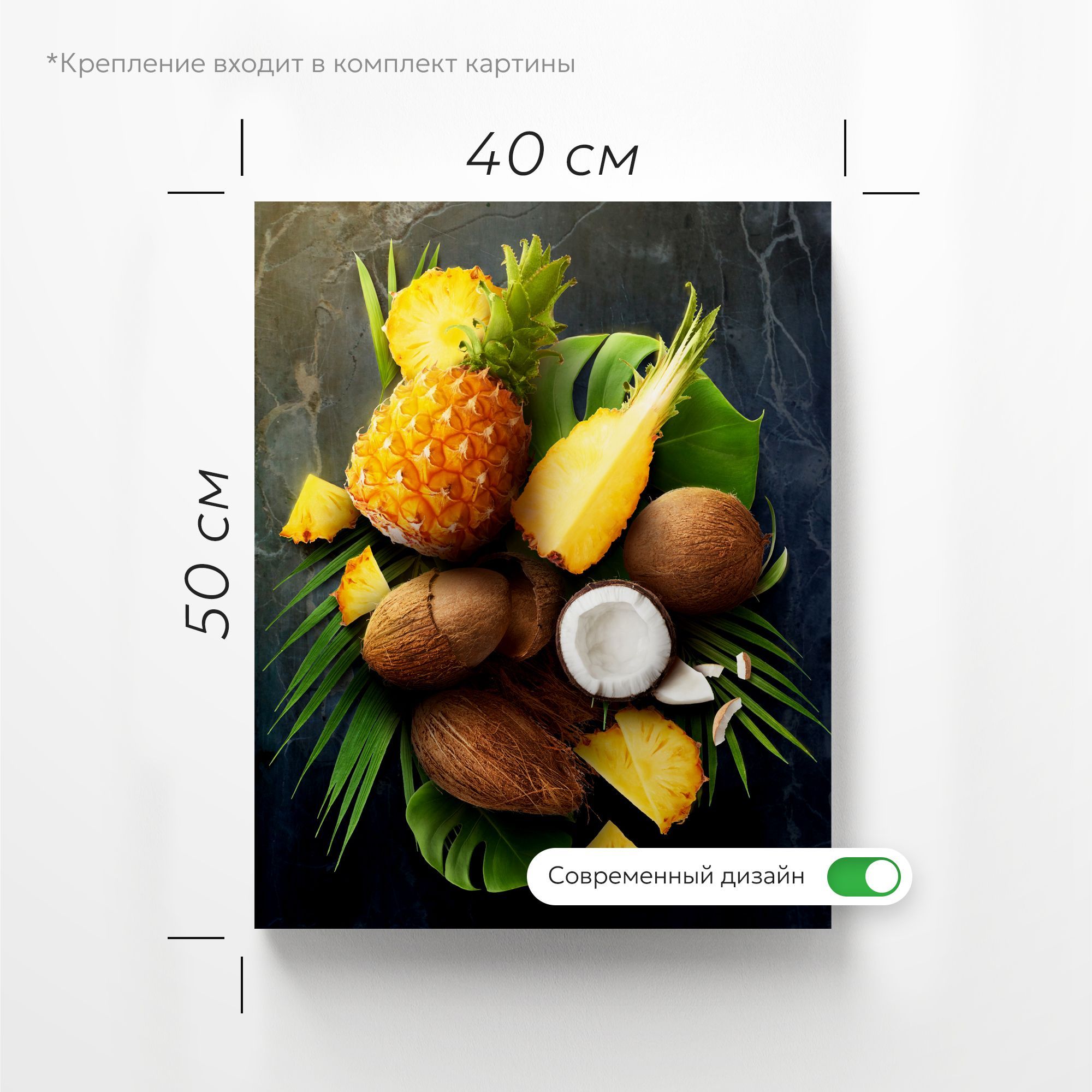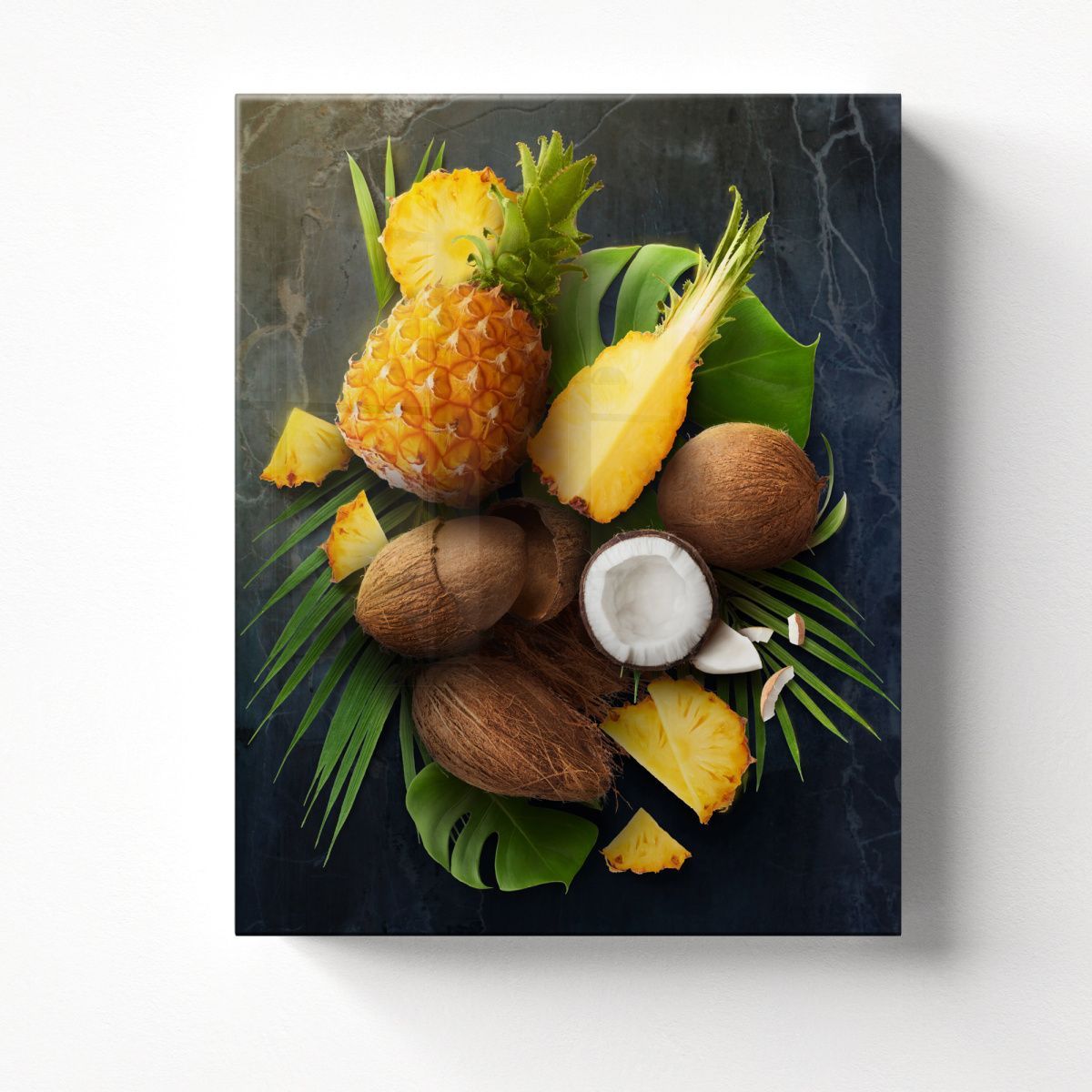 На картине, выполненной на стекле, изображена яркая и сочная композиция из тропических фруктов и зелени. Центральным элементом является целый ананас с золотисто-жёлтой кожурой, украшенной характерным ромбовидным узором. Рядом с ним — аккуратно нарезанные ломтики ананаса, которые демонстрируют нежную, сочную мякоть насыщенного жёлтого цвета. В композиции также присутствуют кокосы: одни — в целой скорлупе с шероховатой коричневой поверхностью, другие — расколоты, открывая белоснежную мякоть внутри. Один из кокосов разрезан так, что видна его полостная структура, а рядом лежат небольшие кусочки кокосовой стружки. Композицию дополняют пышные зелёные листья: длинные, тонкие пальмовые листья и крупные листья монстеры. Они создают ощущение тропического изобилия, обрамляют фрукты и добавляют контраст тёплым оттенкам ананаса и кокоса. Фон картины выполнен в тёмных, приглушённых тонах с мраморной текстурой, что подчёркивает яркость фруктов и зелени, создаёт глубину и акцентирует внимание на главных элементах. Вся сцена выглядит очень живо и аппетитно, словно приглашает окунуться в атмосферу экзотического рая. Картина сочетает в себе свежесть, сочность и природную эстетику тропических плодов.