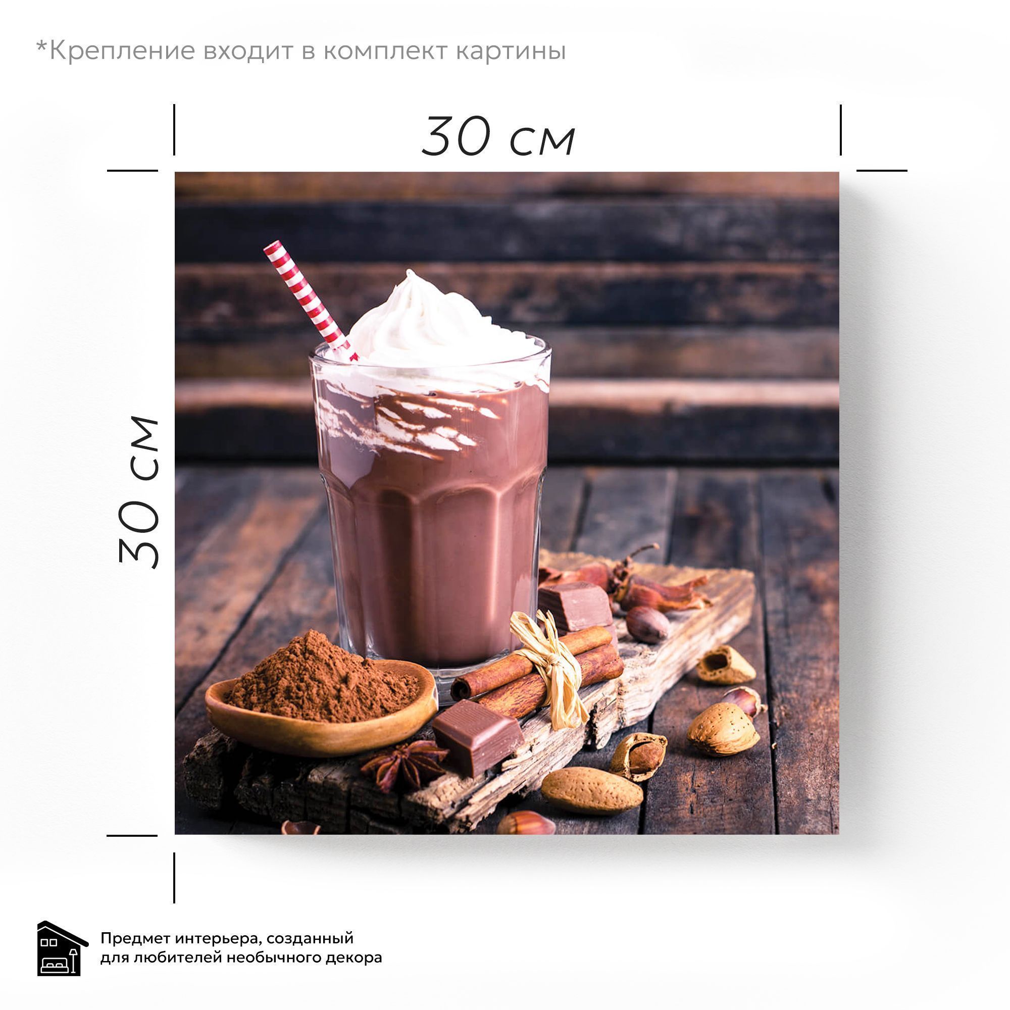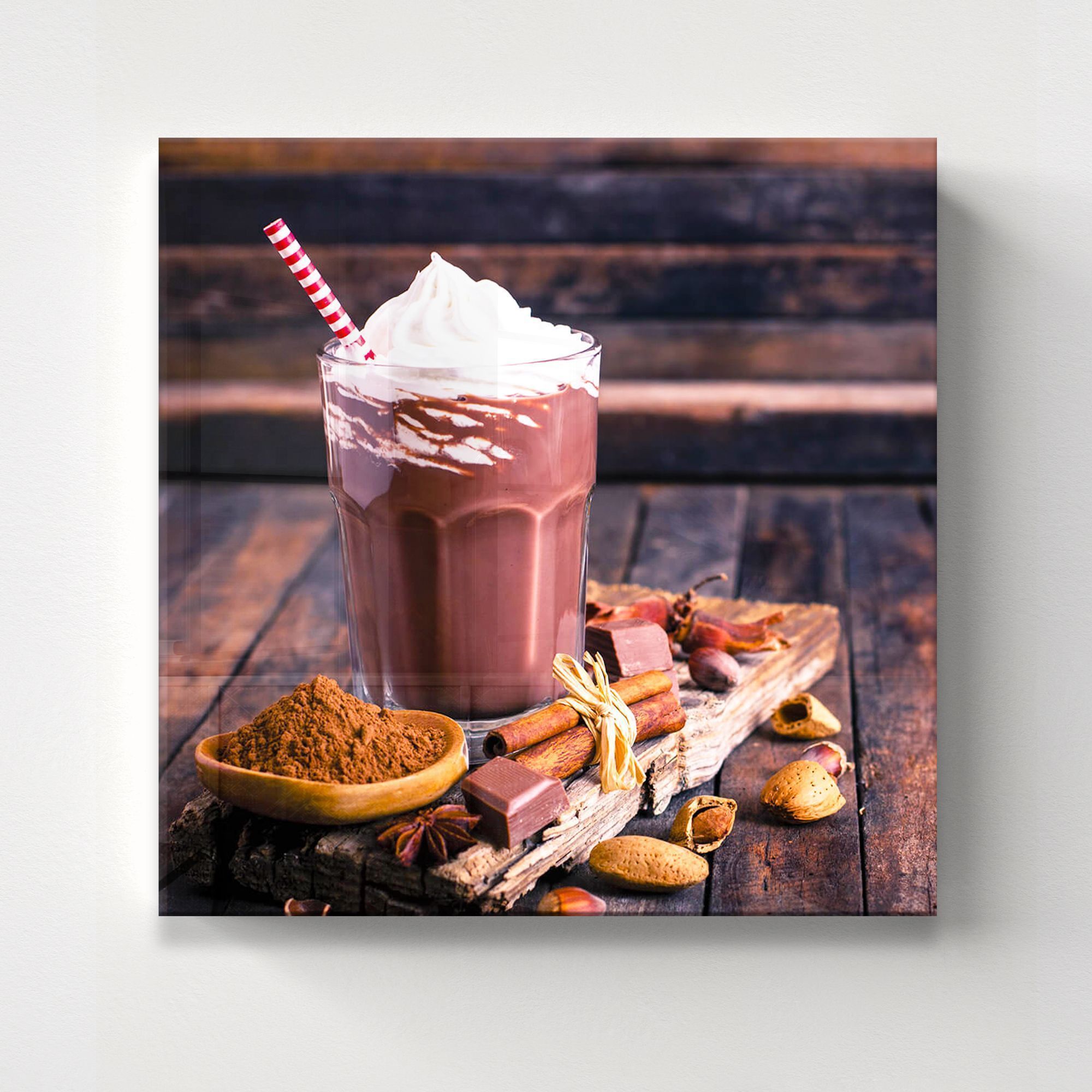 Эта изысканная картина на стекле представляет собой аппетитный и уютный натюрморт, который переносит в атмосферу тёплых вечеров и наслаждения маленькими радостями жизни. В центре композиции — прозрачный стакан с роскошным горячим шоколадом, украшенным густой и пышной шапкой взбитых сливок. Красно-белая полосатая трубочка придаёт образу свежесть и игристость, будто приглашая нас сделать глоток этого восхитительного напитка. Рядом с напитком аккуратно расположены ароматные палочки корицы, кусочки тёмного шоколада и горсть орехов, создавая ощущение глубины вкуса и богатства текстур. Натуральное деревянное подставка и фон из состаренной тёмной древесины усиливают тёплую, домашнюю атмосферу, будто этот момент застыл в уютном уголке с мягким светом. Картина выполнена с высокой детализацией и реализмом, что особенно эффектно смотрится на стекле, добавляя мерцание и игру света, делает изображение живым и притягательным. Такое произведение станет великолепным украшением кухни, кафе или гостиной, даря уют и вдохновение.
