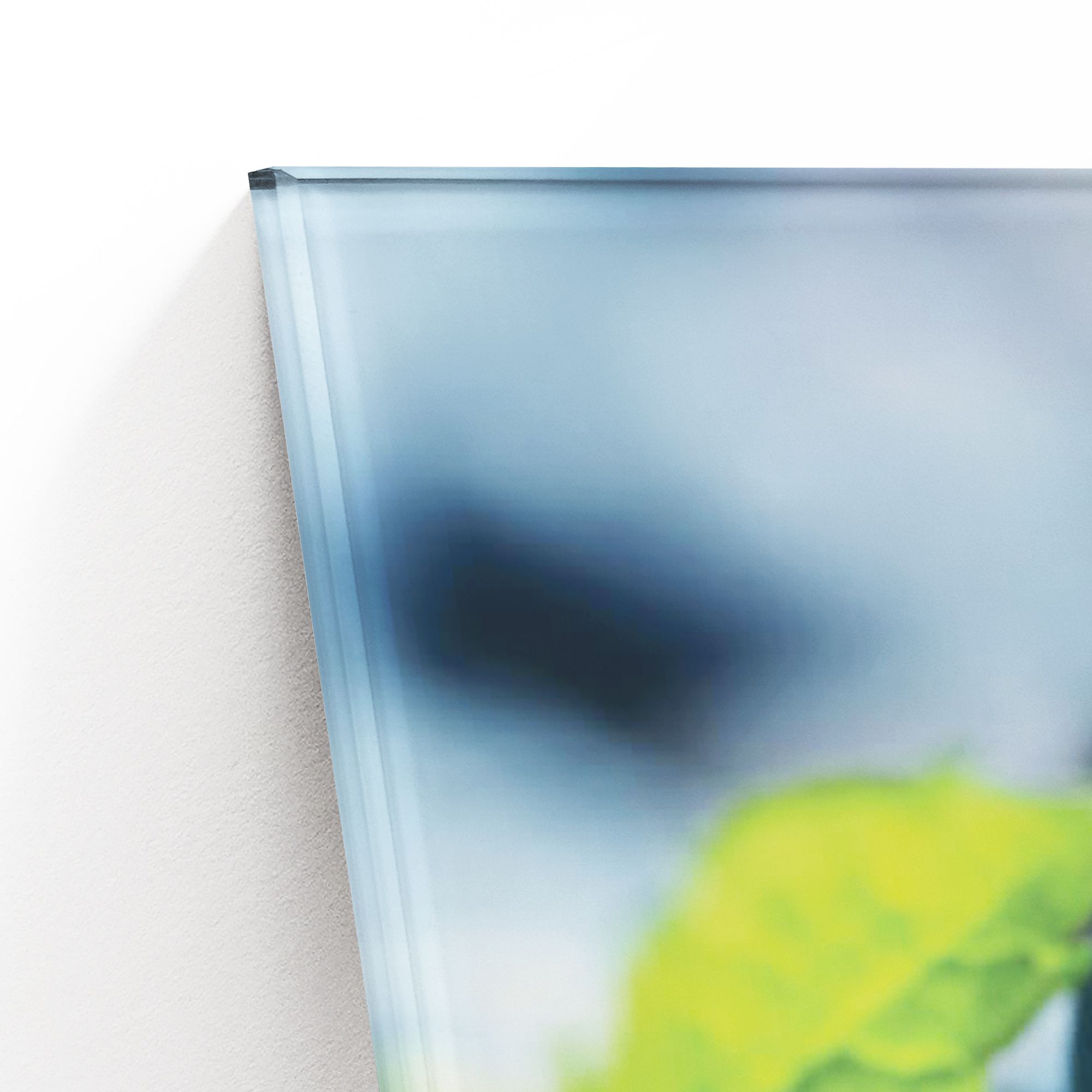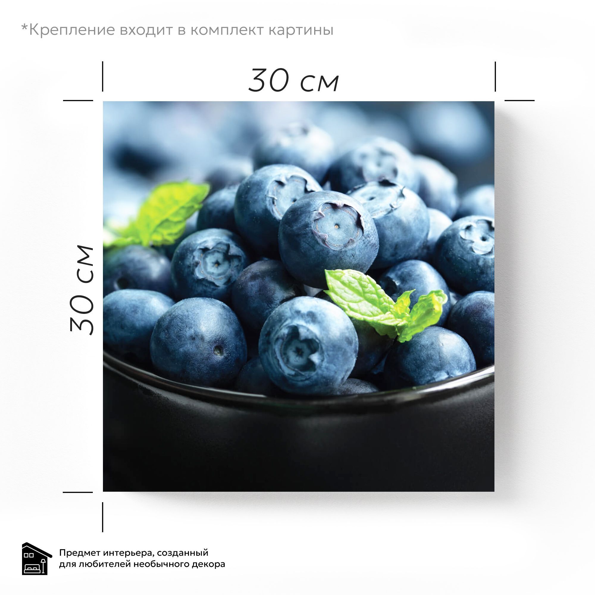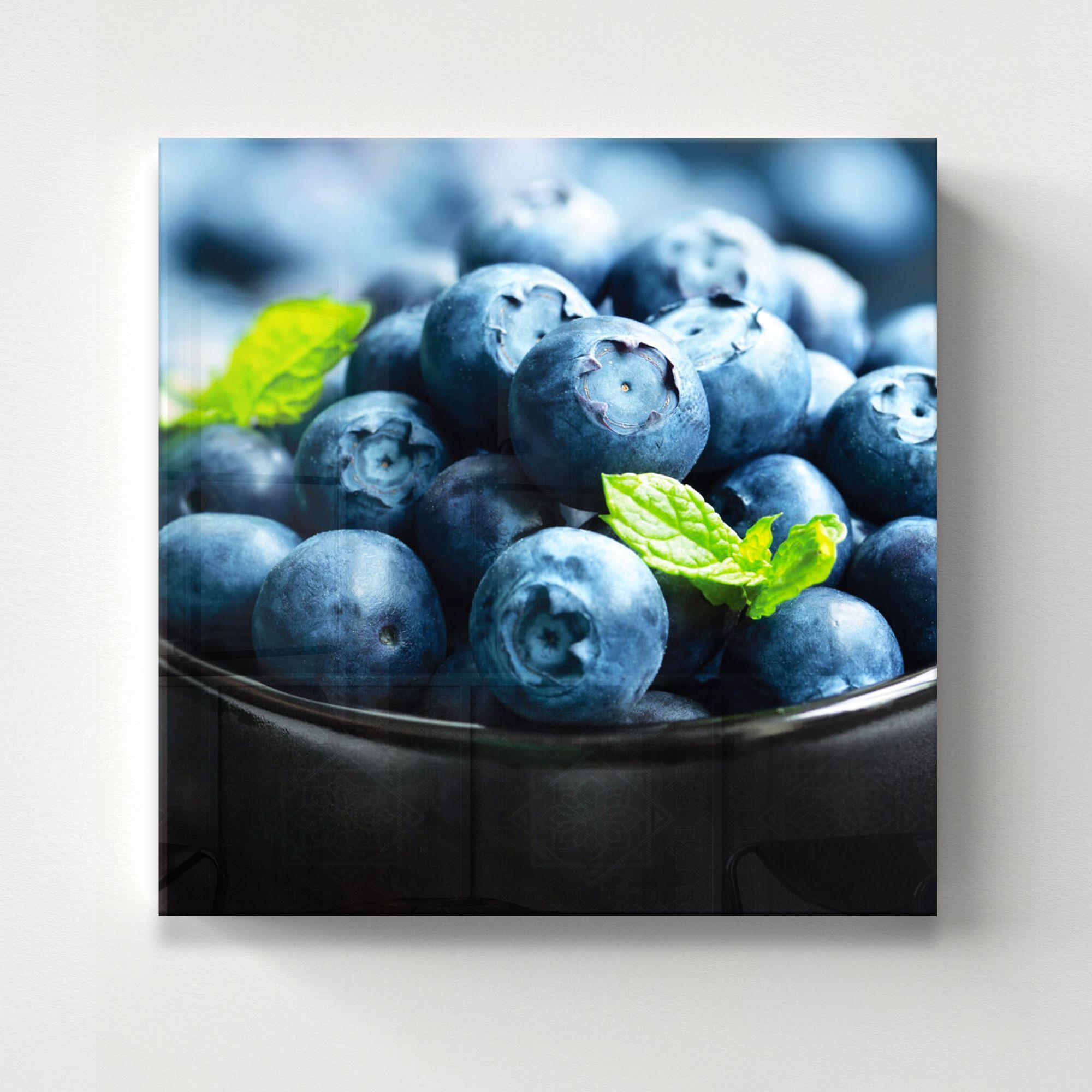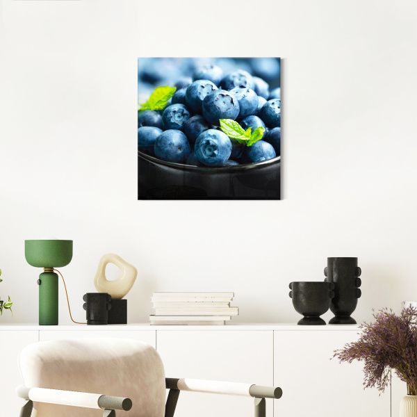 Эта яркая и насыщенная картина представляет собой изысканное макро-изображение сочных, спелых ягод черники, аккуратно сложенных в чёрной миске. Каждый ягодный плод прорисован с потрясающей детальностью: нежная матовость кожуры, тонкие естественные прожилки и характерная коронка у верхушки ягод передают всё многообразие природной красоты и свежести. Глубокий насыщенный синий цвет, переходящий в лёгкий фиолетовый оттенок, контрастирует с яркими зелёными листиками мяты, придавая композиции живость и свежесть. Картина словно приглашает зрителя ощутить вкус и аромат летнего сада, напоминая о простых радостях природы и пользе ягод — богатых антиоксидантами, витаминами и минералами. Такой рисунок на стекле будет идеален для кухни или столовой, добавляя обстановке яркость и атмосферу уюта.