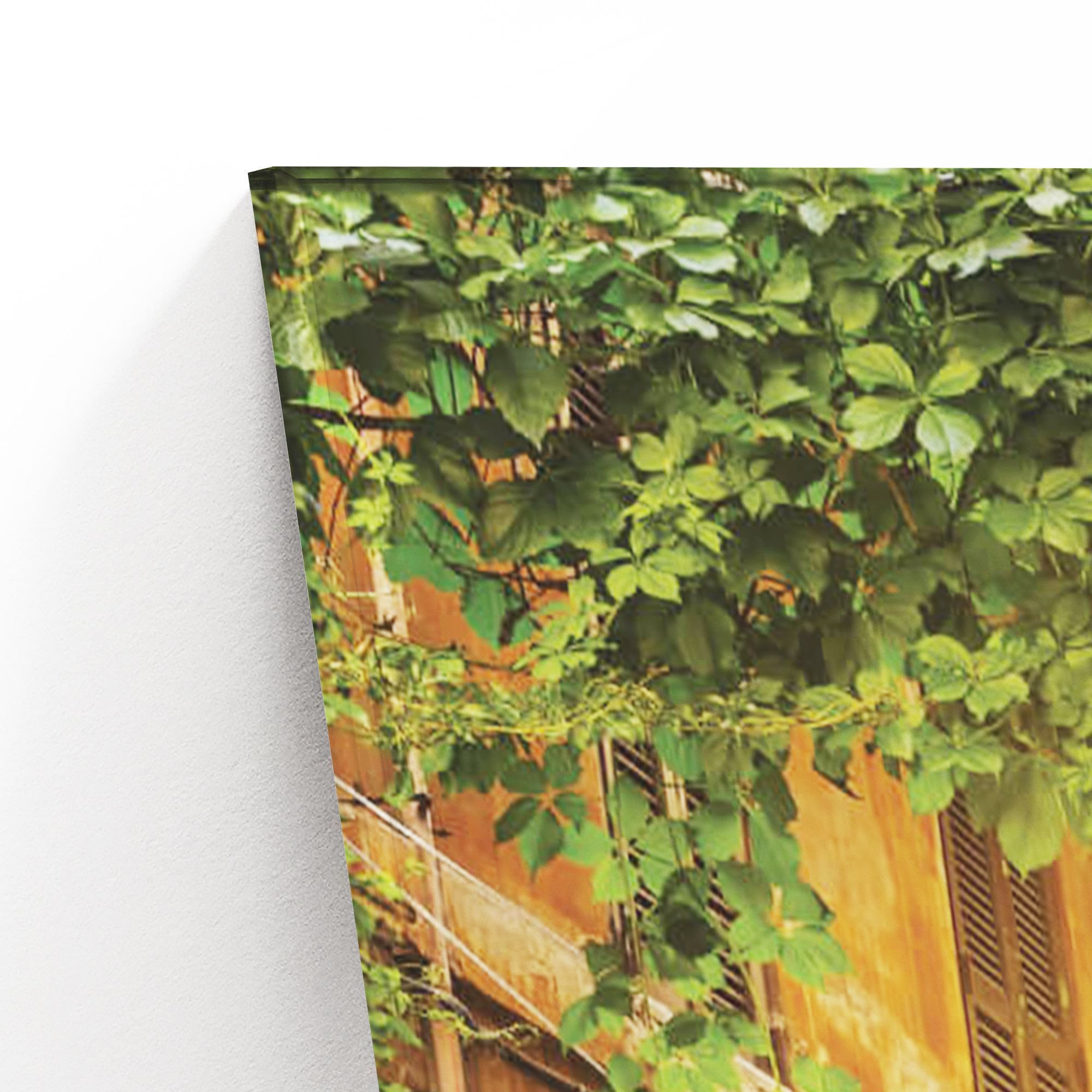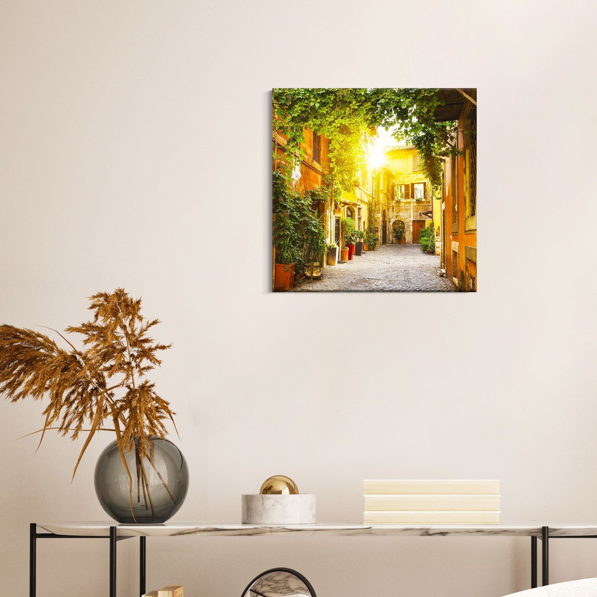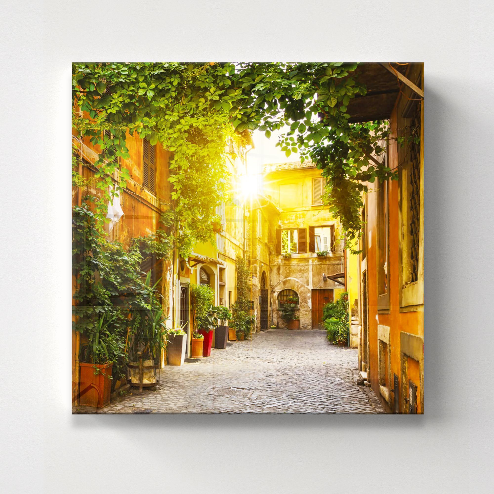 Эта картина на стекле захватывает теплую атмосферу узкой живописной улочки в старинном европейском городе, окутанную золотистыми лучами заходящего солнца. Каменная мостовая, выложенная аккуратной брусчаткой, ведёт взгляд внутрь уютного дворика, где стены домов окрашены в тёплые оттенки охры, терракоты и мягкого жёлтого. Зелёные лианы нежно обвивают фасады зданий и свисают сверху, создавая естественную зелёную арку, через которую пробивается свет, наполняя пространство мягким светом и теплом. Горшки с разнообразными растениями придают живость и рассказывают историю домашнего уюта и заботы. Картина словно приглашает на прогулку по тихим улочкам, пробуждая чувства умиротворения, гармонии с природой и волшебства простых моментов жизни. Она станет стильным и вдохновляющим акцентом интерьера, создавая ощущение солнечного дня и безмятежности в любом помещении.