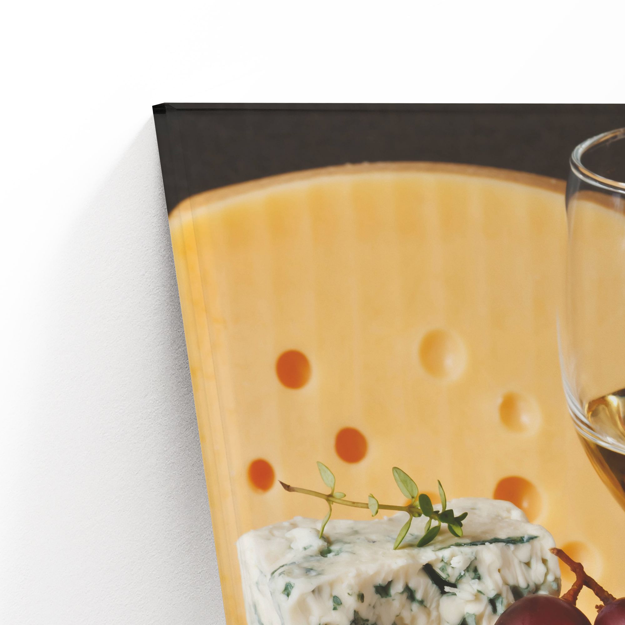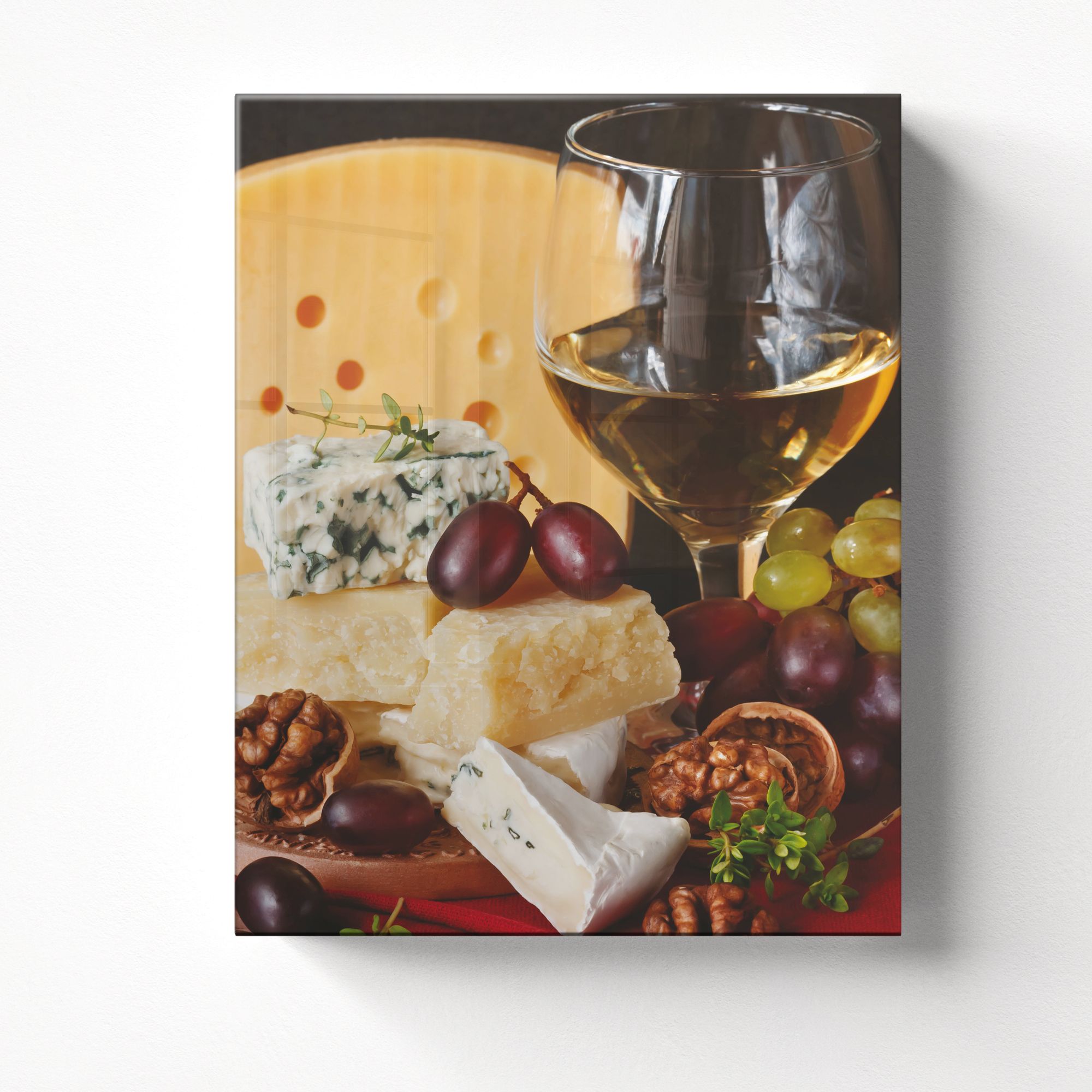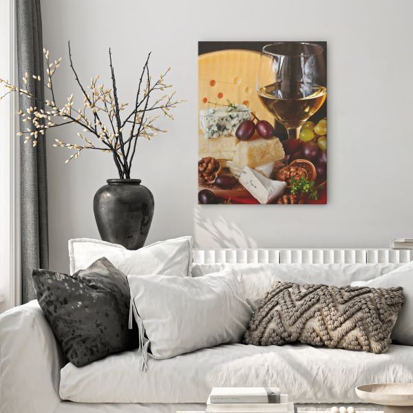 На картине искусно изображена аппетитная композиция, посвящённая гастрономической теме. Центральное место занимает бокал белого вина, наполненный до половины, который притягивает взгляд своей элегантностью. Вокруг бокала искусно разложены разнообразные сорта сыра: крупный кусок жёлтого сыра с характерными отверстиями служит эффектным фоном; кусочки твёрдого жёлтого сыра с зернистой текстурой; нежный сыр с белой коркой; голубой сыр с выразительными прожилками плесени. Дополняют композицию: гроздья винограда насыщенного фиолетового и зелёного оттенков — добавляют свежести и колорита; расколотые грецкие орехи, подчёркивающие природную эстетику; веточки свежей зелени тимьяна — создают ощущение натуральности и завершённости образа. Вся композиция размещена на фоне красной ткани, что придаёт картине теплоту и подчёркивает богатство цветов продуктов. Реалистичность изображения, игра света и текстуры делают картину очень живой и аппетитной. На кухне создаст атмосферу уюта и гастрономического вдохновения, особенно в интерьере в стиле прованс, кантри или современной классики.
