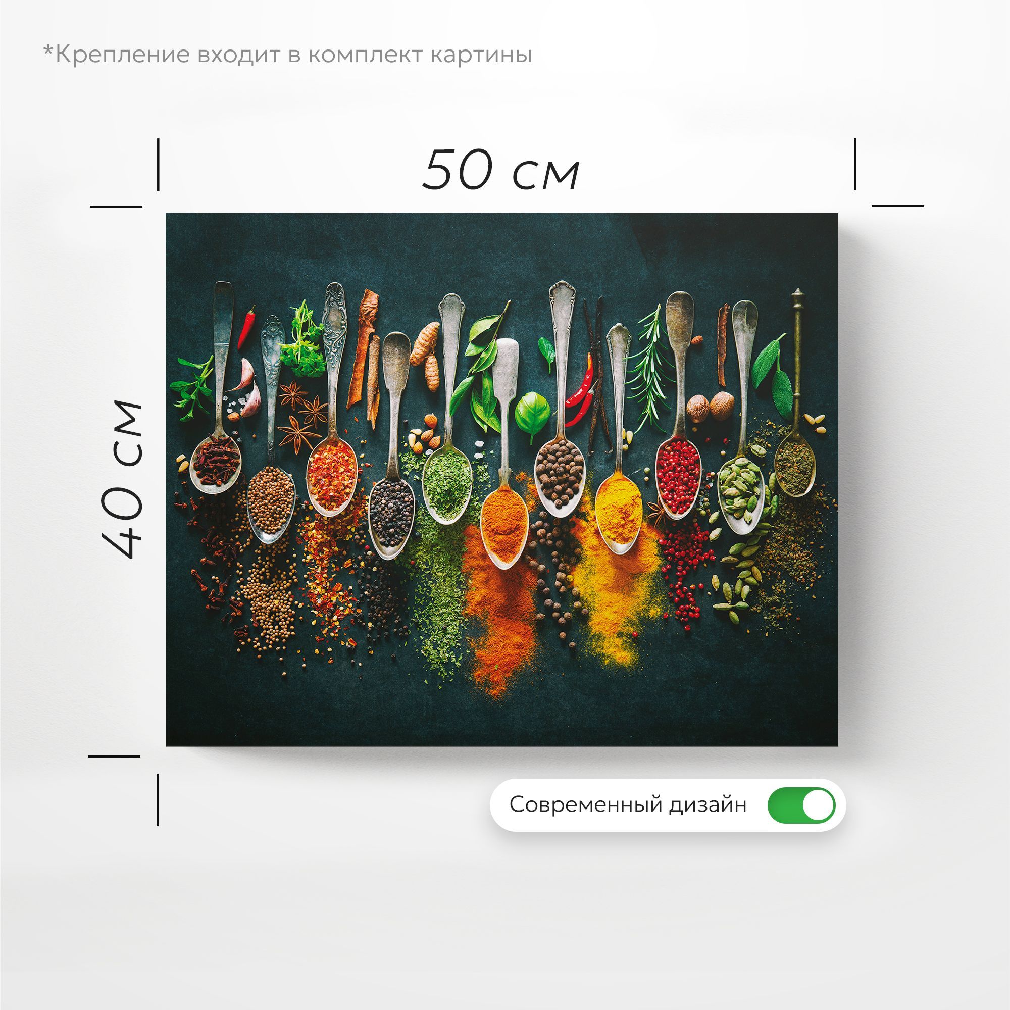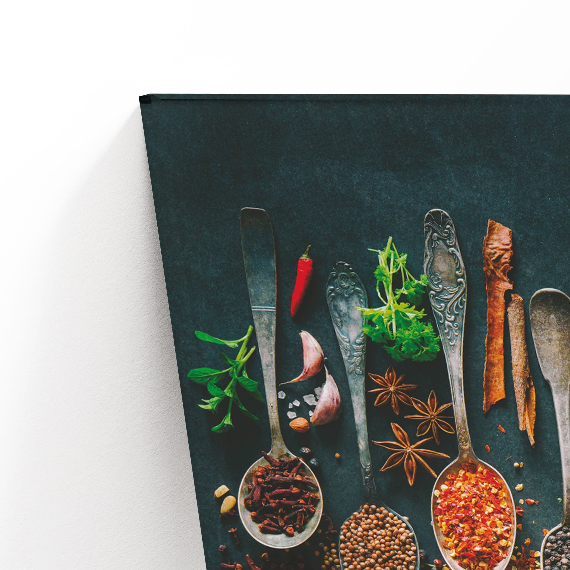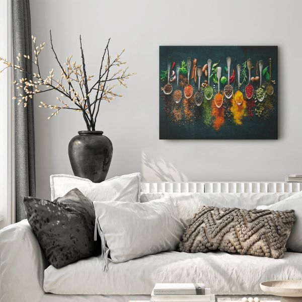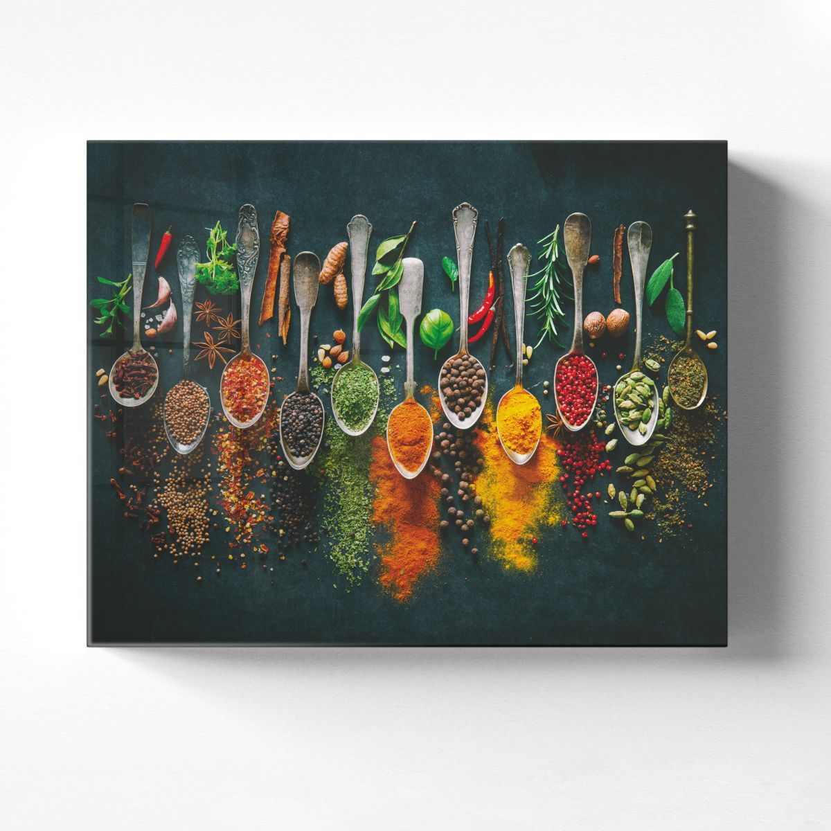 Картина представляет собой яркую и аппетитную композицию из разнообразных специй и пряностей, разложенных в старинных серебряных ложках на тёмном фоне. Ложки — антикварные, с изящным орнаментом, выстроены в ряд, каждая наполнена разными специями. Специи и травы — широкий ассортимент: красный и чёрный перец горошком, куркума, паприка, звёздчатый анис, корица, кардамон, розмарин, сушёный перец чили, свежая зелень (петрушка, базилик), гвоздика, мускатный орех. Цветовая гамма — насыщенная и контрастная: глубокие тёмные оттенки фона подчёркивают яркость специй — от ярко-красного и оранжевого до зелёного и коричневого. Композиция — специи не только в ложках, но и рассыпаны вокруг, создавая ощущение изобилия и динамики. Атмосфера — тёплая, уютная, с кулинарным акцентом, вызывает ассоциации с ароматами восточных базаров и домашней кухни. Картина на стекле подчеркнёт кулинарную тематику, создаст атмосферу уюта и вдохновения для приготовления блюд. Отлично впишется в интерьер в стиле прованс, кантри, лофт или эклектика.