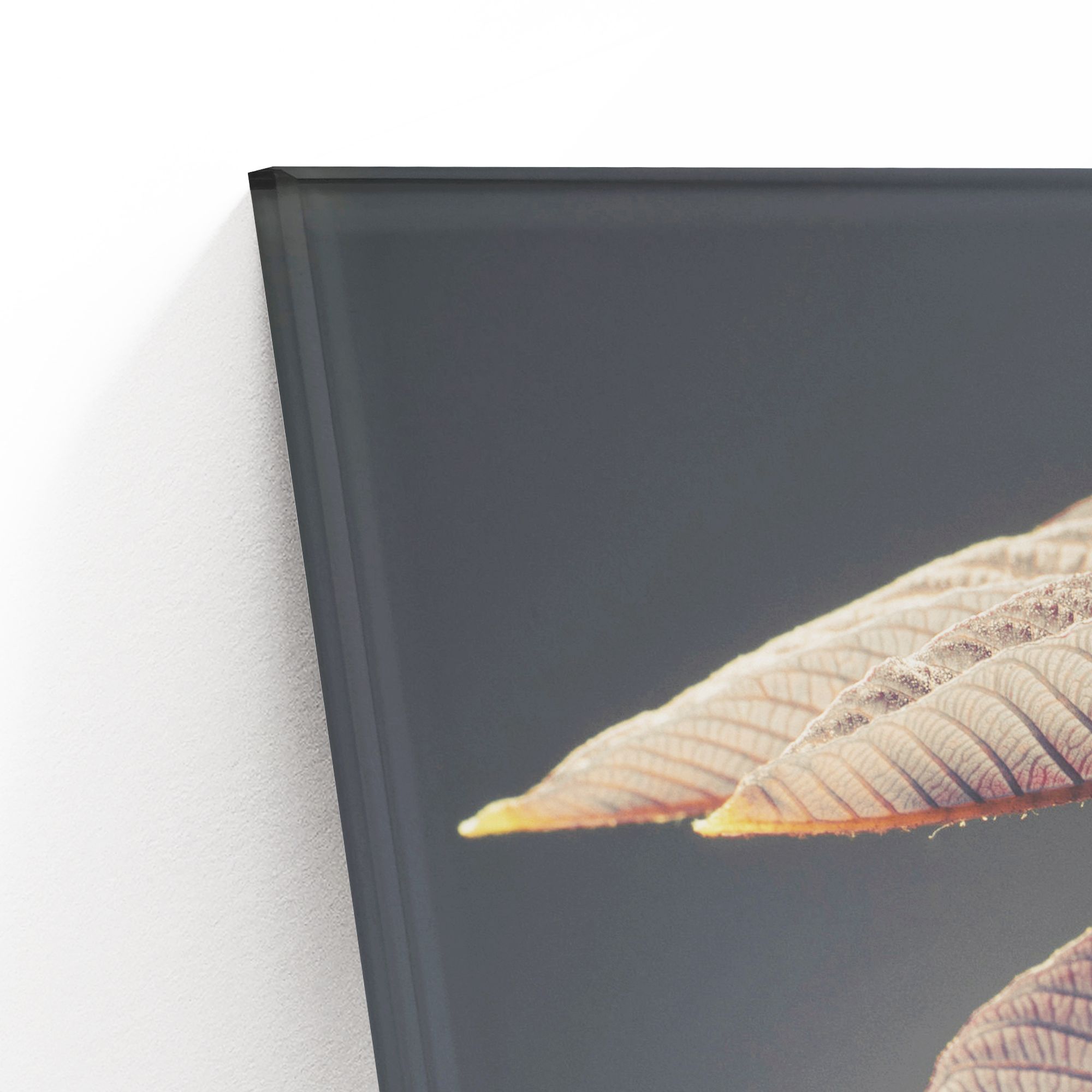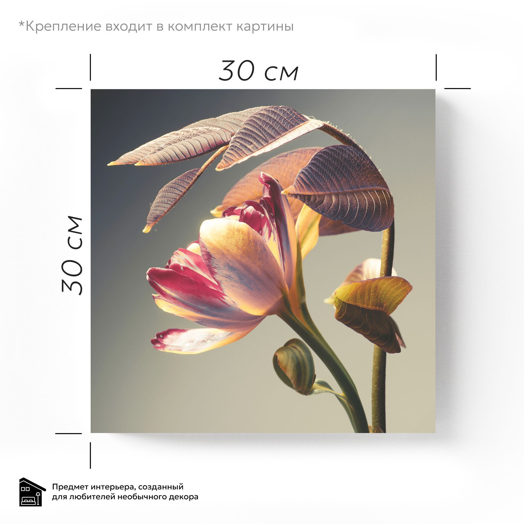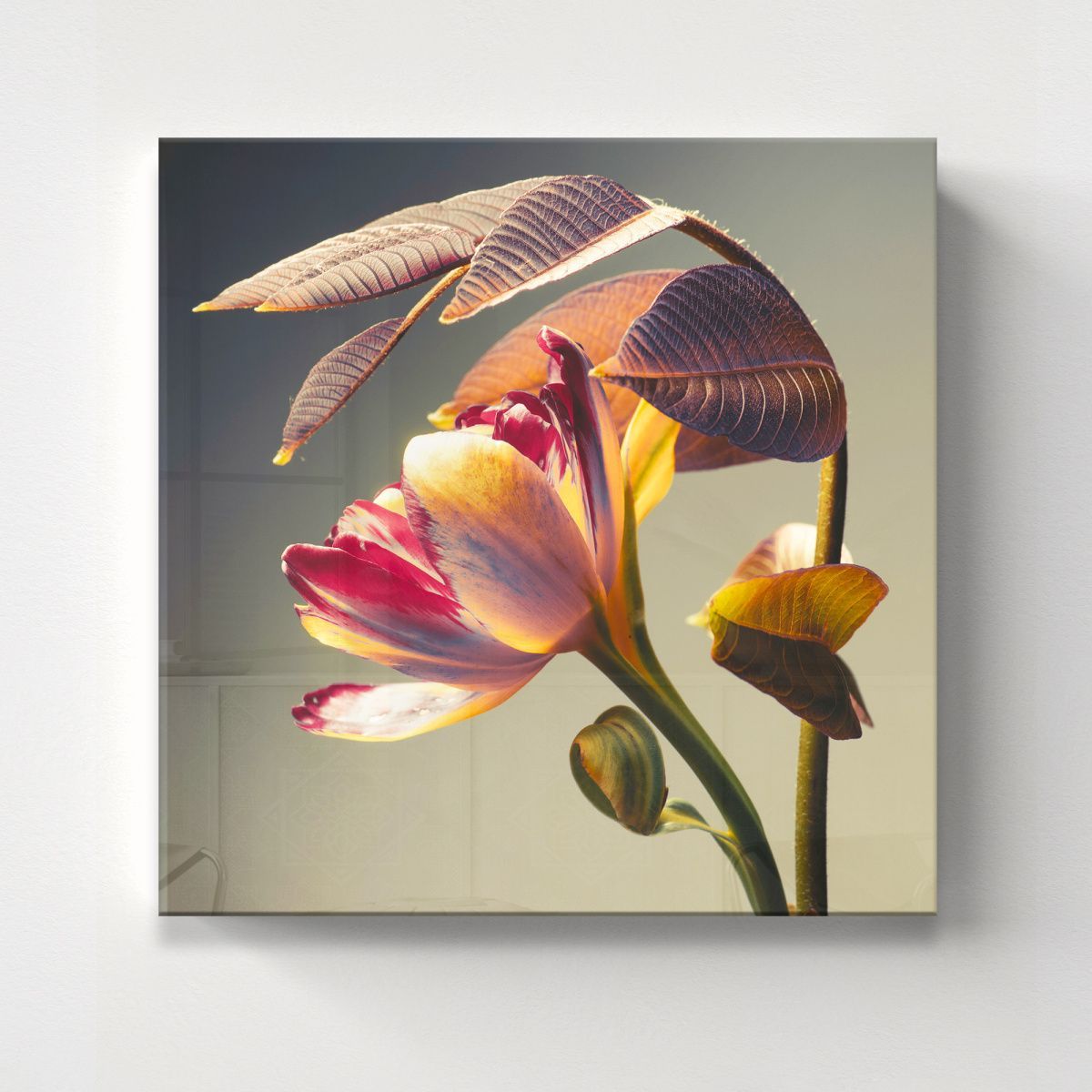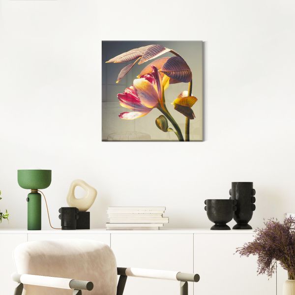 Эта изысканная картина на стекле представляет собой тонкую и элегантную композицию цветка, освещённого мягким, тёплым светом, который подчёркивает его утонченную структуру и деликатные оттенки. Главный акцент сделан на лепестках, которые плавно переходят от нежных кремово-розовых тонов к глубоким пурпурным и бордовым краскам, создавая гармоничный и живой контраст. Особое внимание привлекают крупные текстурные листья с выразительными жилками, обладающие насыщенной коричнево-фиолетовой гаммой. Их изгиб и расположение словно окутывают цветок, придавая всей работе атмосферу защищенности и уюта. Фон картины спокойный и нейтральный, благодаря чему сама флора словно парит на свету, вызывая чувство лёгкости и умиротворения. Картина выполнена с высокой детализацией и мастерством, что делает её великолепным украшением интерьера — она способна привнести в пространство ощущение природы, гармонии и изящества, а за счёт стеклянной основы свет будет играть на поверхности, наполняя изображение живой энергетикой и глубиной.
