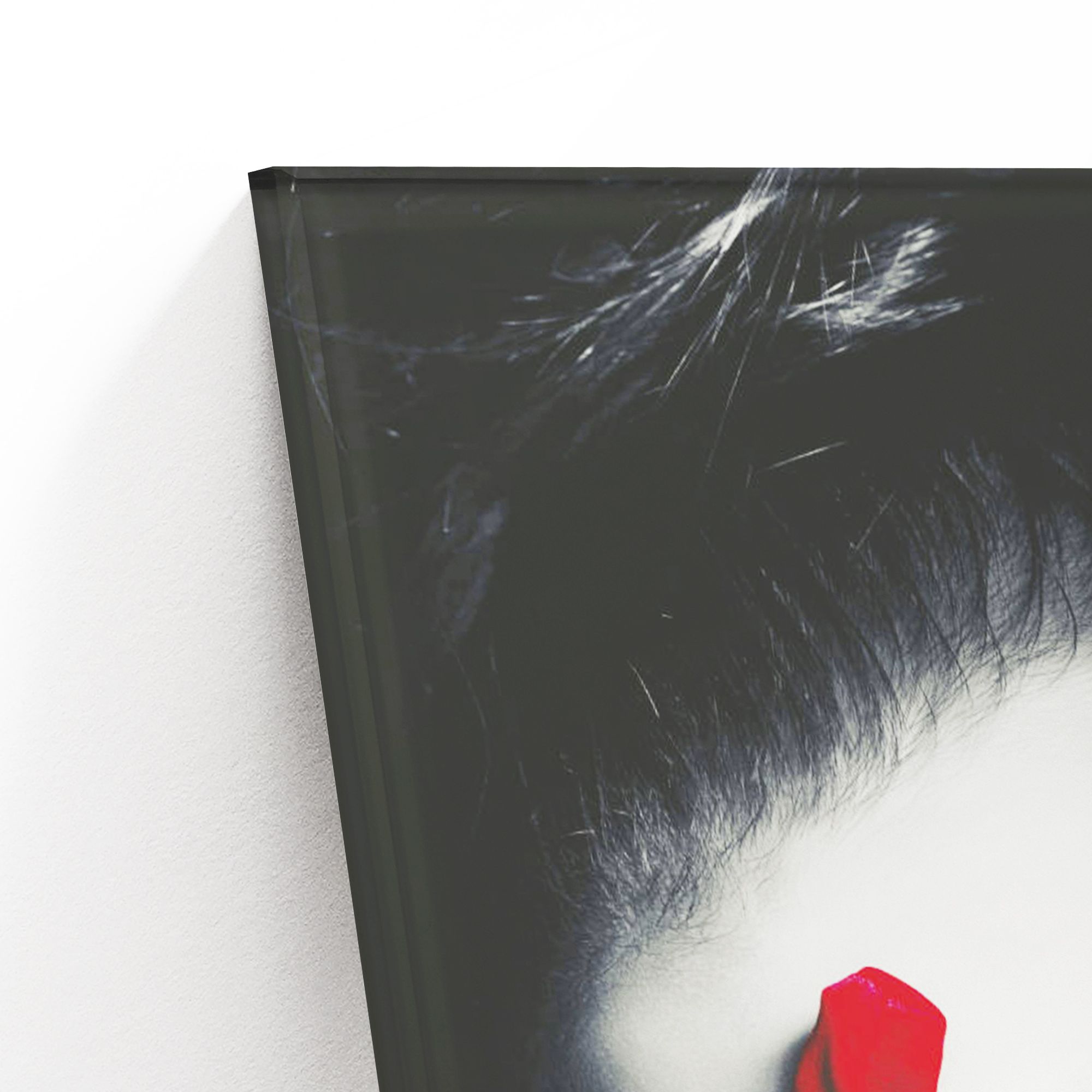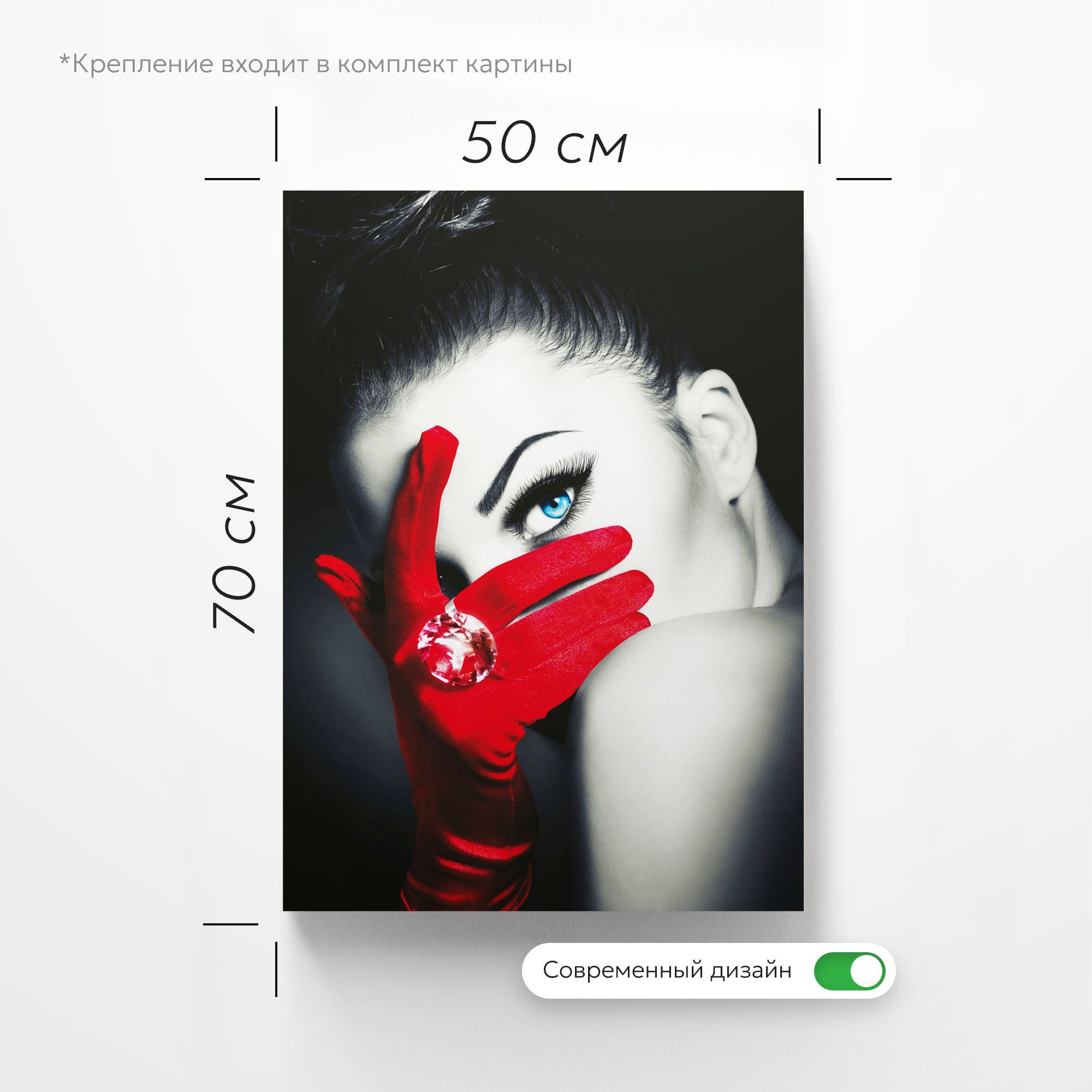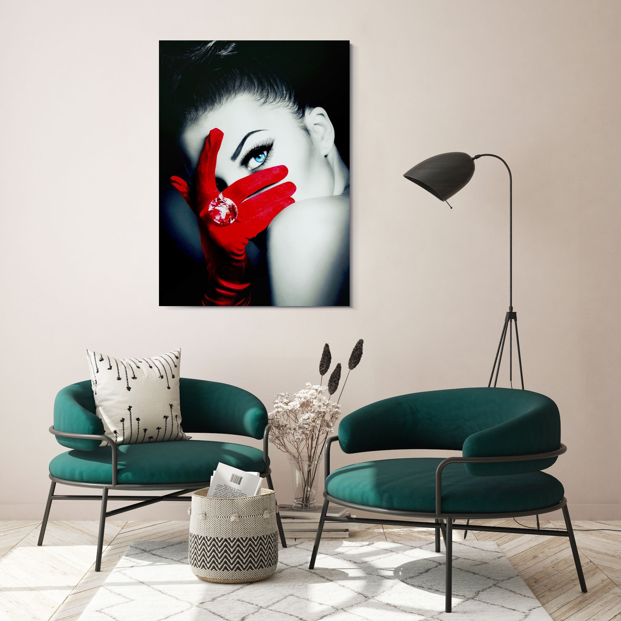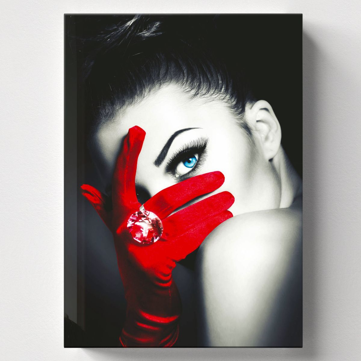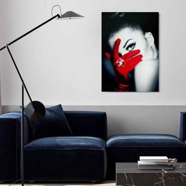 На картине изображён выразительный портрет женщины в гламурном стиле. Центральная фигура — лицо женщины, частично скрытое ярко-красной перчаткой, что создаёт интригу и загадочность. Перчатка — насыщенного красного цвета, занимает центральное место в композиции. На перчатке красуется крупный сверкающий драгоценный камень, который притягивает взгляд и добавляет роскоши. Взгляд модели — пронзительный, с ярко-голубыми глазами, подчёркнутыми выразительным макияжем (аккуратные брови, длинные ресницы). Взгляд направлен прямо на зрителя, создаёт ощущение диалога. Композиция асимметрична, динамична: поза модели и положение перчатки создают ощущение движения, лёгкости. Эффект стекла придаёт изображению дополнительную глубину, лёгкую полупрозрачность и интересные блики при разном освещении. Общее настроение — роскошь, загадочность, элегантность, лёгкая театральность. Картина напоминает кадры из модных фотосессий или голливудских фильмов. Картина на стекле станет эффектным акцентом в современном или арт-деко интерьере, подчеркнёт стиль и индивидуальность хозяев.
