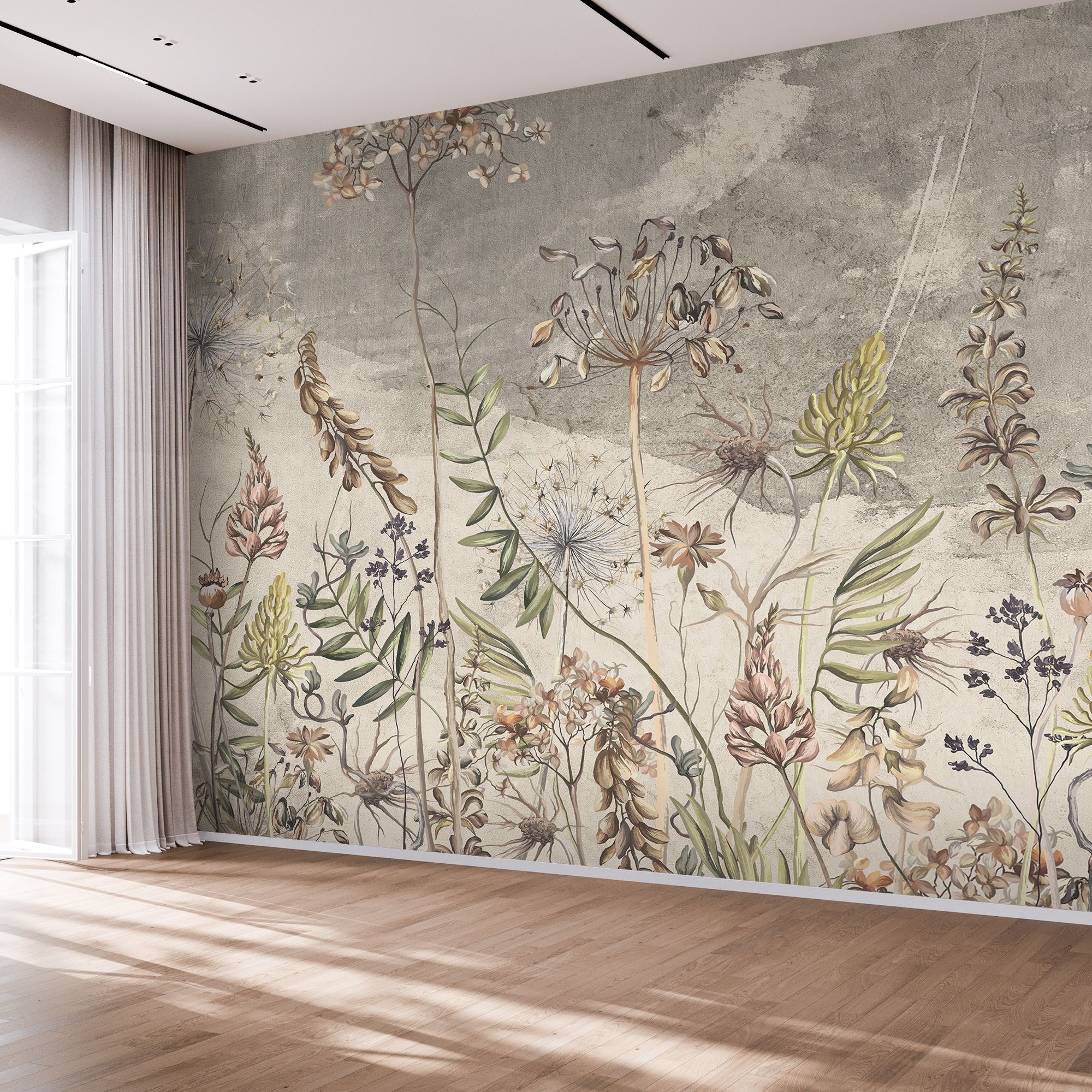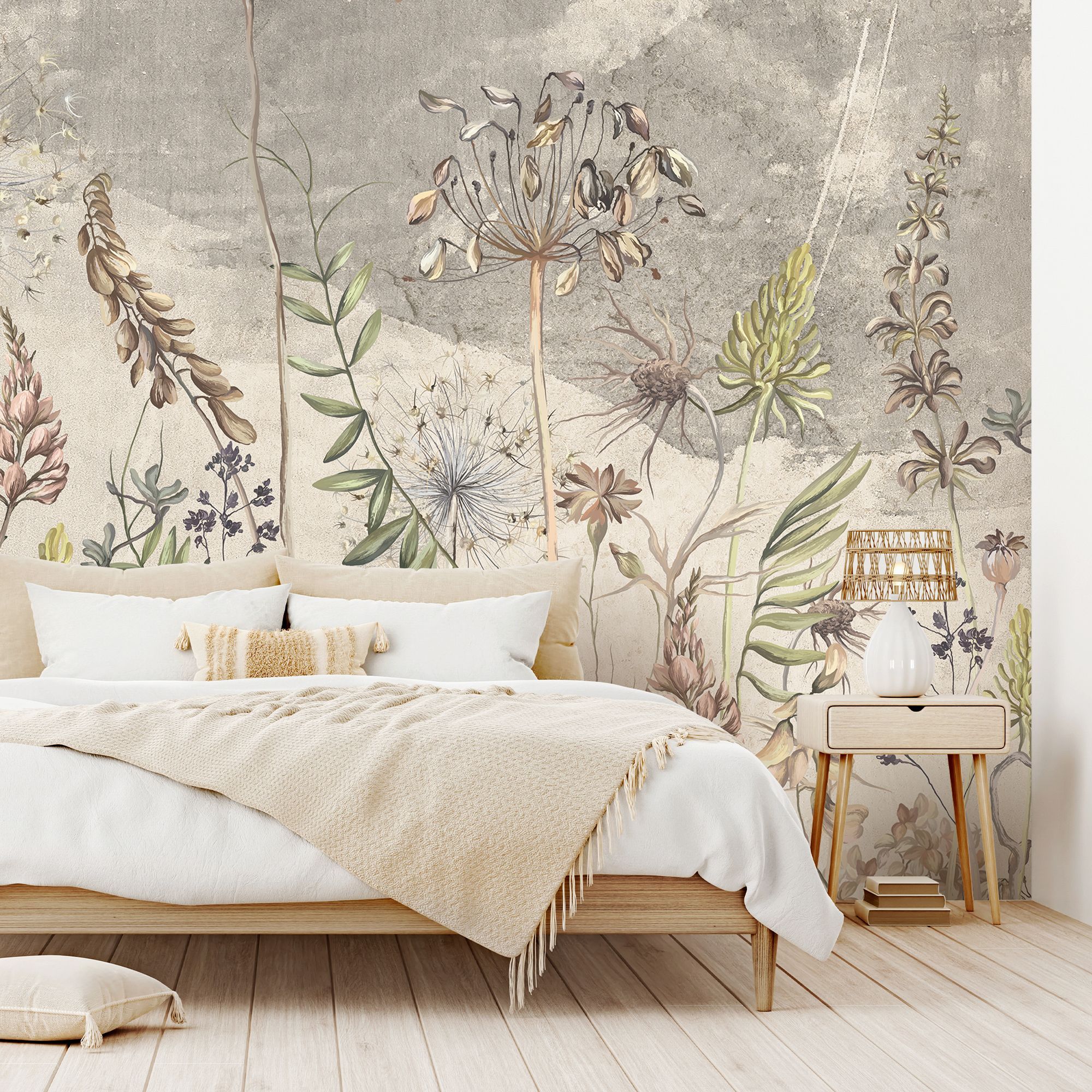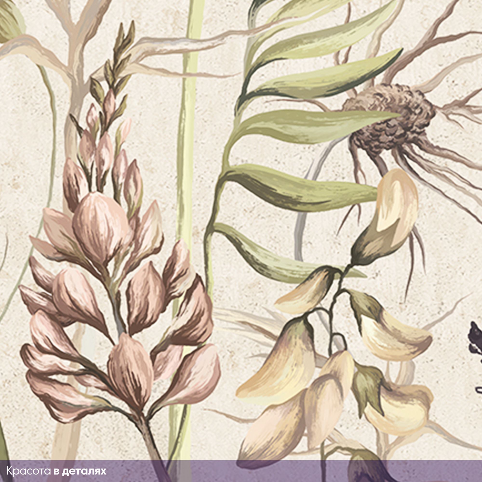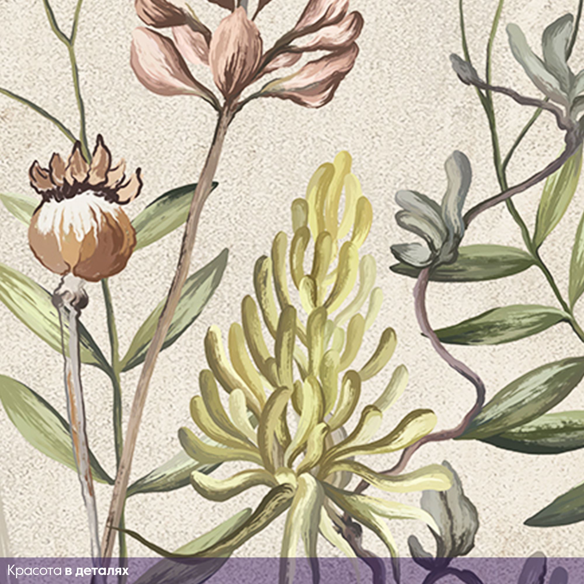Эти фотообои — настоящий шедевр ботанической живописи, способный превратить обычную стену в окно в мир природы. Изящная композиция с полевыми цветами и травами выполнена в утончённой, слегка приглушённой гамме, создающей атмосферу спокойствия и умиротворения. Преобладают пастельные оттенки бежевого, зелёного, серо-голубого и приглушённого розового. Такая гамма не перегружает пространство, а наполняет его светом и природной гармонией. Текстурированный серо-бежевый фон с лёгкими акварельными разводами напоминает старинную гравюру или страницу гербария, добавляя композиции винтажности и глубины. Растения расположены без строгой симметрии, словно запечатлены в момент лёгкого ветерка — это придаёт дизайну динамику и живость. Детализация: тонкие прожилки на листьях, пушистые головки семян, изящные изгибы стеблей выполнены с удивительной тщательностью — хочется рассматривать каждую деталь. Стили, с которыми сочетаются: эко-стиль, скандинавский стиль, прованс, бохо, современный минимализм.