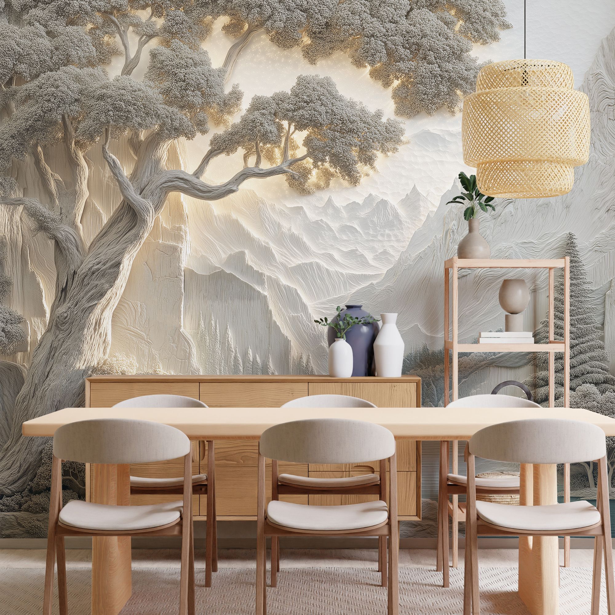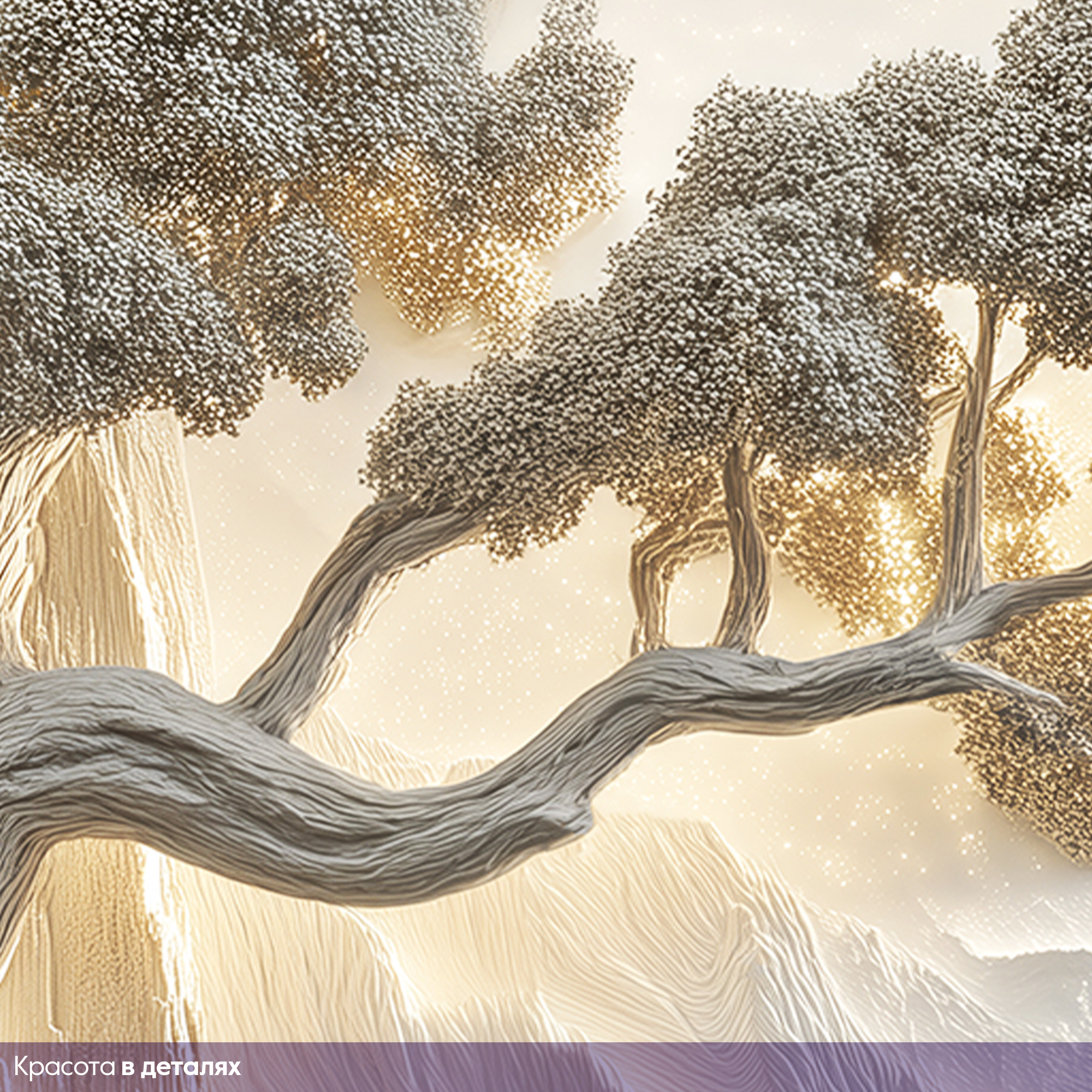Эти фотообои — истинное воплощение природной гармонии и величия, выполненное в изысканной стилистике барельефа. На них запечатлён завораживающий горный пейзаж: величественные хребты, словно вырезанные из мрамора, плавно уходят вдаль, обрамлённые густыми лесами. На переднем плане раскинулось спокойное озеро, отражающее мягкие оттенки окружающего ландшафта. Особое очарование композиции придают массивные деревья с изогнутыми стволами и пышной кроной, словно сошедшие со страниц восточной живописи. Объёмность и рельефность — изображение имитирует трёхмерный барельеф, создавая иллюзию глубины и текстуры, будто стены комнаты становятся частью природного пейзажа. Нежная цветовая гамма — преобладают пастельные бежево-серые тона с лёгкими акцентами голубого в озере, что создаёт атмосферу умиротворения и лёгкости. Детализированная прорисовка — каждая ветка, складка гор и рябь на воде прорисованы с удивительной тщательностью, придавая обоям художественную ценность. Баланс между суровостью и нежностью — сочетание мощных горных массивов и изящных деревьев создаёт гармоничный контраст. Эффект мягкого освещения — световые блики на горах и листве добавляют реалистичности и глубины. Эти фотообои перенесут вас в мир первозданной красоты, наполнят дом атмосферой спокойствия и величия природы. Идеальный выбор для ценителей эстетики, гармонии и утончённого дизайна!