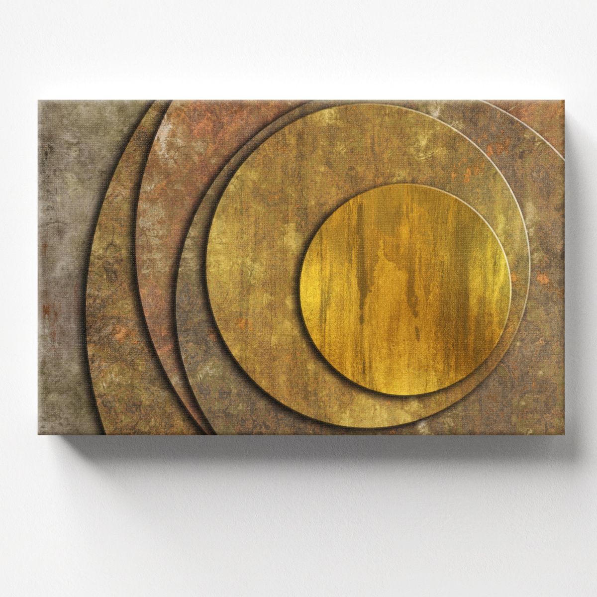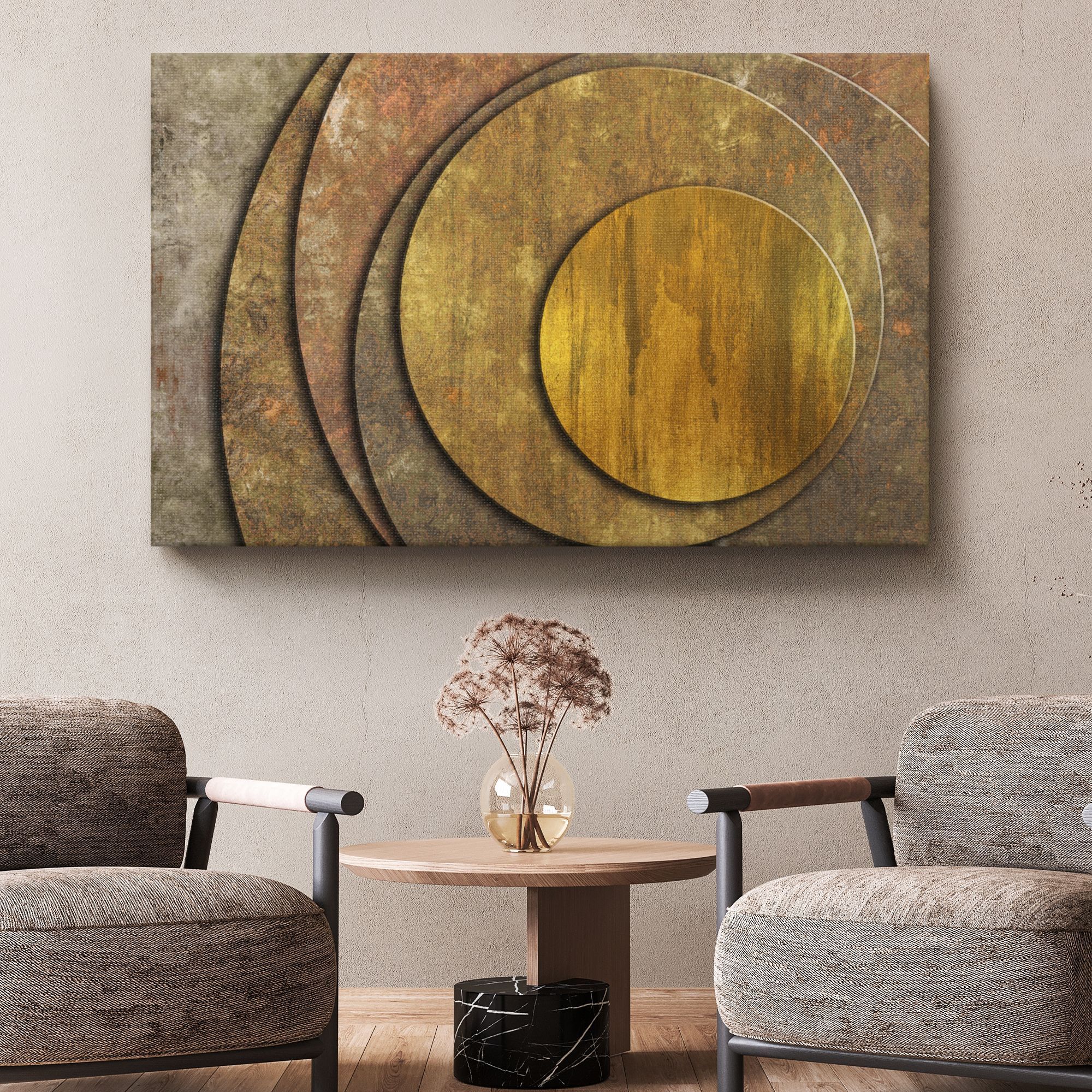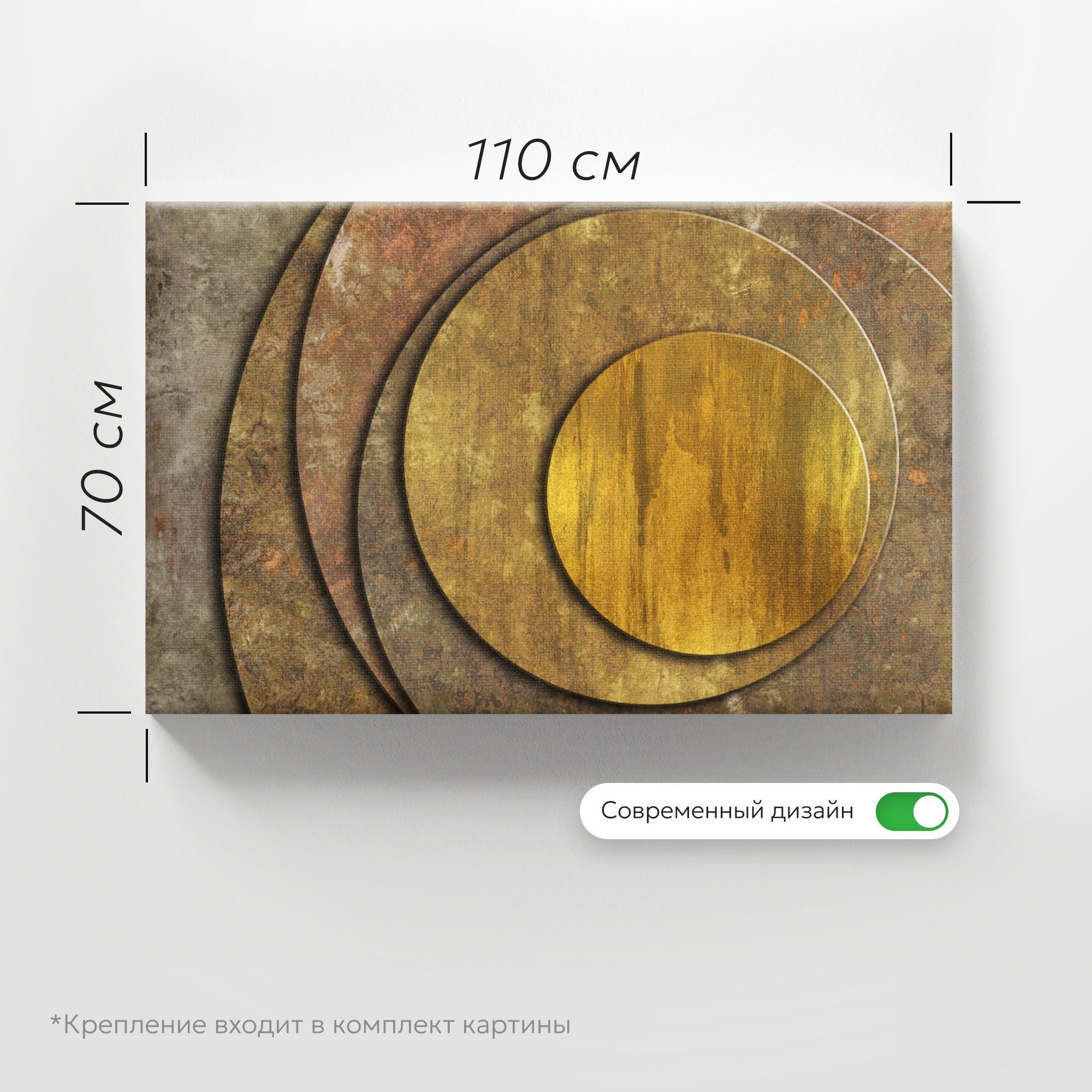 Картина представляет собой абстрактную композицию с изображением нескольких концентрических кругов, плавно переходящих друг в друга. Основной мотив — геометрическая строгость, смягчённая текстурой, напоминающей состаренный металл или патину. Цветовая гамма выдержана в тёплых, приглушённых тонах: преобладают золотисто-бронзовые, ржаво-коричневые и серо-зелёные оттенки. Поверхность кругов выглядит слегка шероховатой, с эффектом потёртости, что придаёт работе характер «индустриального шика». Композиция лаконична, без лишних деталей — акцент на игре форм и фактур. Идеально впишется в интерьер лофт благодаря «металлическому» эффекту и приглушённой цветовой палитре. Станет выразительным акцентом на кирпичной или бетонной стене.