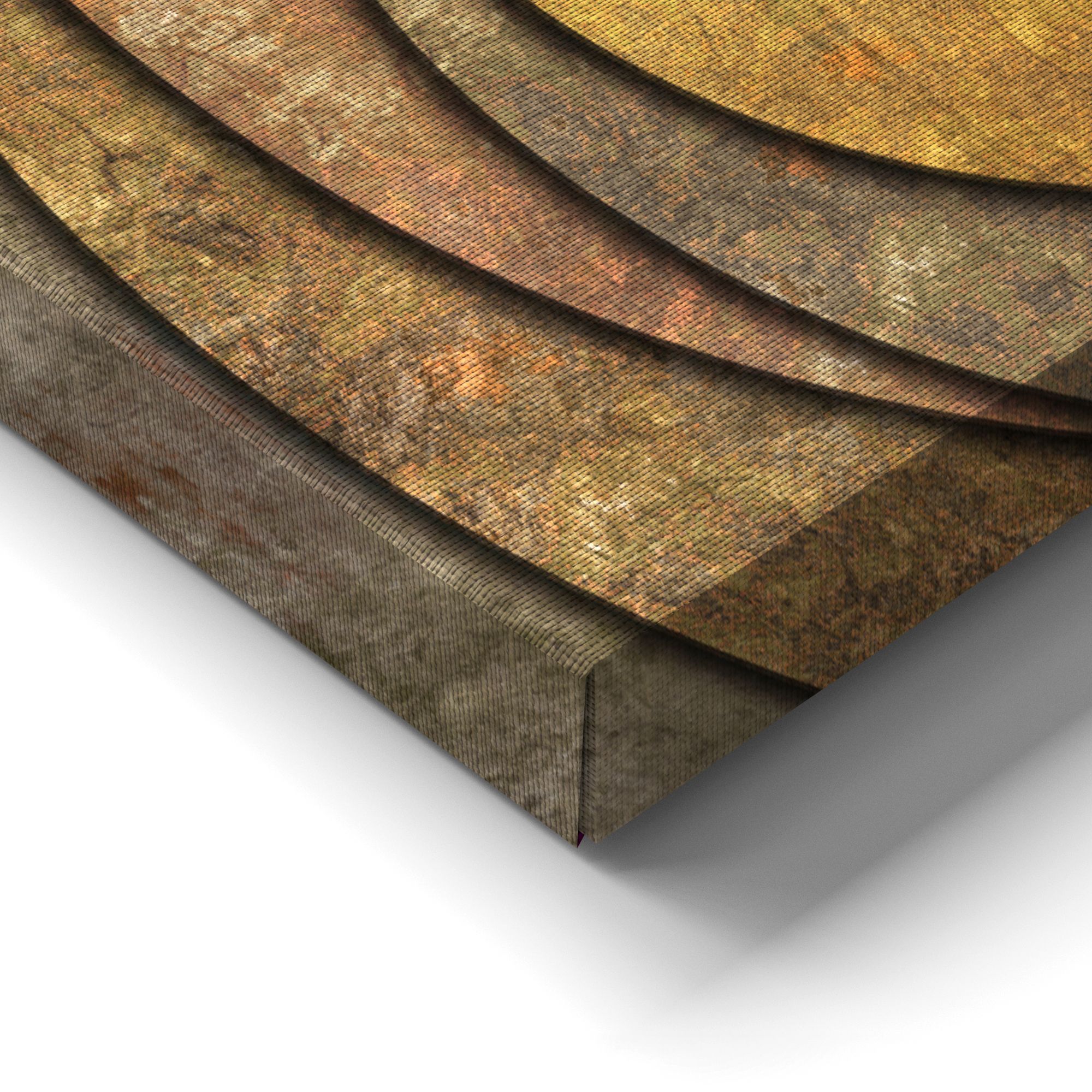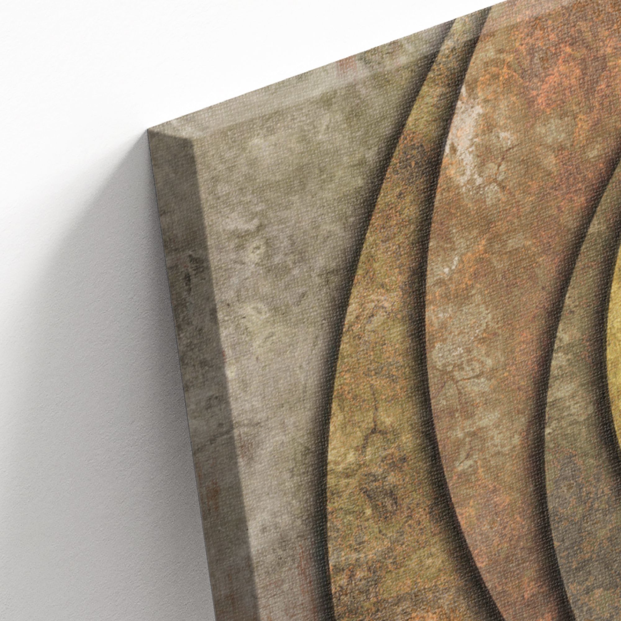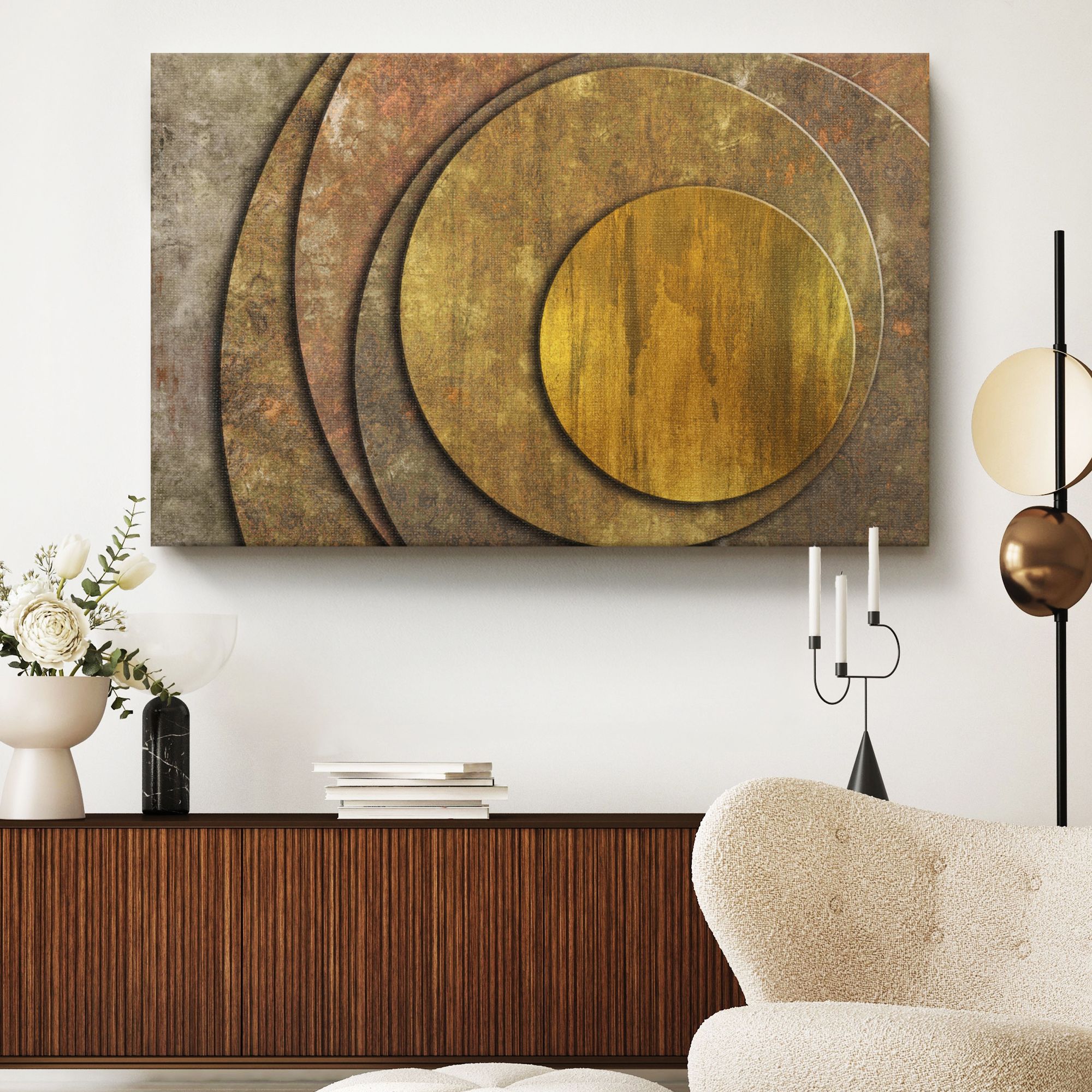 Картина представляет собой абстрактную композицию с изображением нескольких концентрических кругов, плавно переходящих друг в друга. Основной мотив — геометрическая строгость, смягчённая текстурой, напоминающей состаренный металл или патину. Цветовая гамма выдержана в тёплых, приглушённых тонах: преобладают золотисто-бронзовые, ржаво-коричневые и серо-зелёные оттенки. Поверхность кругов выглядит слегка шероховатой, с эффектом потёртости, что придаёт работе характер «индустриального шика». Композиция лаконична, без лишних деталей — акцент на игре форм и фактур. Идеально впишется в интерьер лофт благодаря «металлическому» эффекту и приглушённой цветовой палитре. Станет выразительным акцентом на кирпичной или бетонной стене.